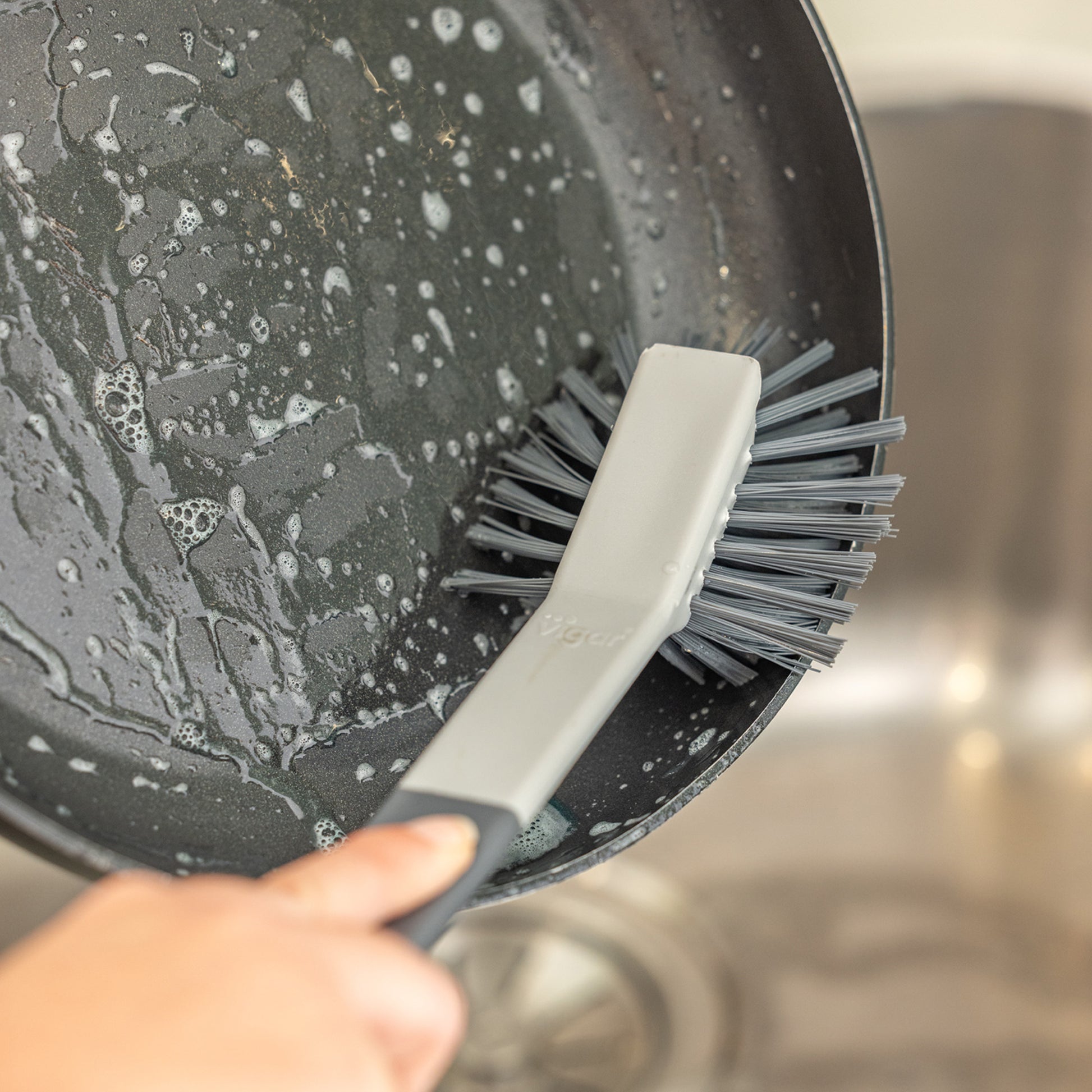 - The dish brush includes an integrated scraper that effortlessly removes the most stubborn residues.