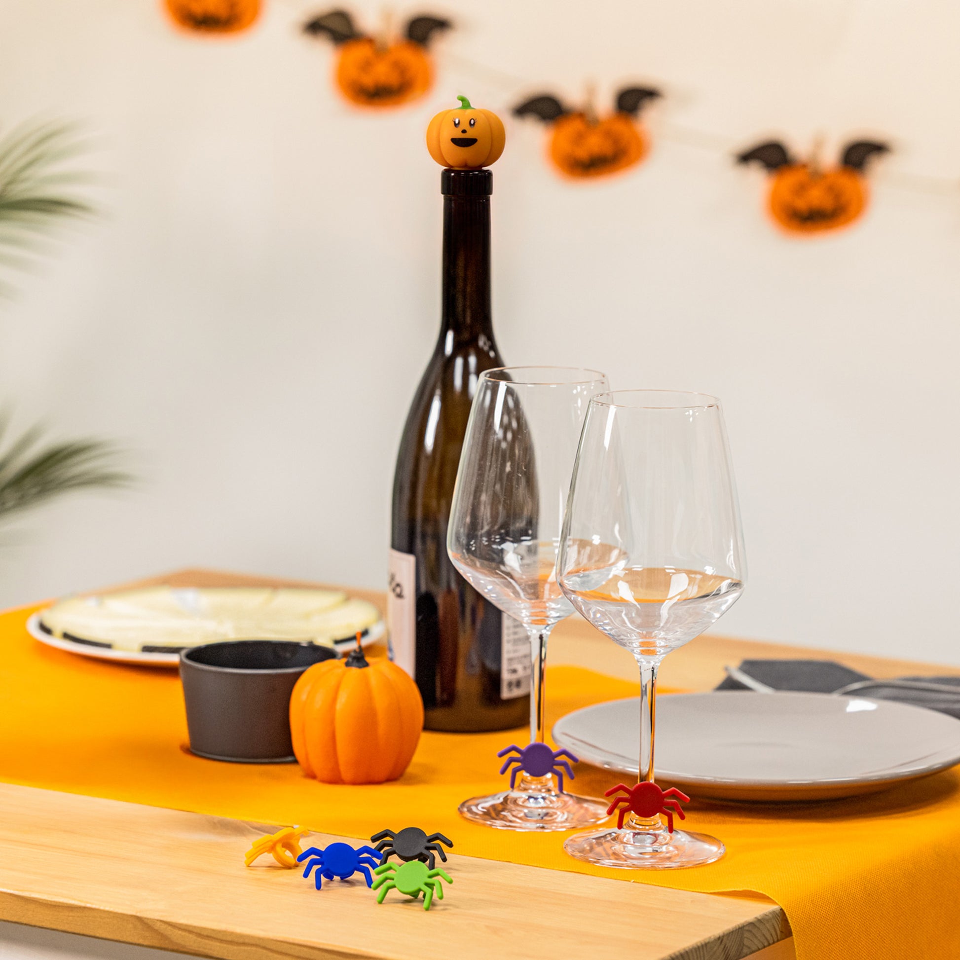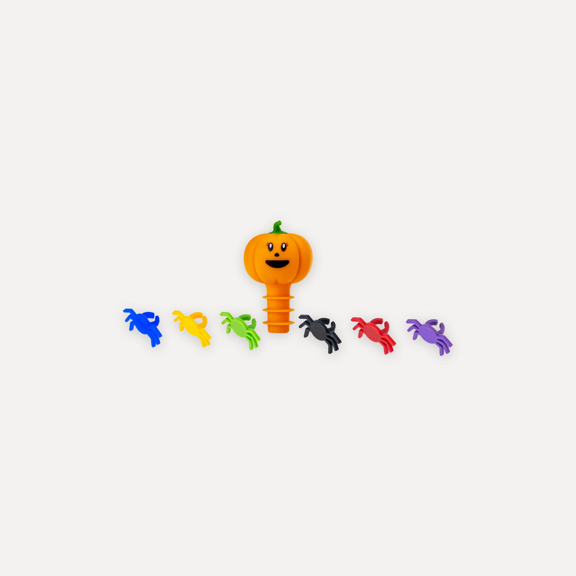 The pumpkin stopper, made of silicone, easily fits wine or soda bottles, keeping their contents fresh. The six spider-designed wine glass markers allow each guest to quickly and funnily identify their glass. Reusable and easy to clean, this set is the ideal complement for your Halloween party.