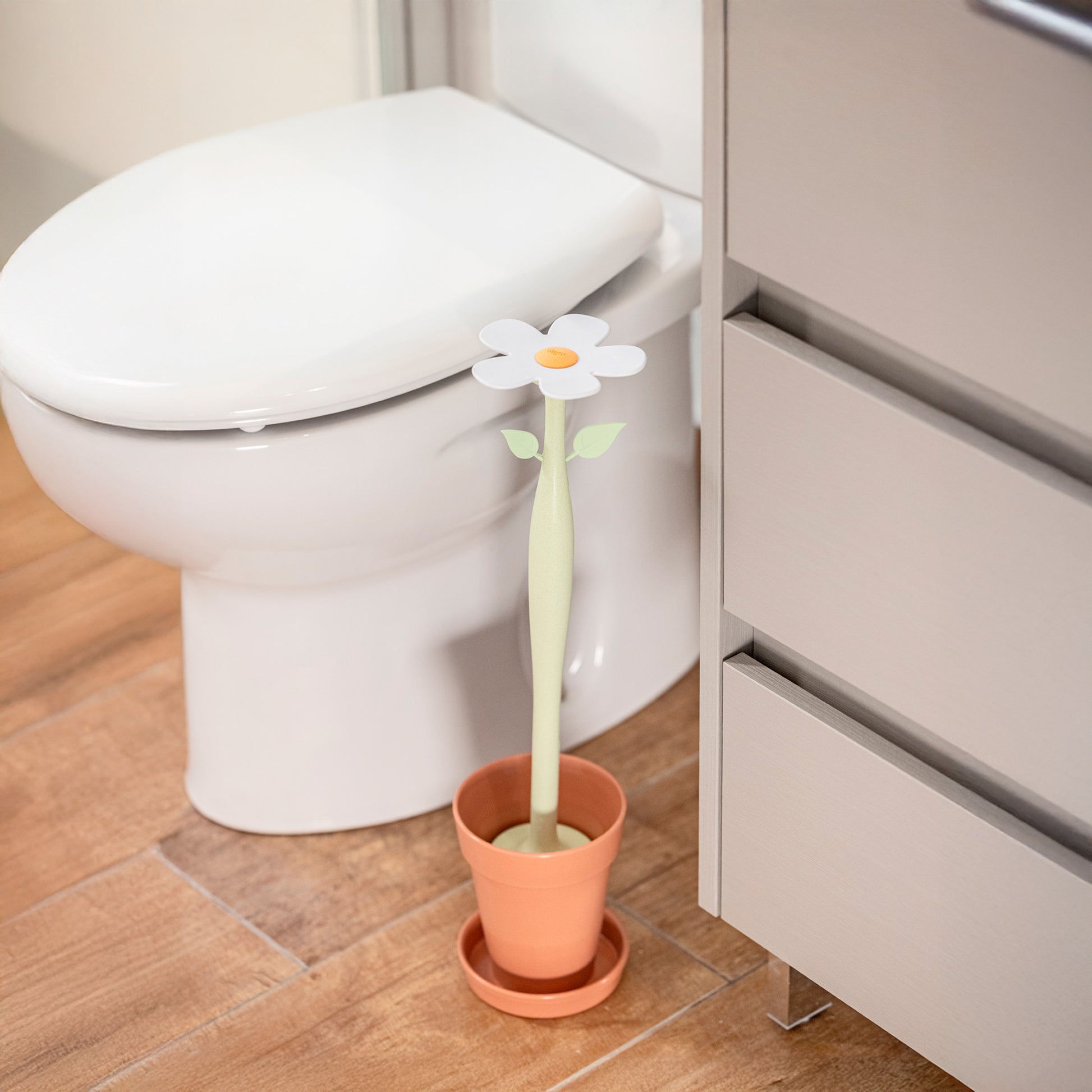 - Set composed of a brush and brush holder with a flower-shaped design, ideal for brightening up the least attractive corner of the home.