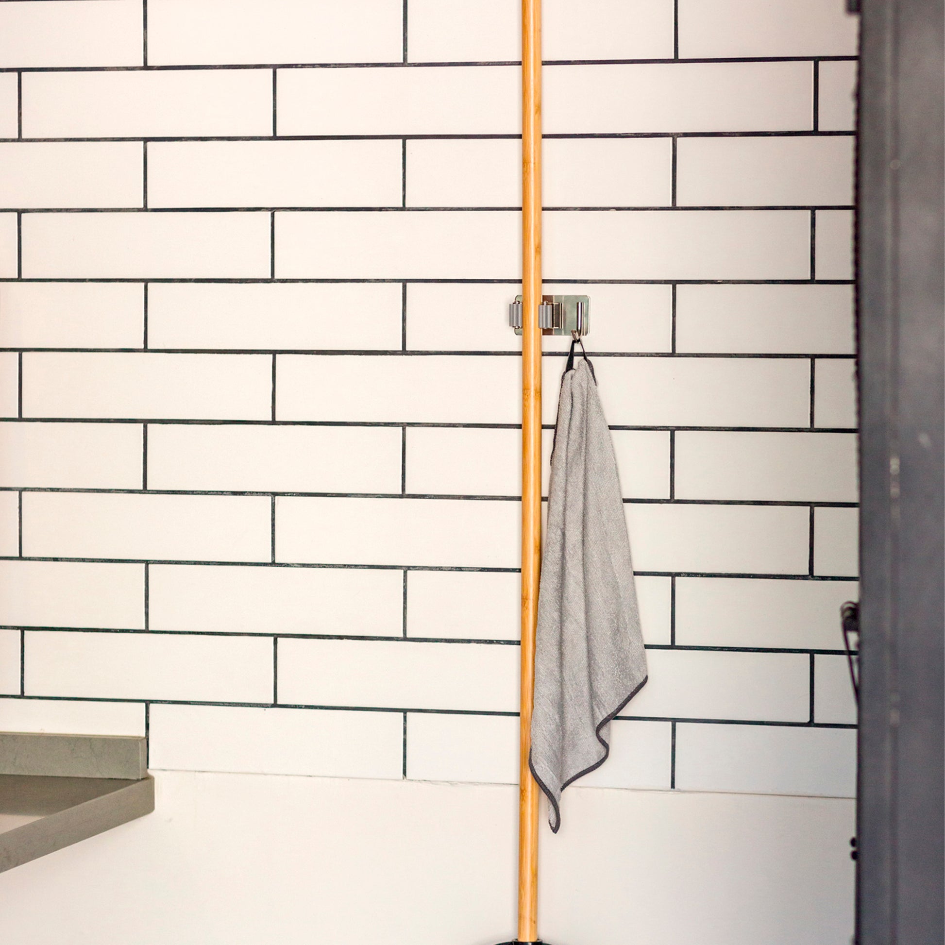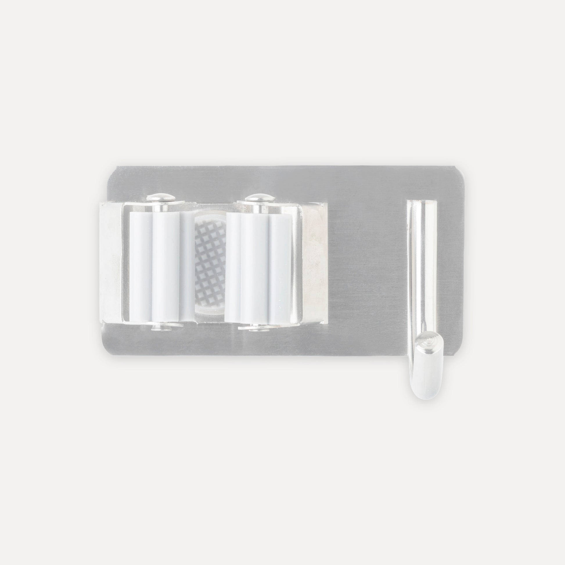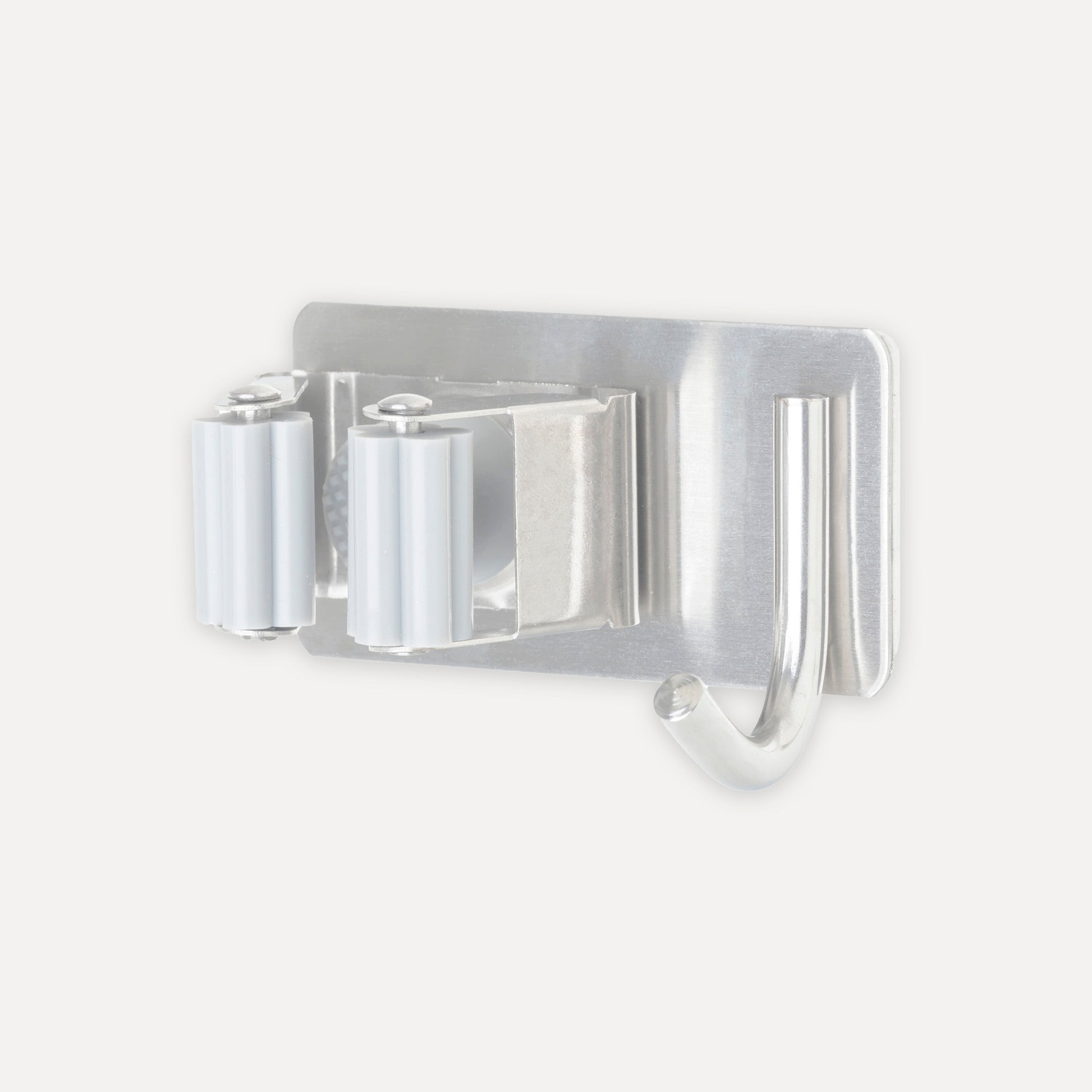 - Holds metal brooms with 3M adhesive, equipped with a non-slip clip for a firm grip.