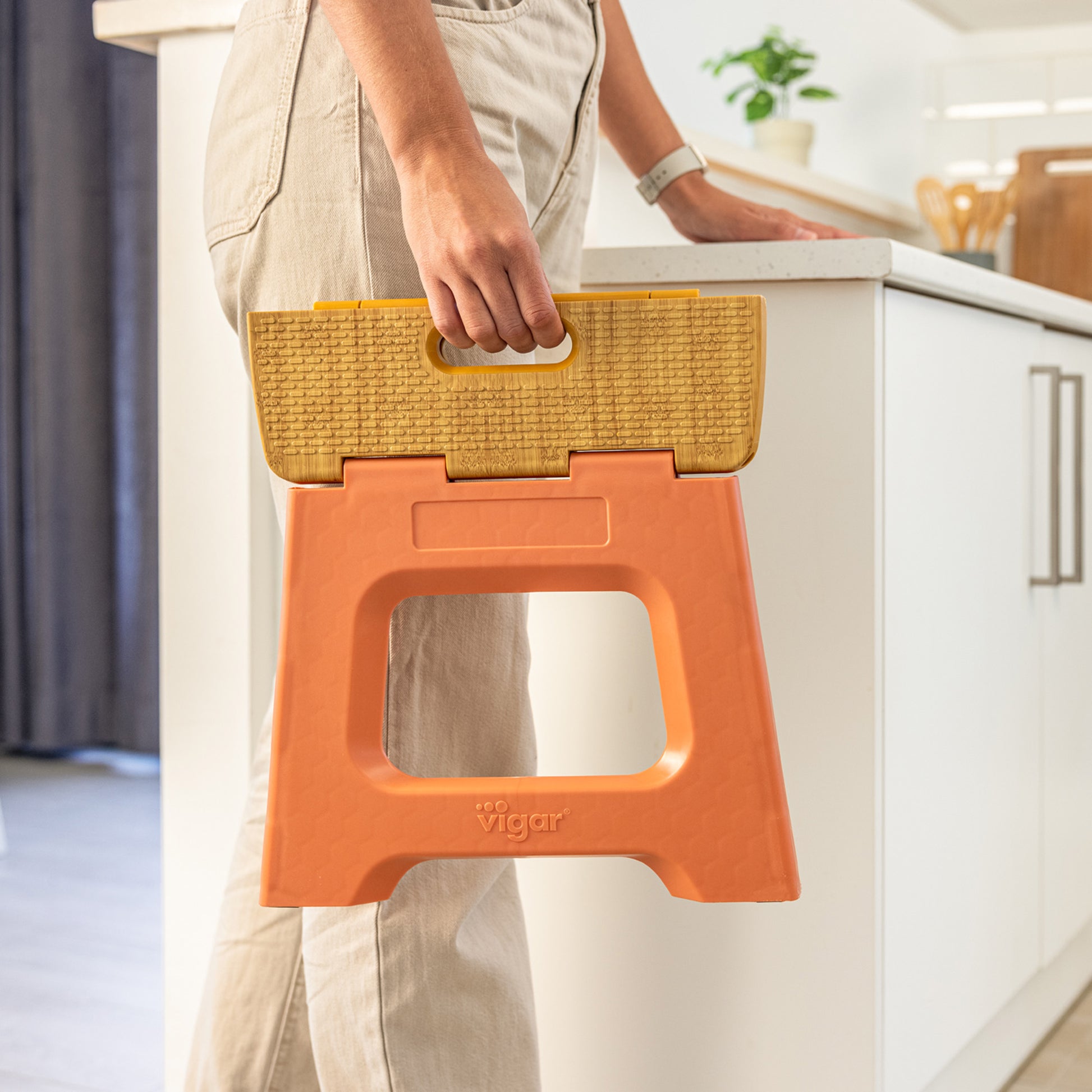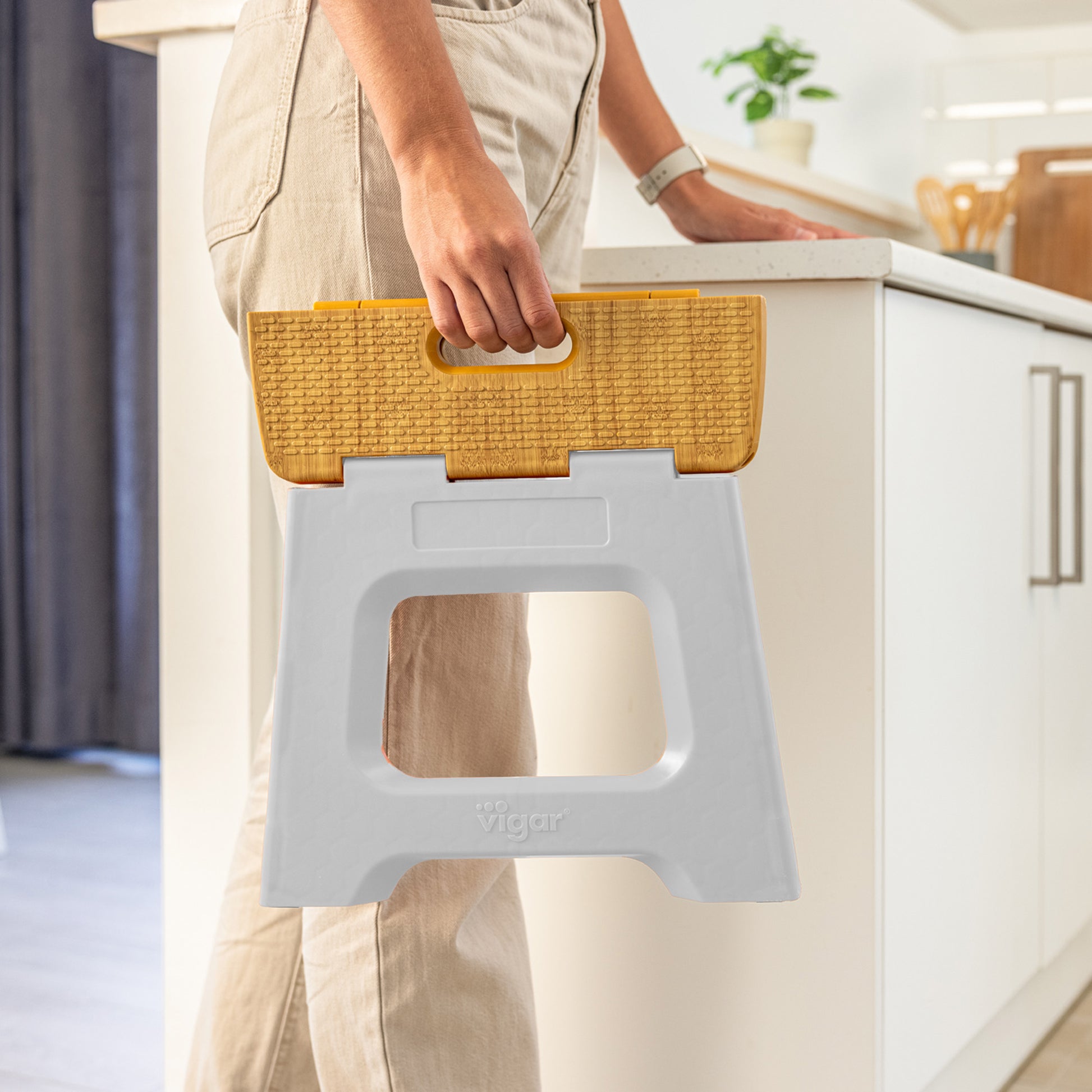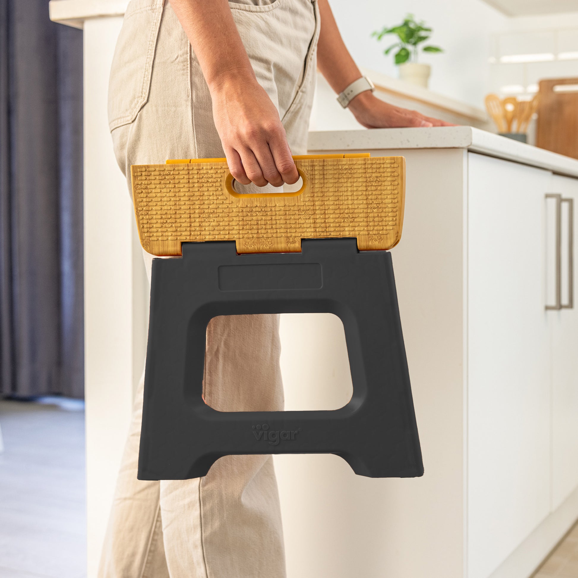 - Folds and unfolds with a simple gesture, practical for reaching small heights in the house.