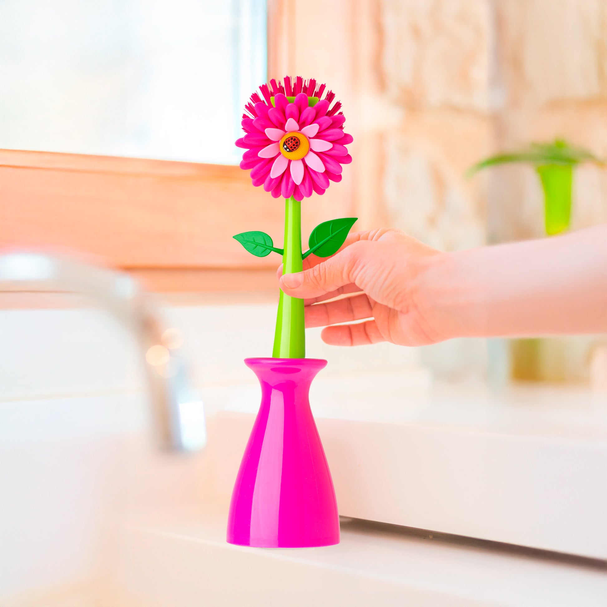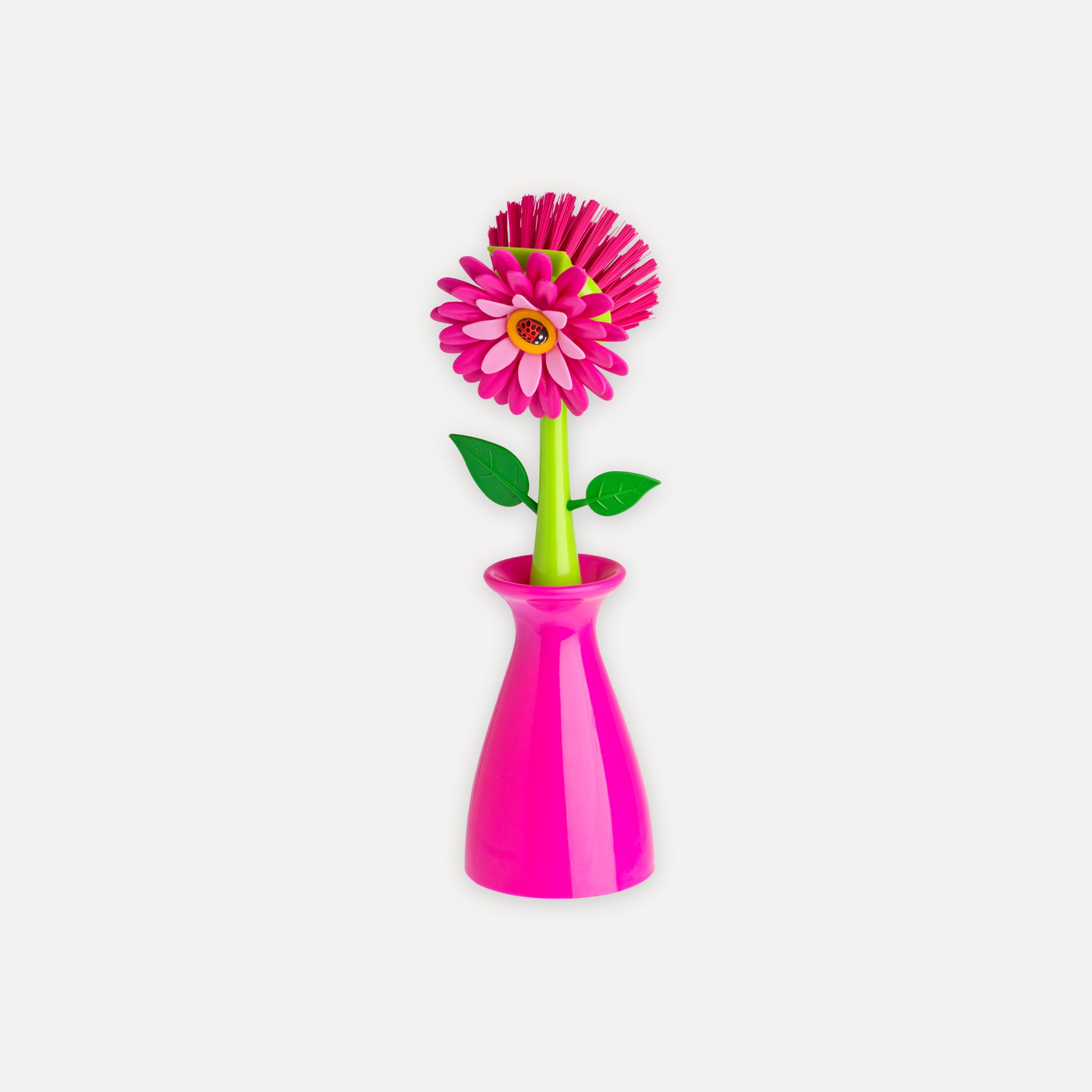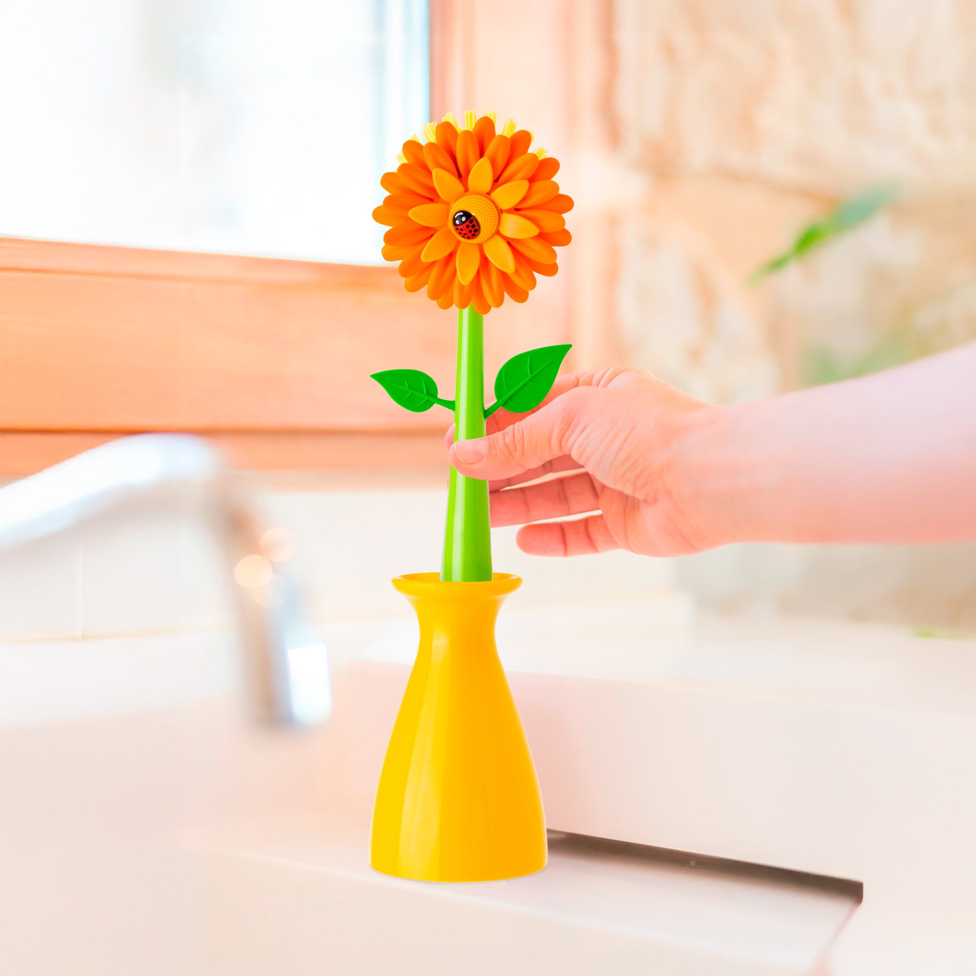 Équipée de poils résistants pour un nettoyage en profondeur, la brosse est conçue pour être ergonomique et facile à utiliser. Le vase qui l'accompagne sert de support, maintenant la brosse organisée et prête à l'emploi. Sa couleur vibrante ajoute une touche joyeuse et dynamique à toute cuisine.