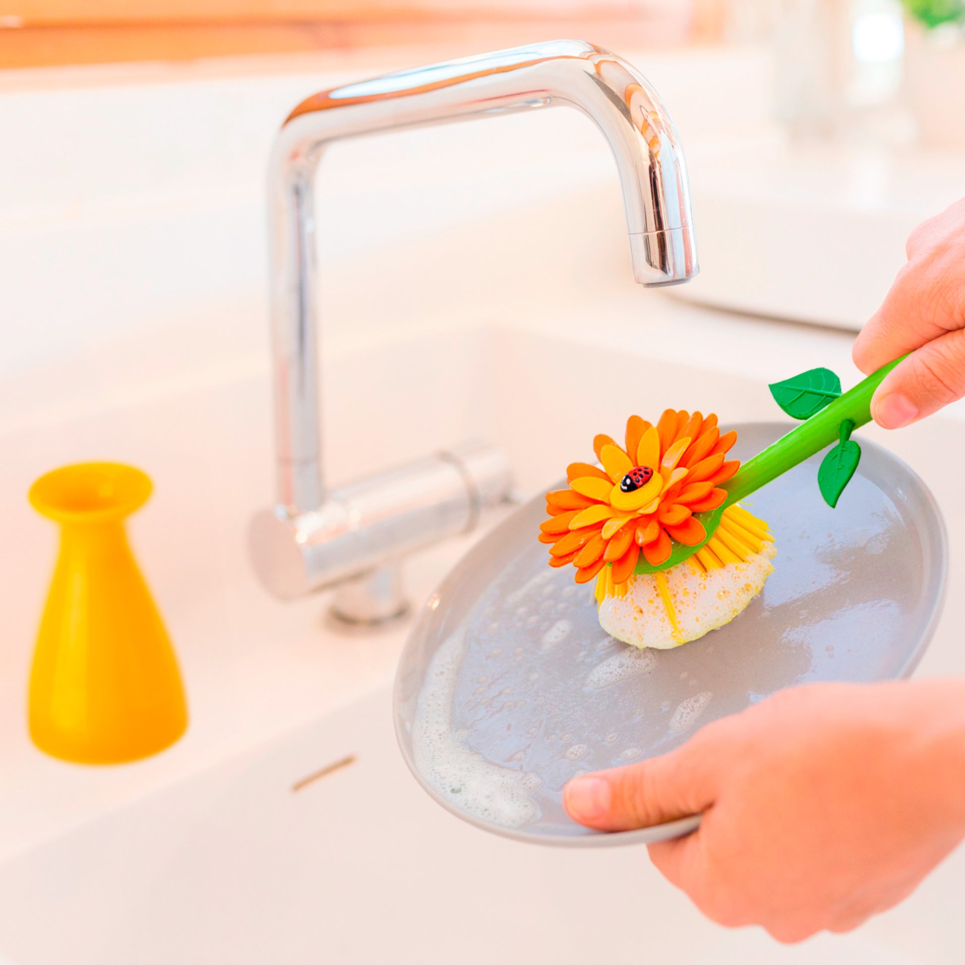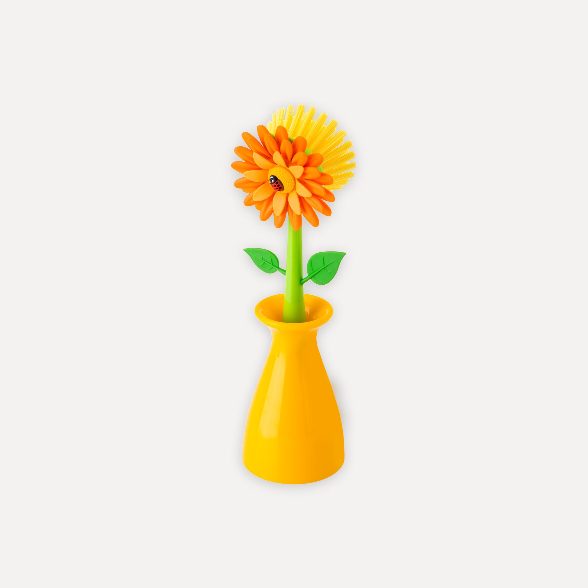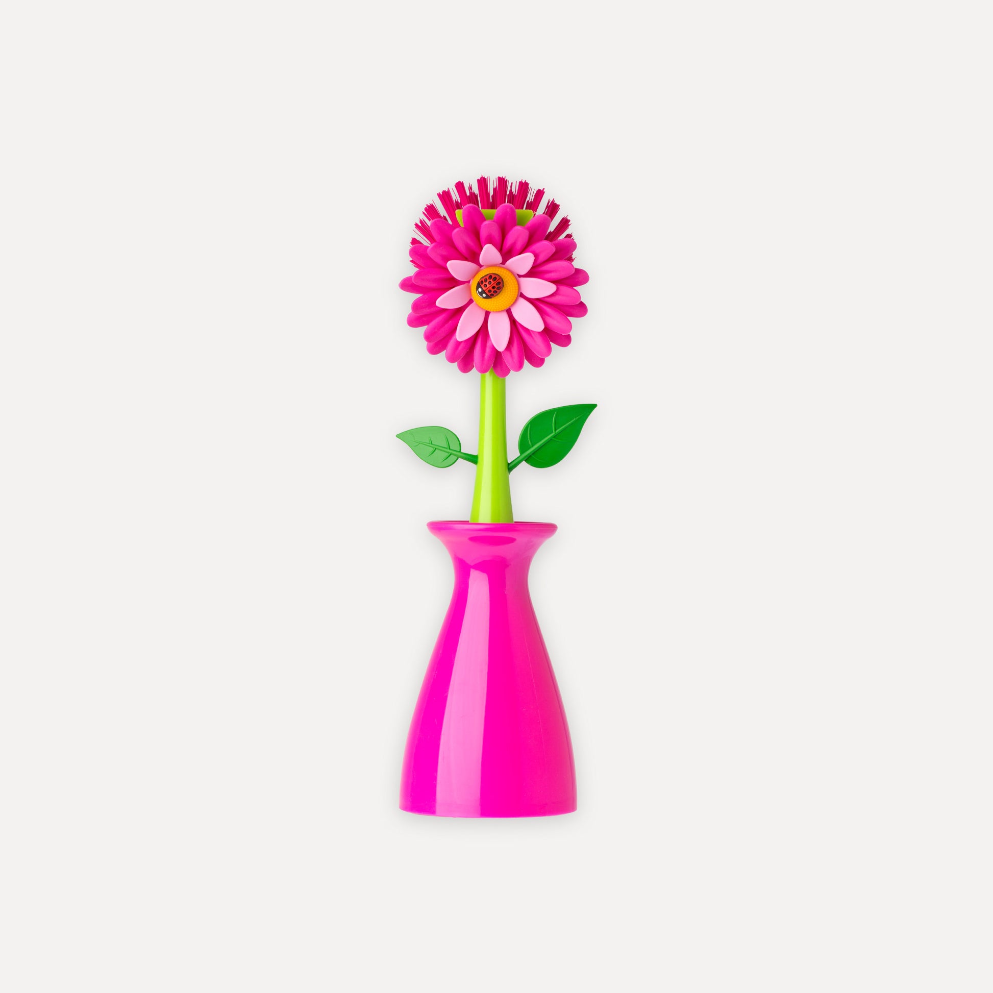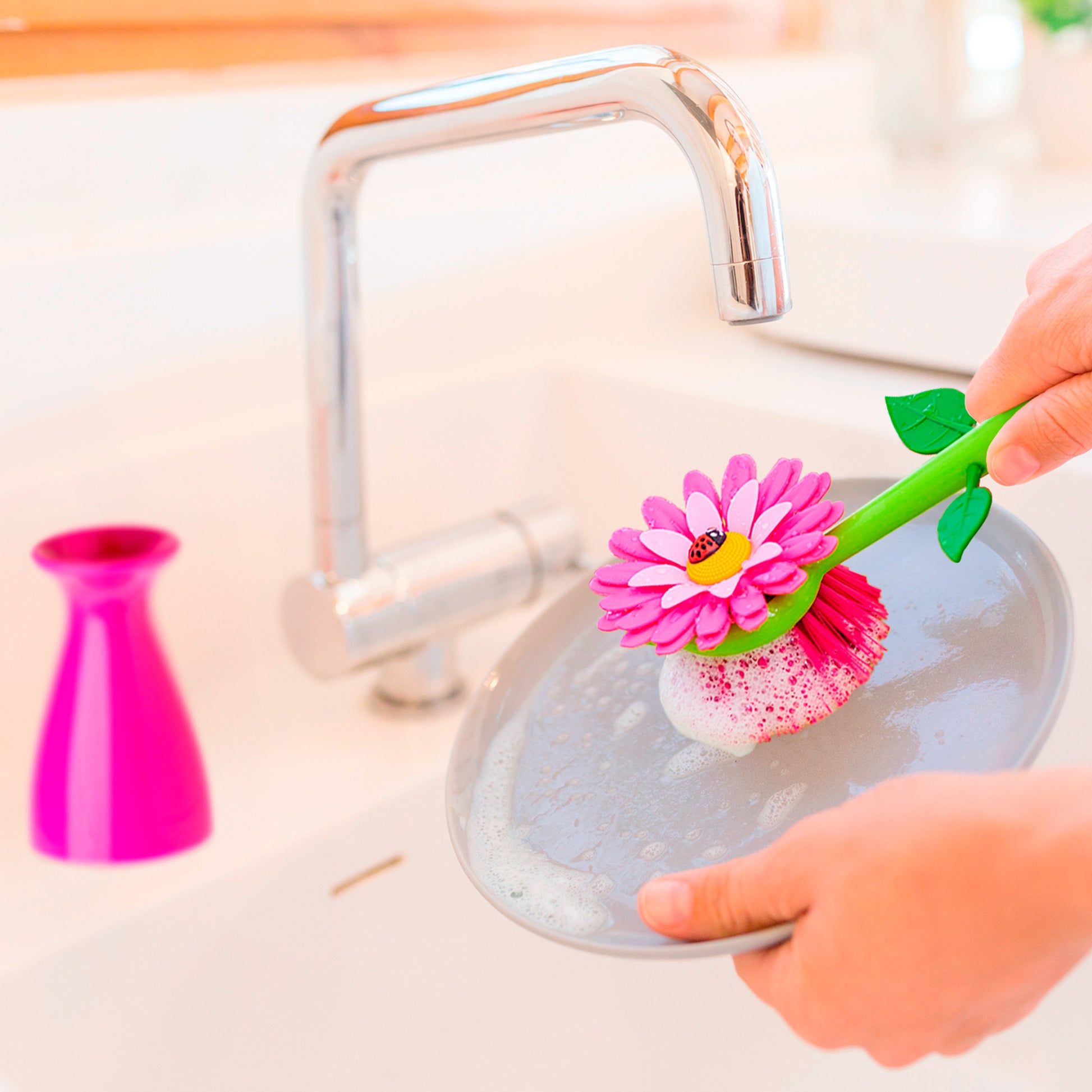 Équipée de poils résistants pour un nettoyage en profondeur, la brosse est conçue pour être ergonomique et facile à utiliser. Le vase qui l'accompagne sert de support, maintenant la brosse organisée et prête à l'emploi. Sa couleur vibrante ajoute une touche joyeuse et dynamique à toute cuisine.