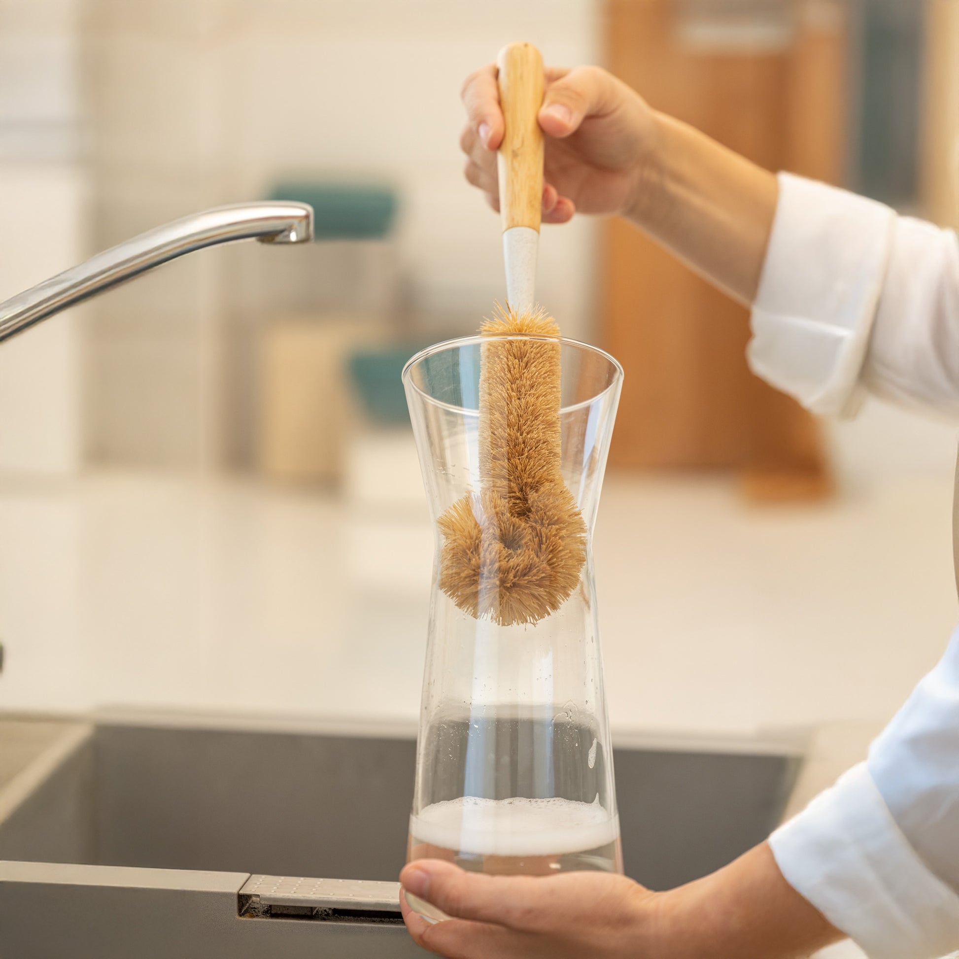 - Brosse à laver les verres et les bouteilles avec une tête en fibres naturelles de coco qui nettoie sans endommager ni rayer les surfaces, idéale pour les cristaux délicats.