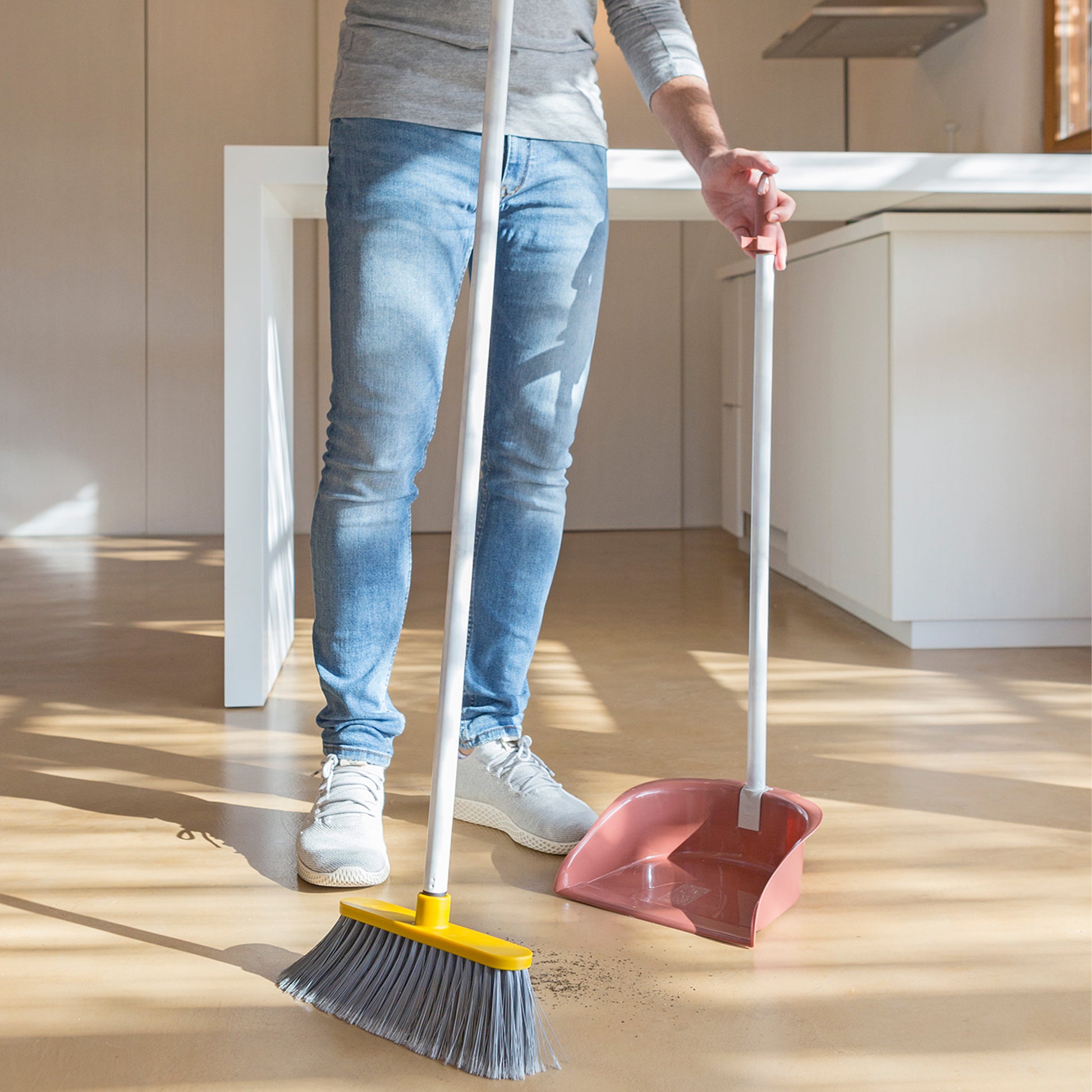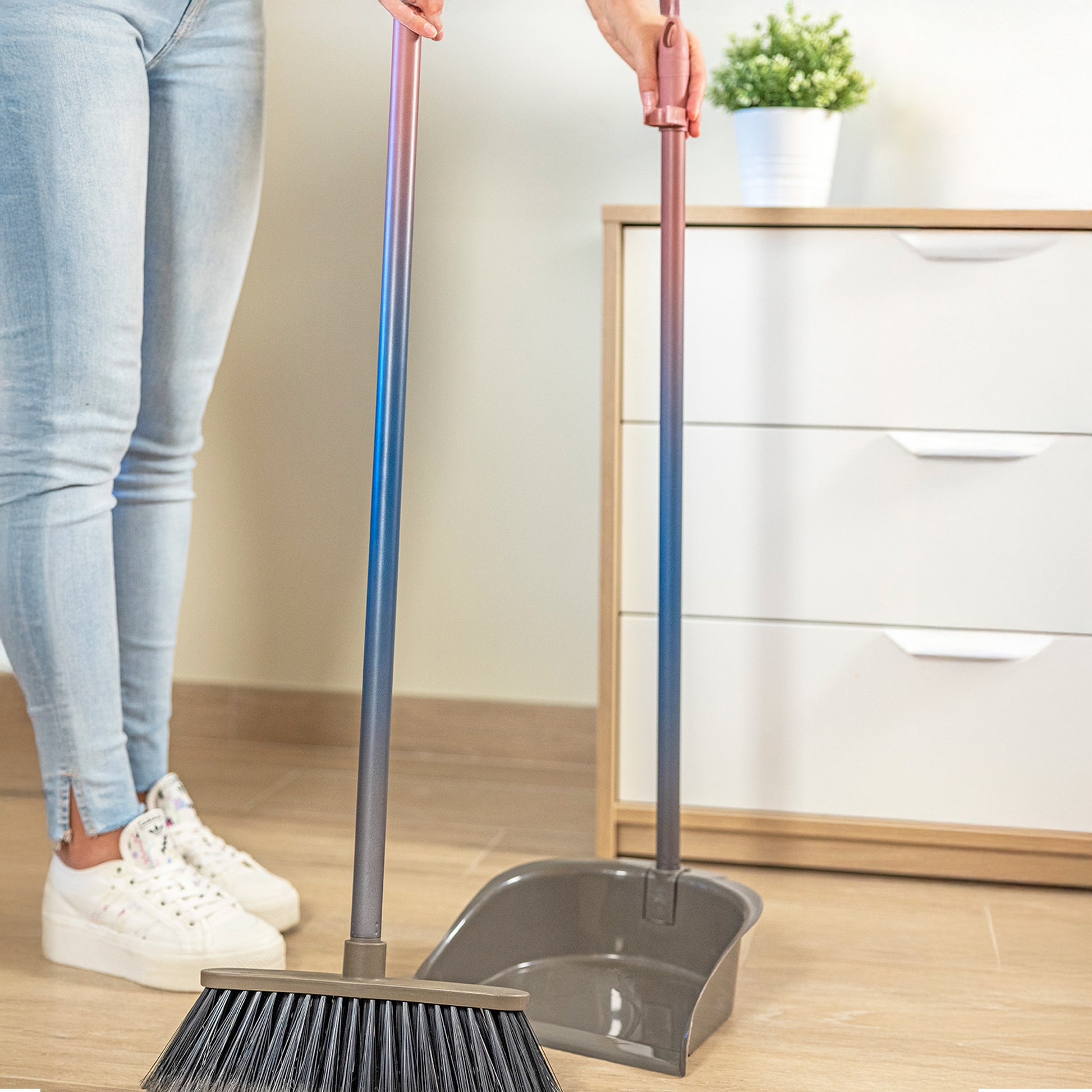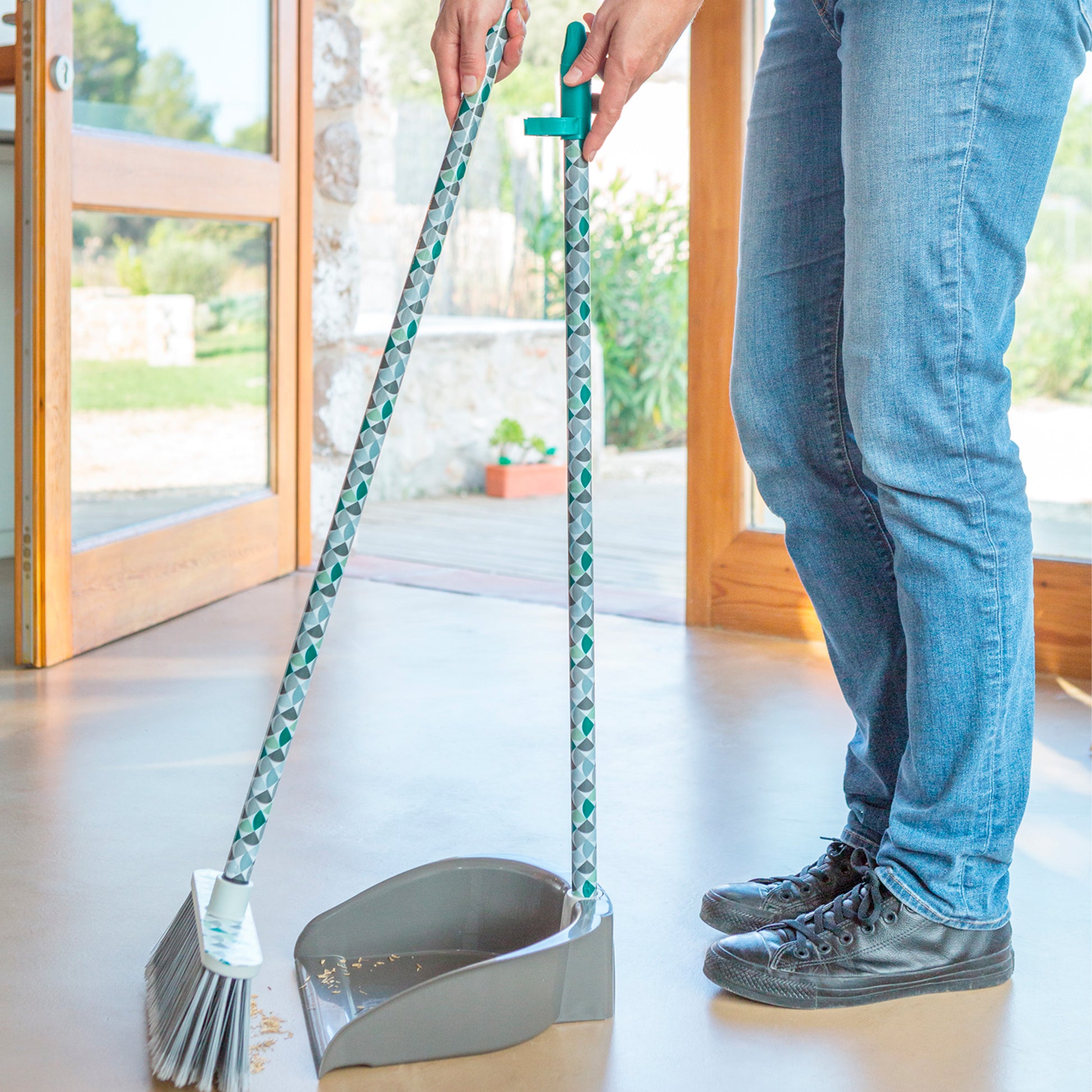 - Ramasse-poussière pliable avec pince pour balais, facilitant son rangement et son organisation.
