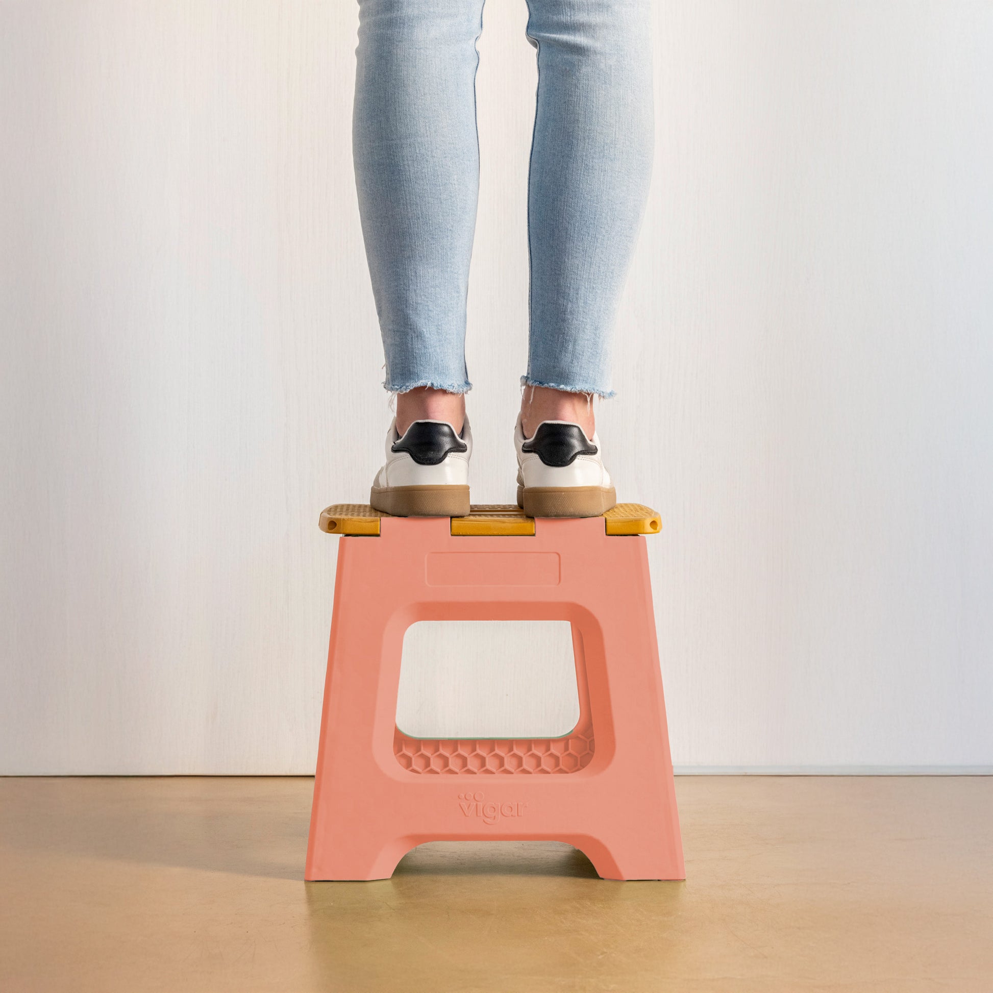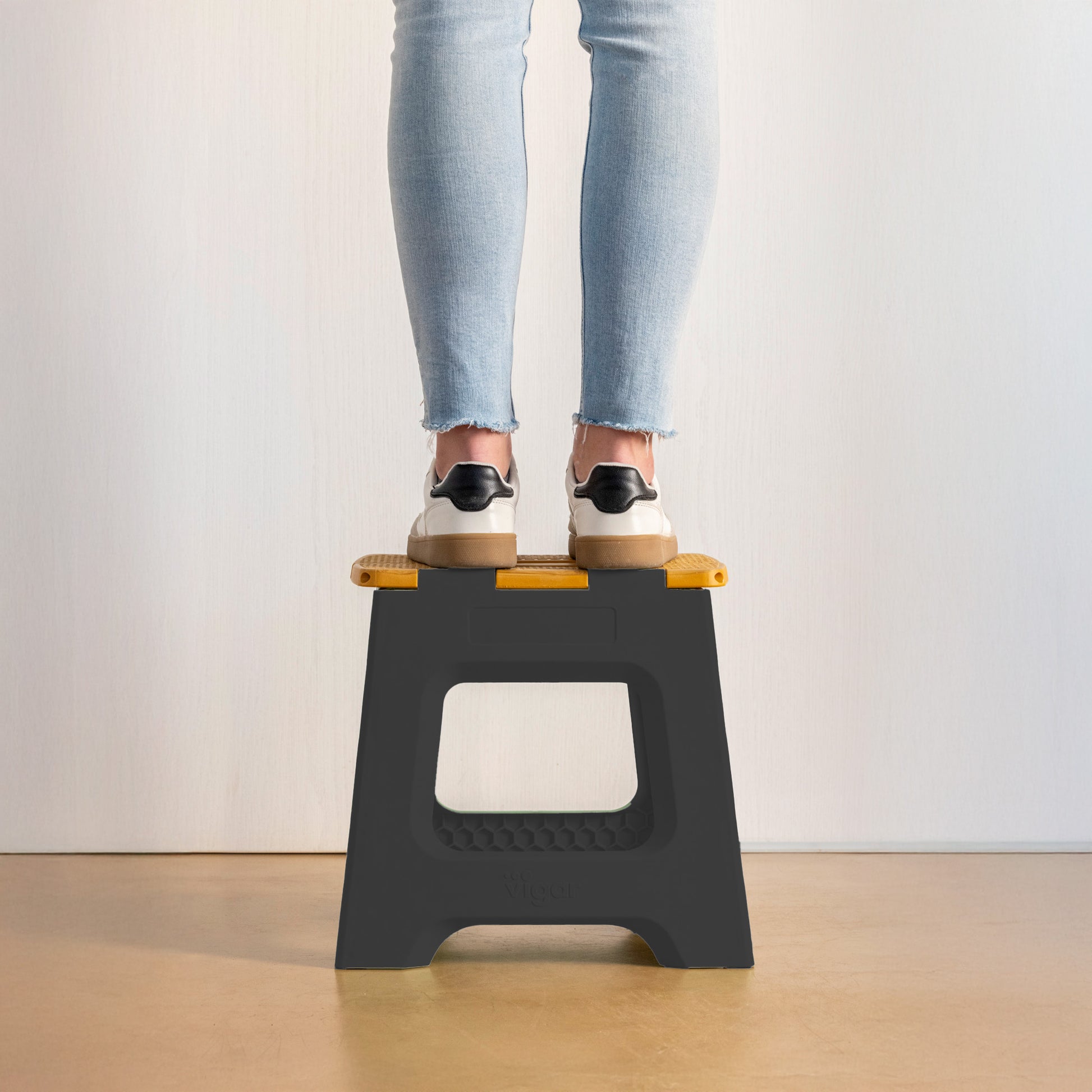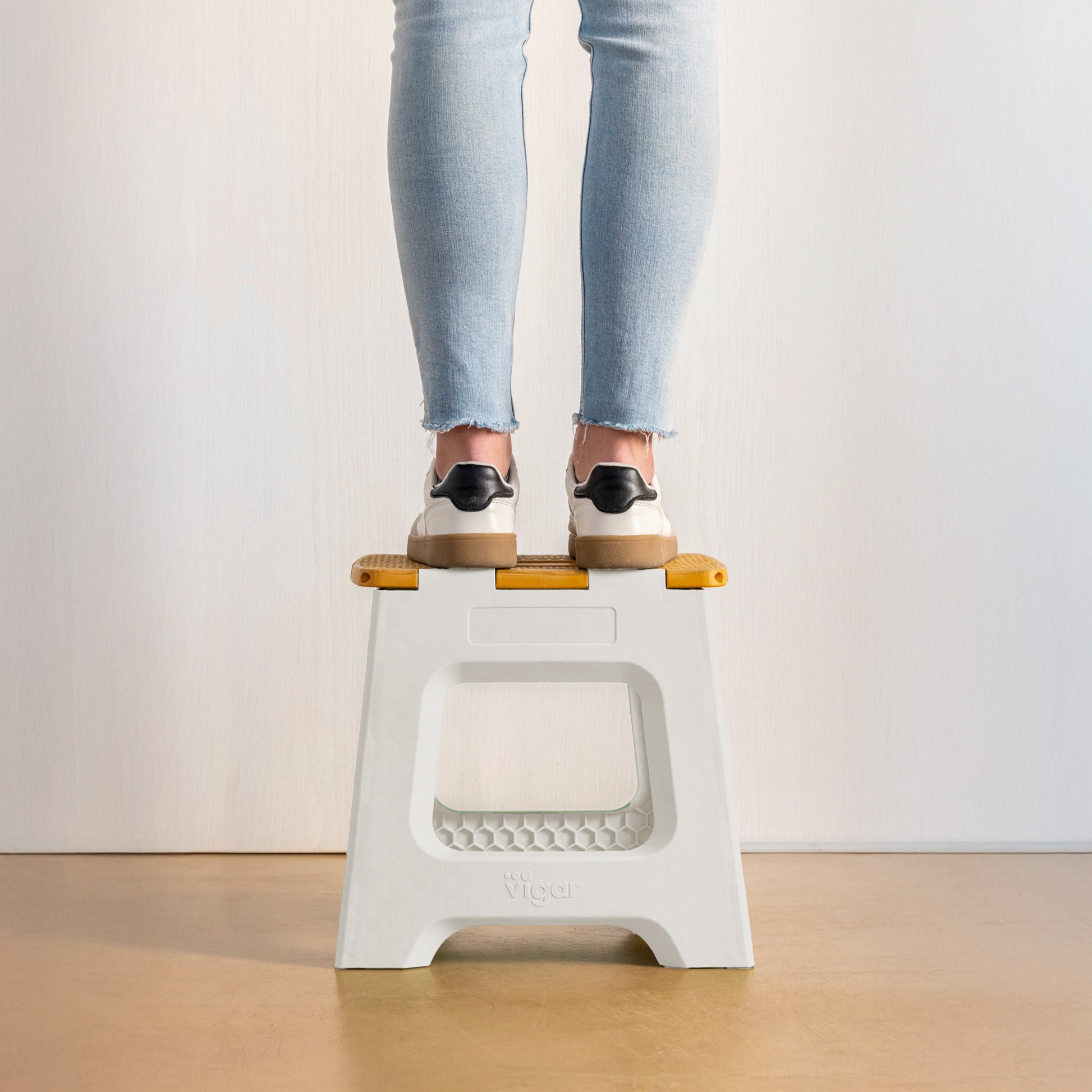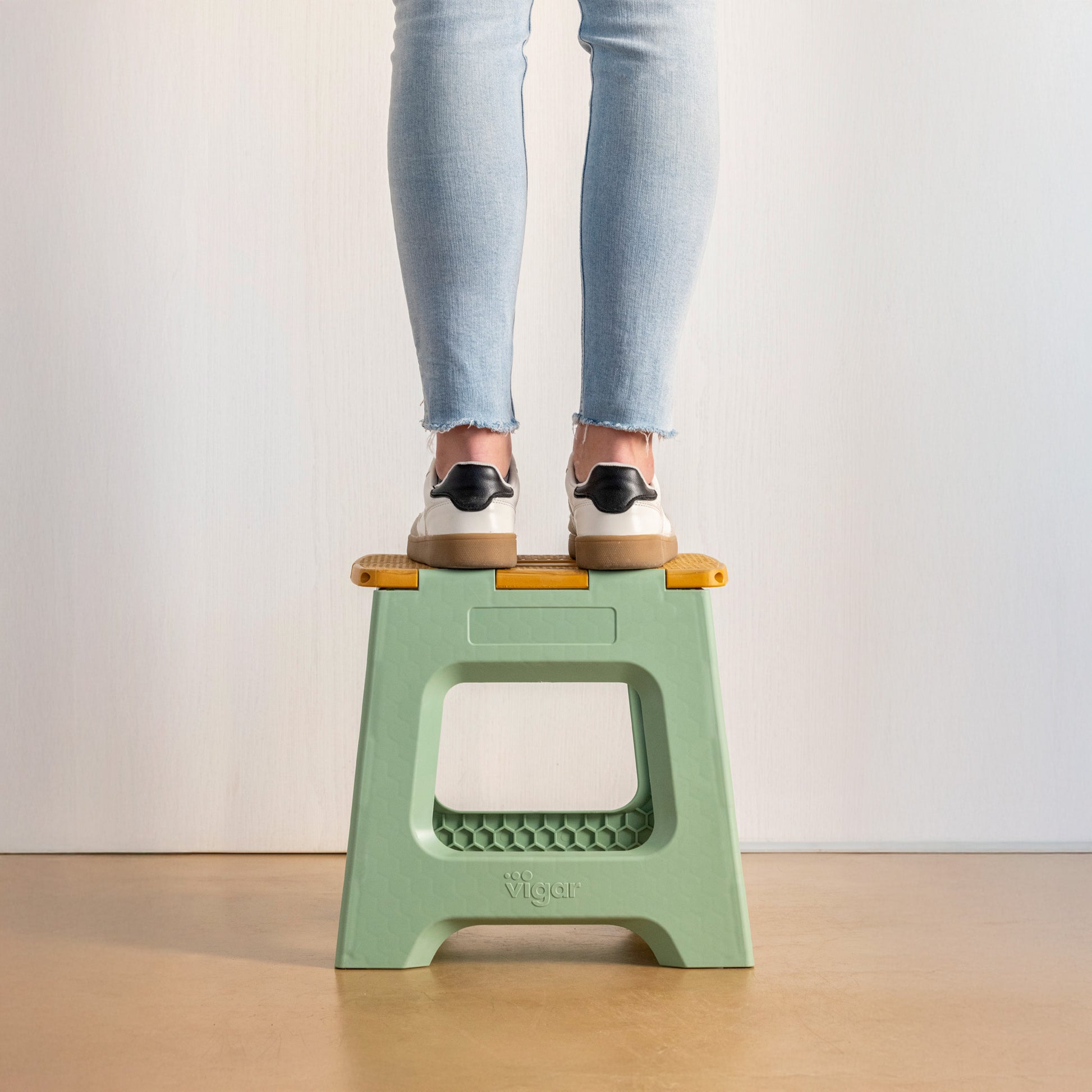 - Tabouret de 32 cm de hauteur avec système de pliage total pour gagner de l'espace lors du rangement.