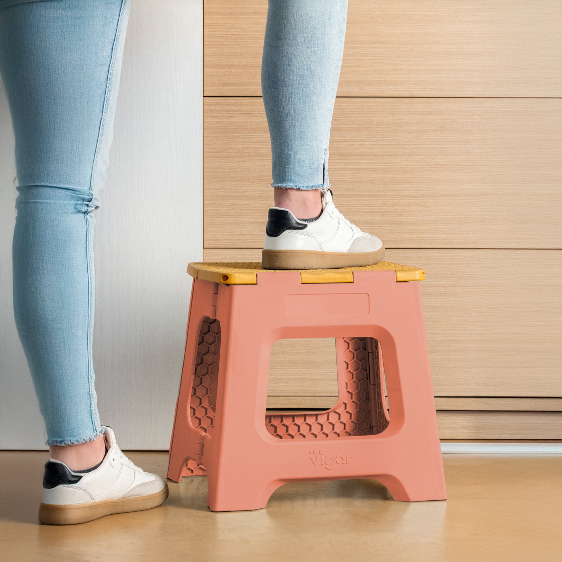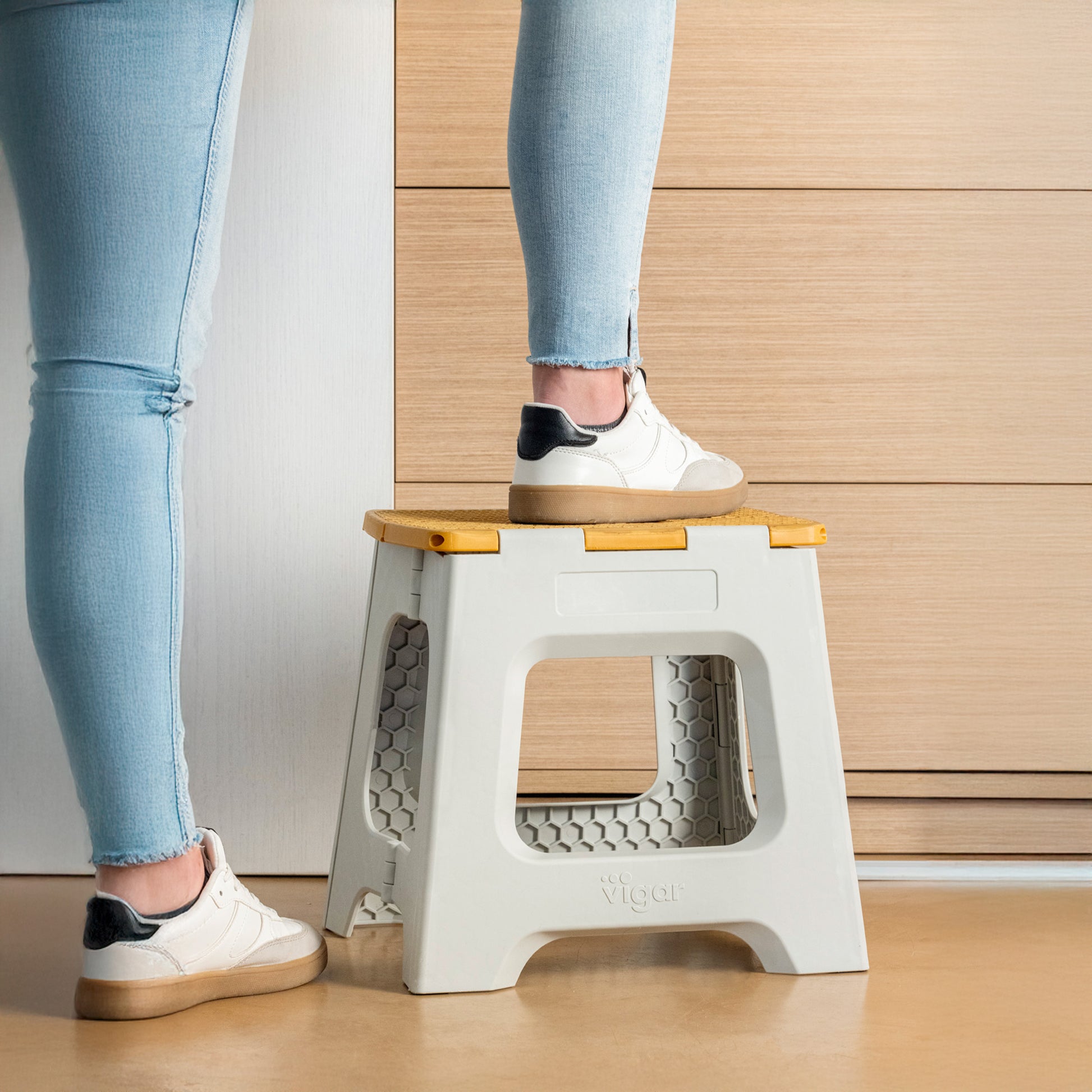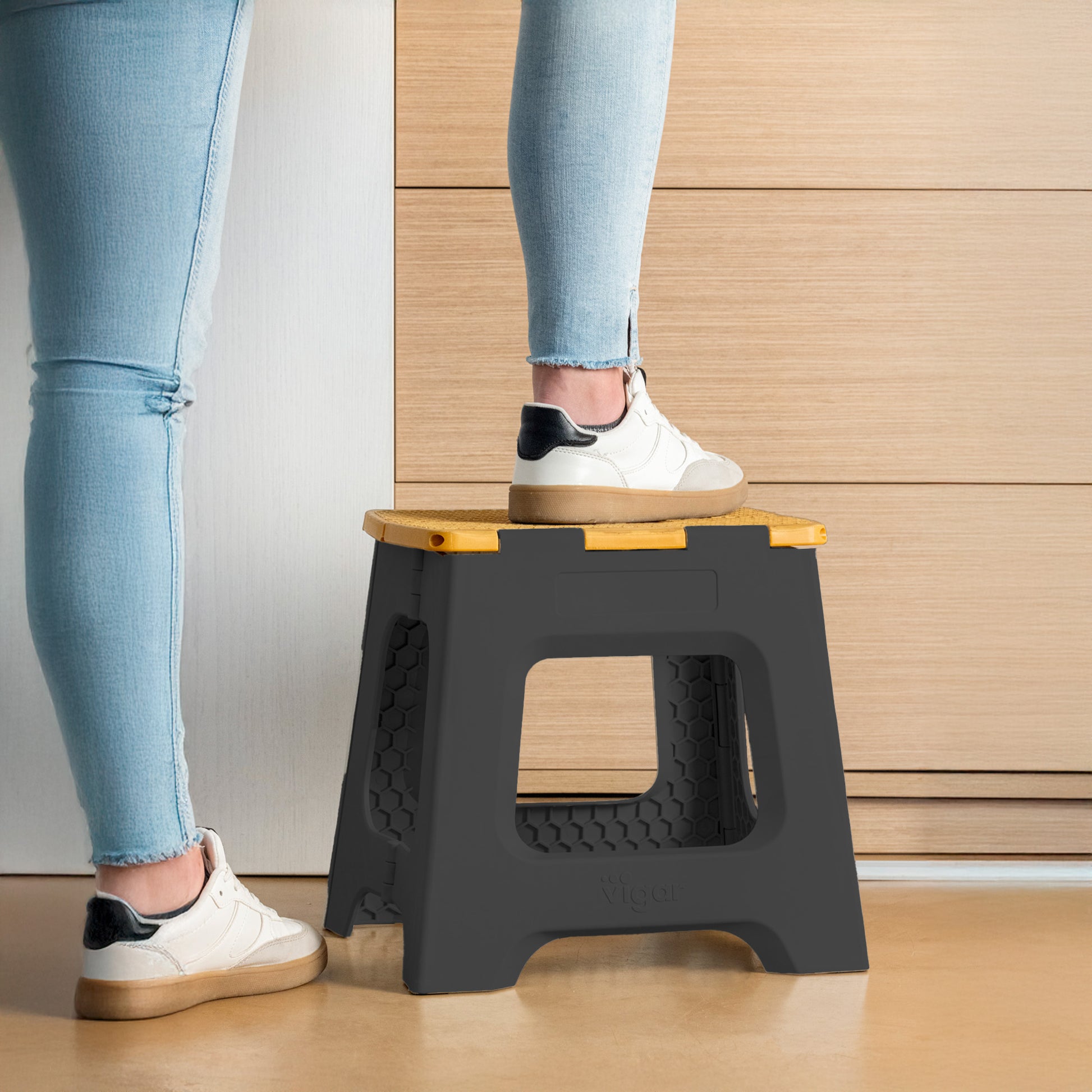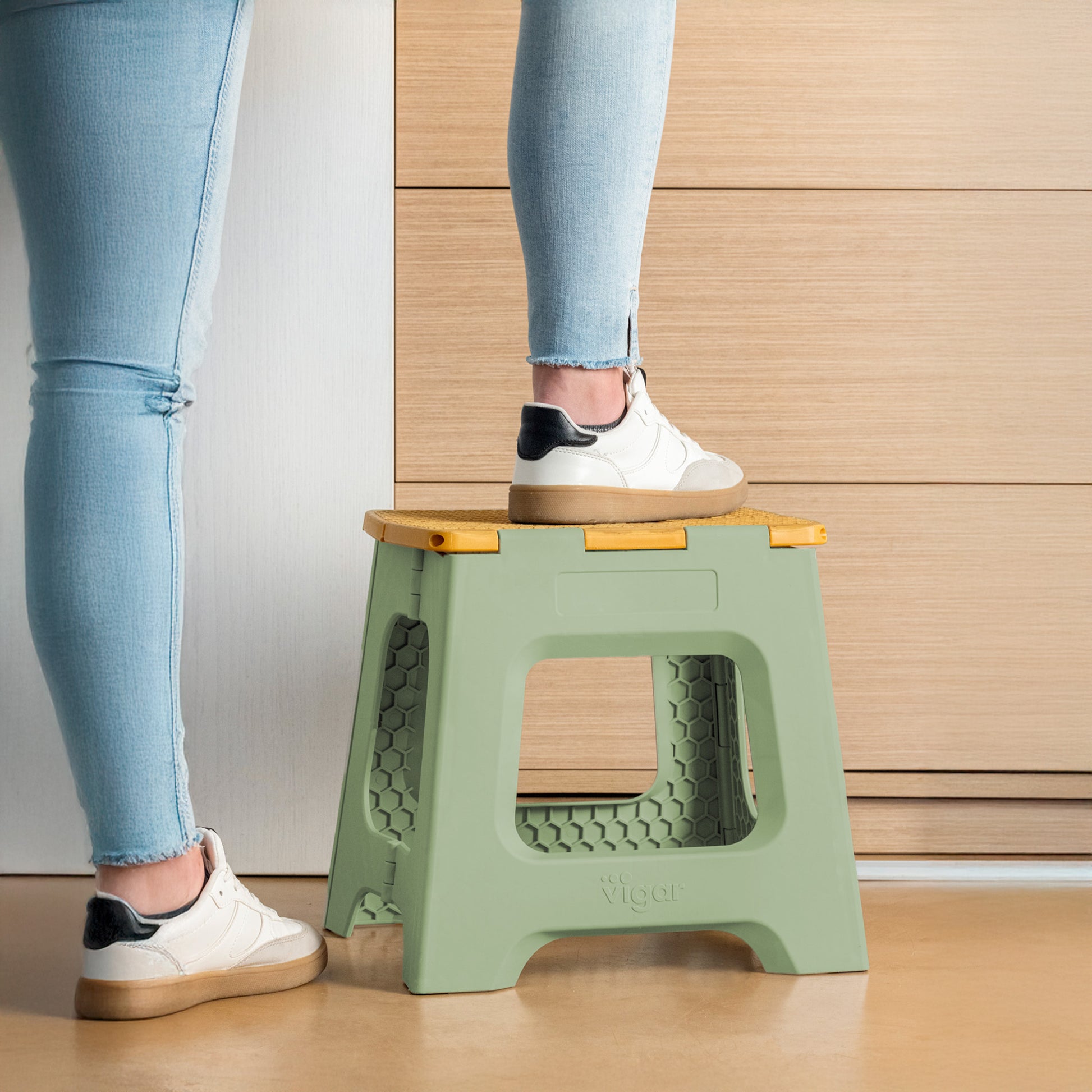 - Tabouret de 32 cm de hauteur avec système de pliage total pour gagner de l'espace lors du rangement.