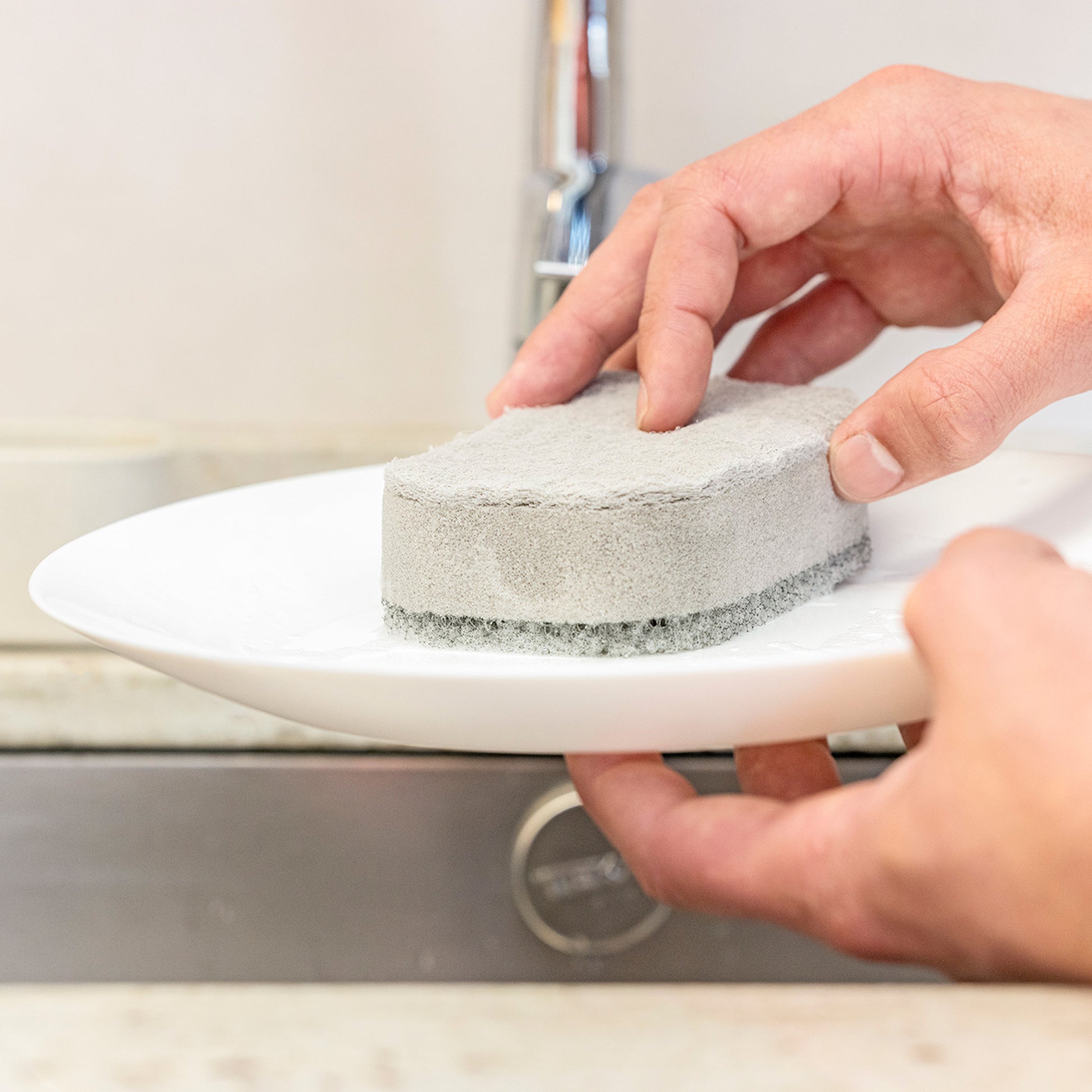 - Premendo la spugna sul supporto interno del vassoio, il sapone esce dai fori e impregna la spugna.