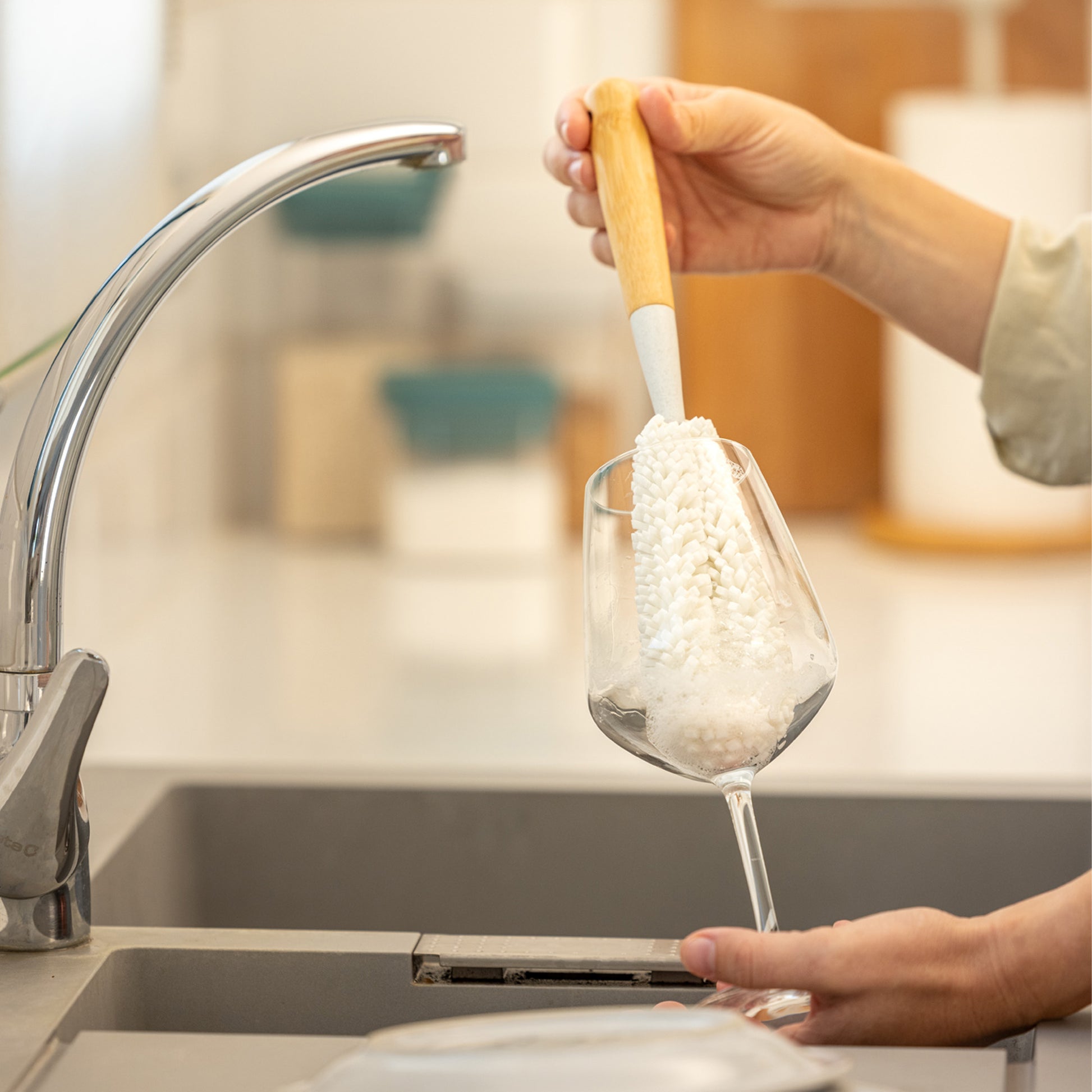 Realizzata in bambù sostenibile, questa spazzola ha setole morbide che proteggono la cristalleria. Il suo manico ergonomico facilita la presa, rappresentando un'opzione pratica e decorativa per la cura di calici e bicchieri.