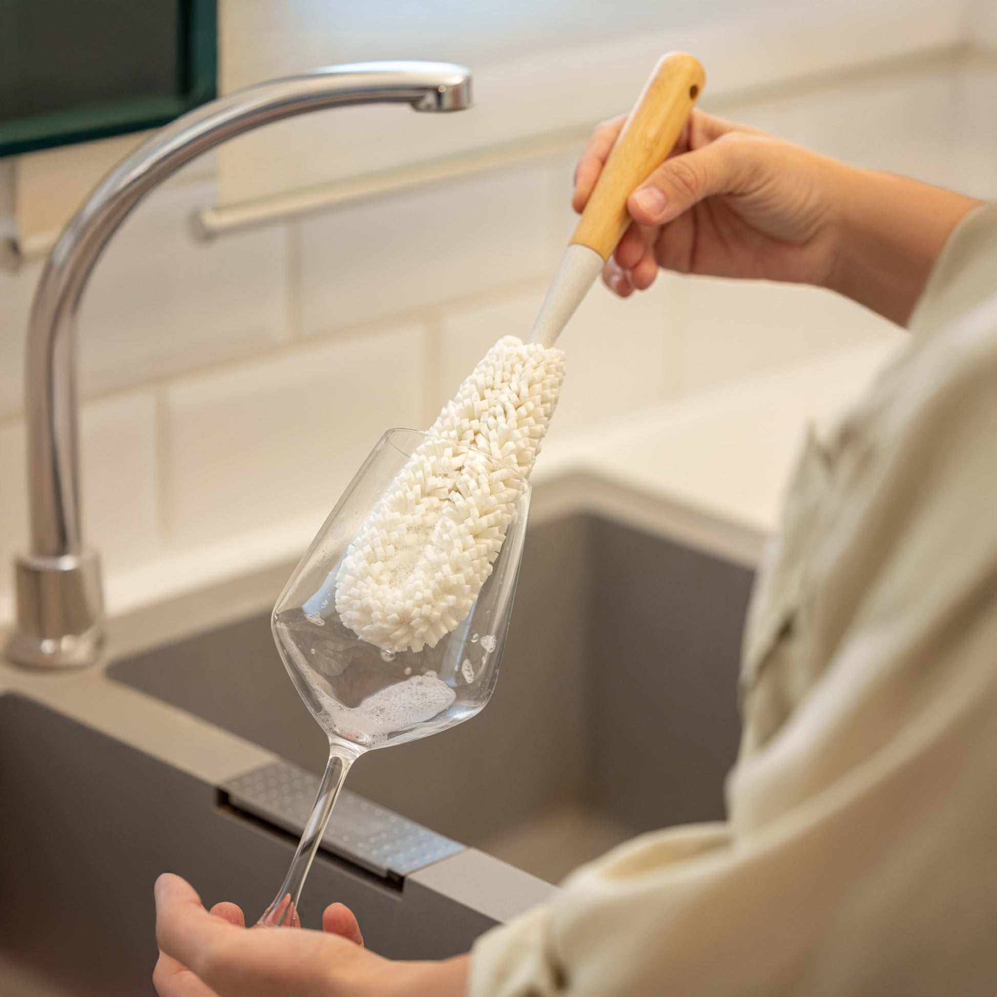 - Spazzola per bicchieri con testina in schiuma idrofobica morbida che pulisce senza graffiare la cristalleria delicata, garantendo una cura sicura.