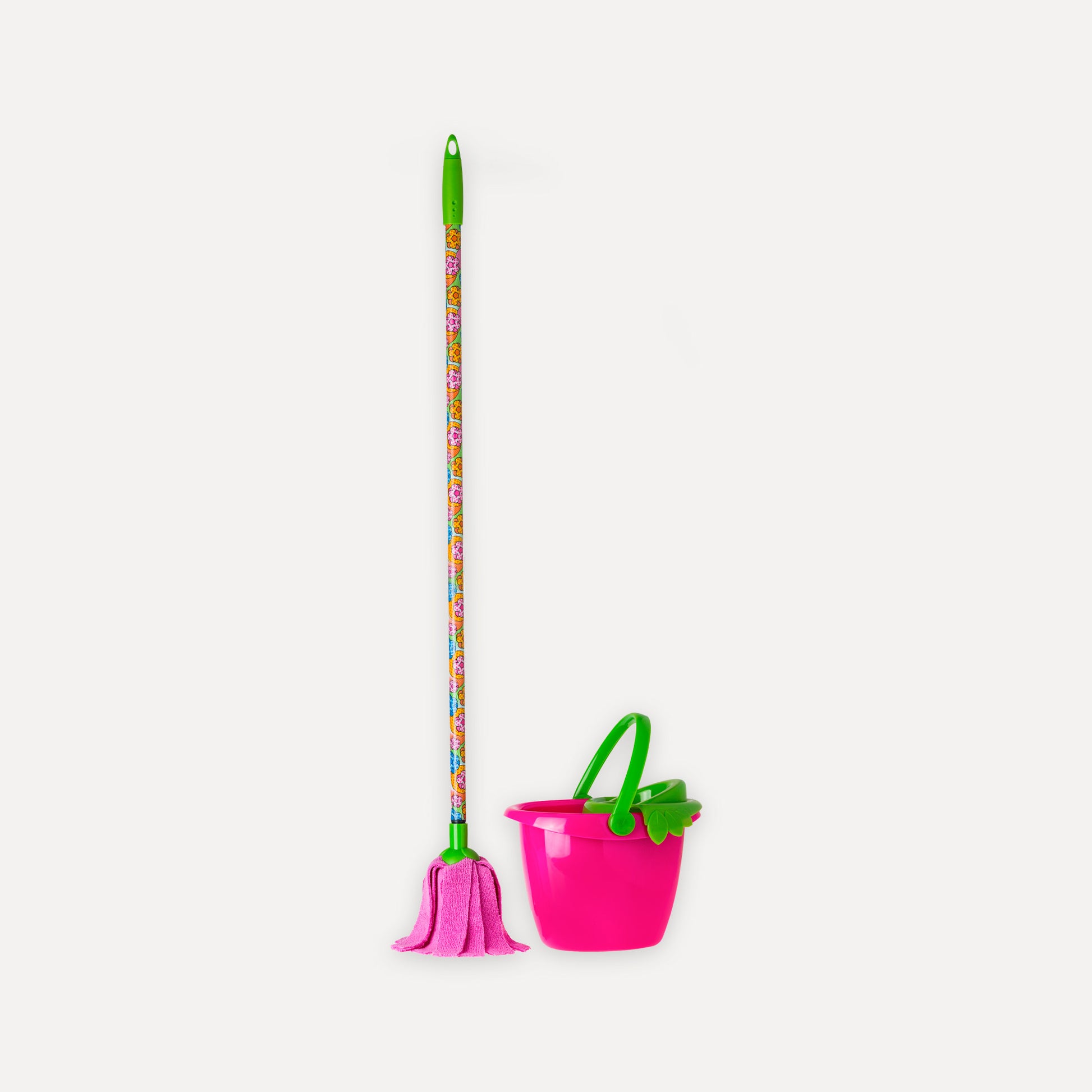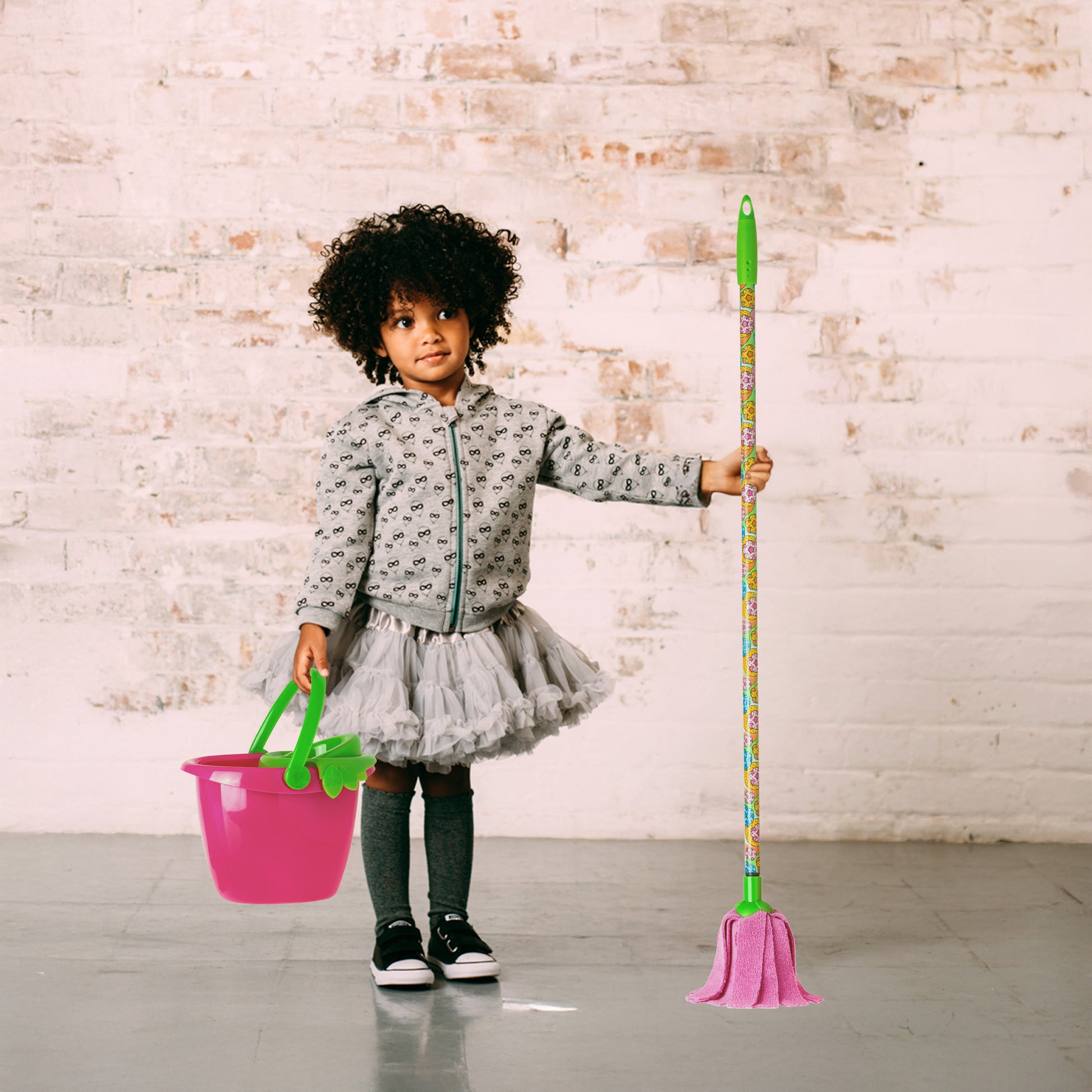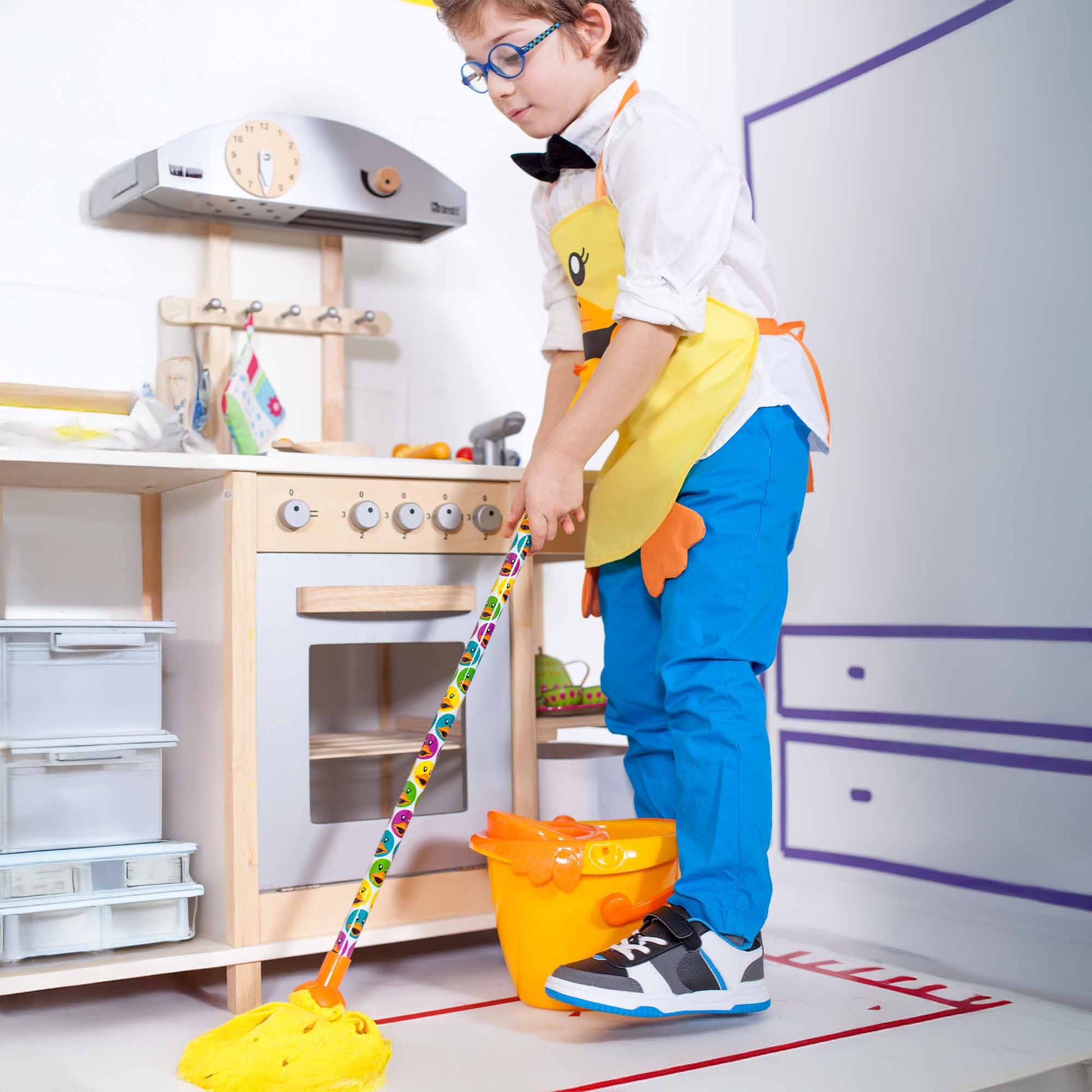 Include un mini mocio e un secchio, progettati appositamente per le mani dei bambini e realizzati con materiali sicuri e resistenti. Il design colorato e attraente invita i più piccoli a partecipare alle faccende domestiche, insegnando loro in modo divertente l'importanza della pulizia.