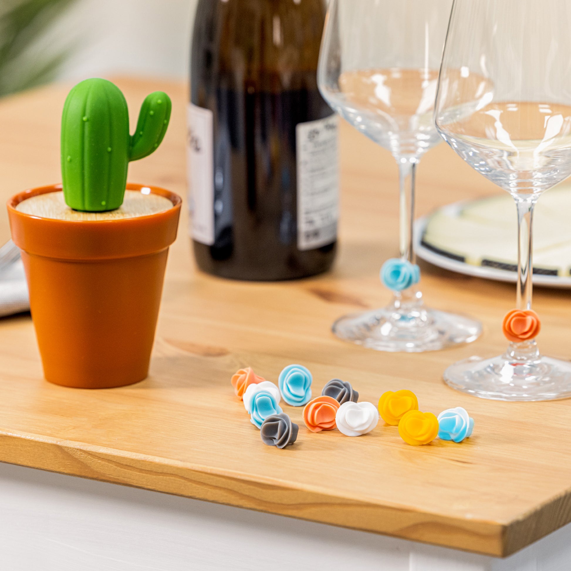 - Composto da un tappo per bottiglia, 18 segnabicchieri in silicone di alta qualità e un vaso con coperchio in bambù, tutto il necessario per mantenere le tue bevande organizzate e al sicuro.