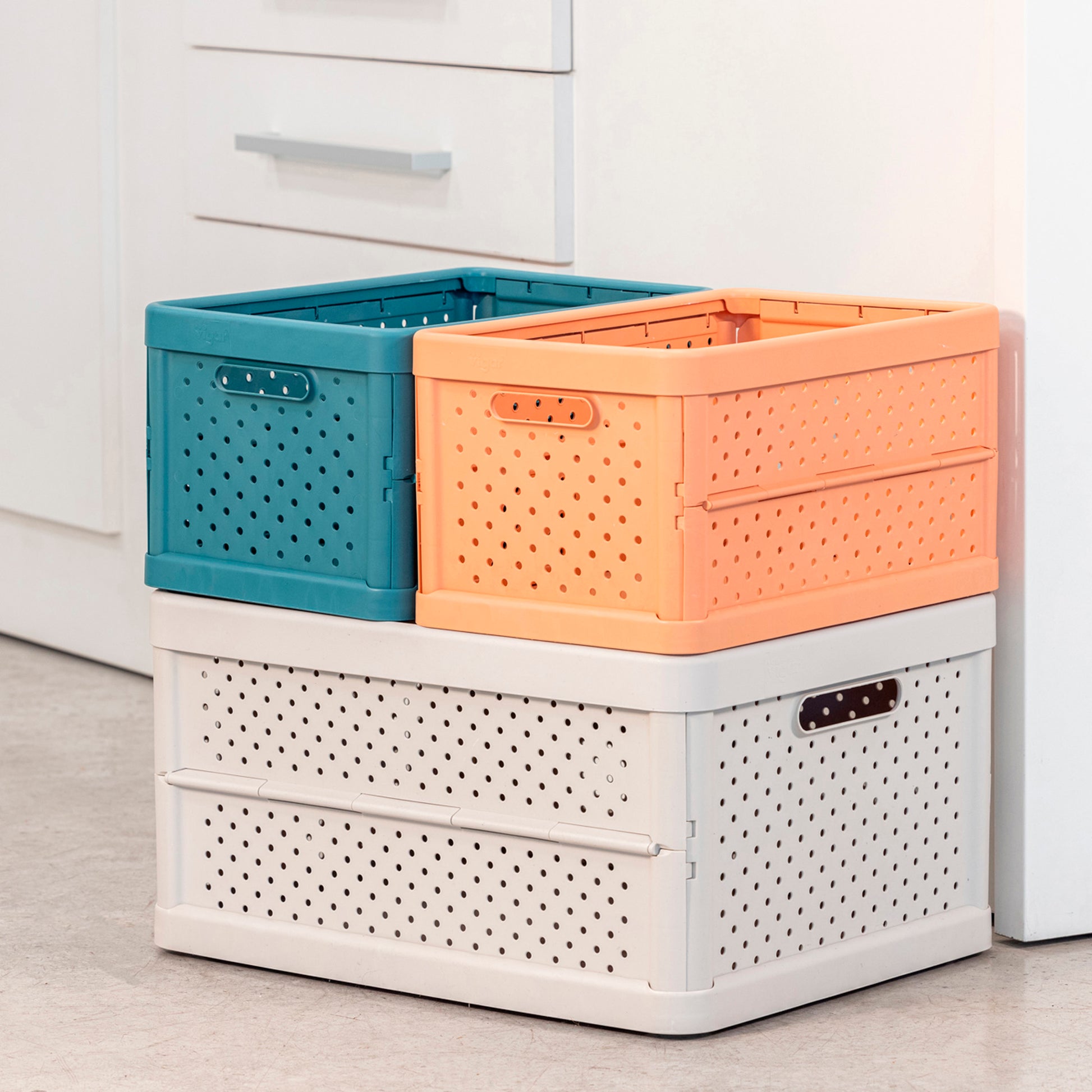 - De gran capacidad, apilable con otras cajas disponibles en diferentes tamaños y colores.