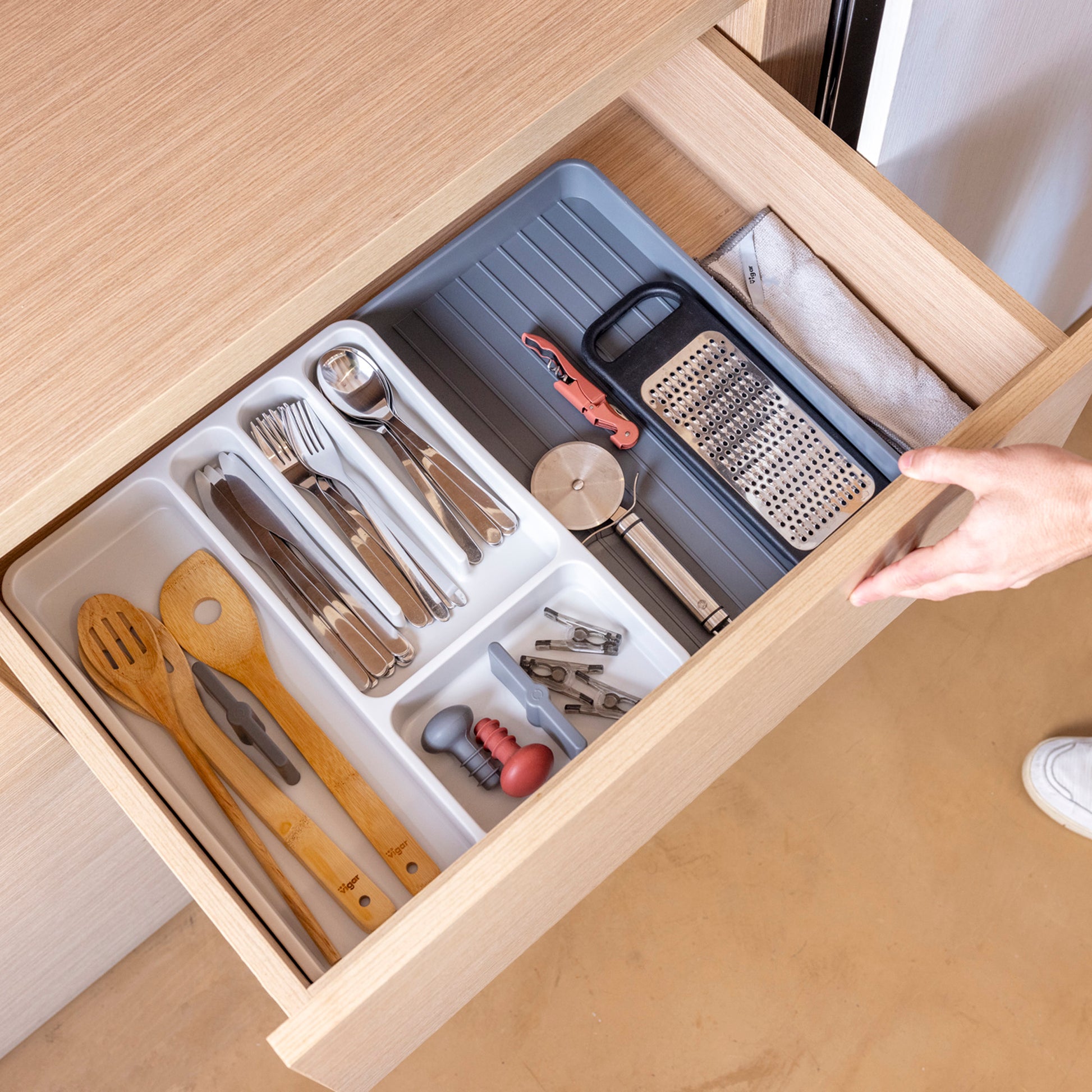 - Sistema extensible que se adapta a diferentes tamaños de cajones.