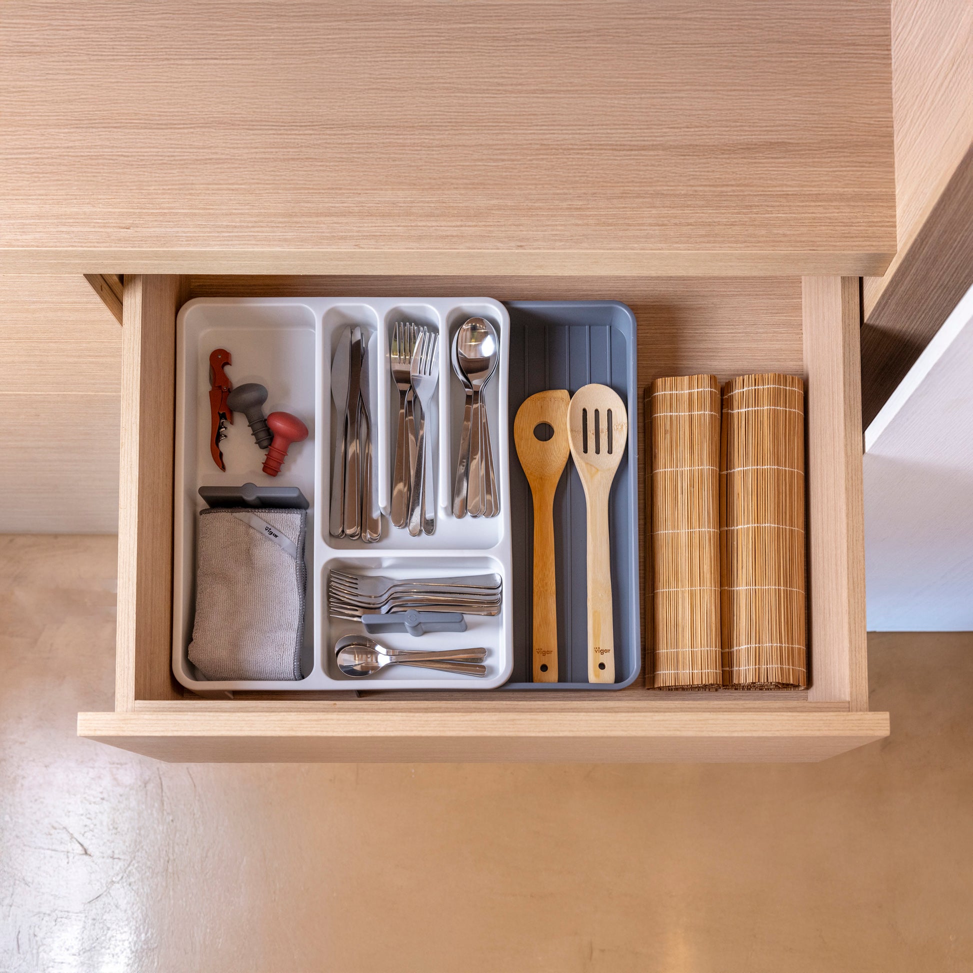 - Compartimentos bien distribuidos para clasificar cubiertos y utensilios de uso diario.