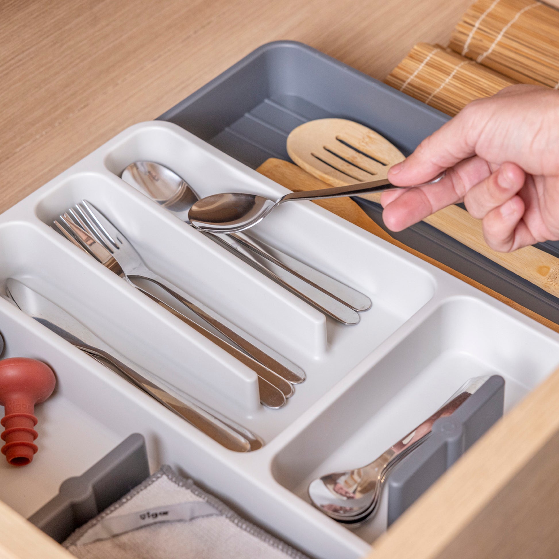 - Organizador de cubiertos expandible Rengo para mantener el orden en la cocina.