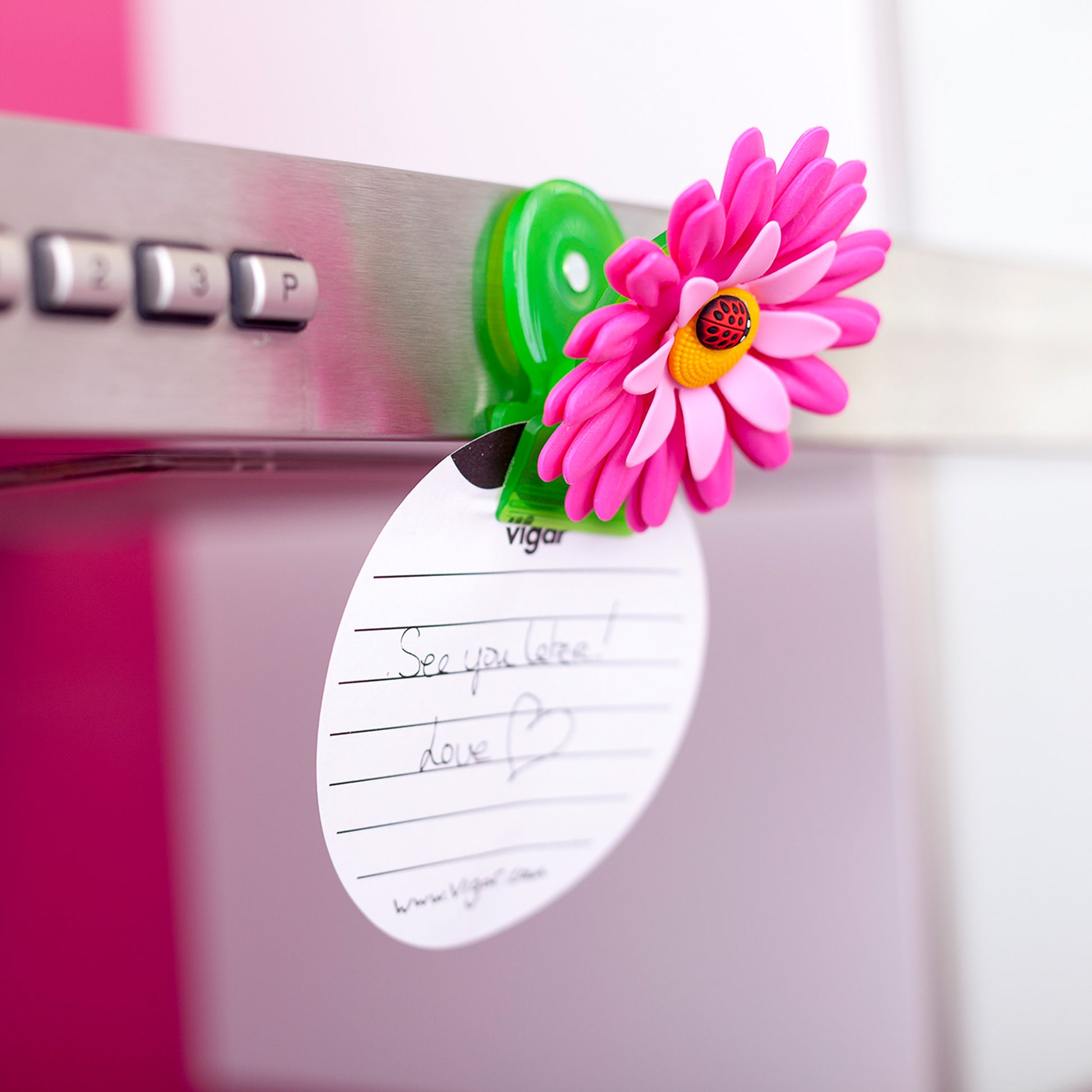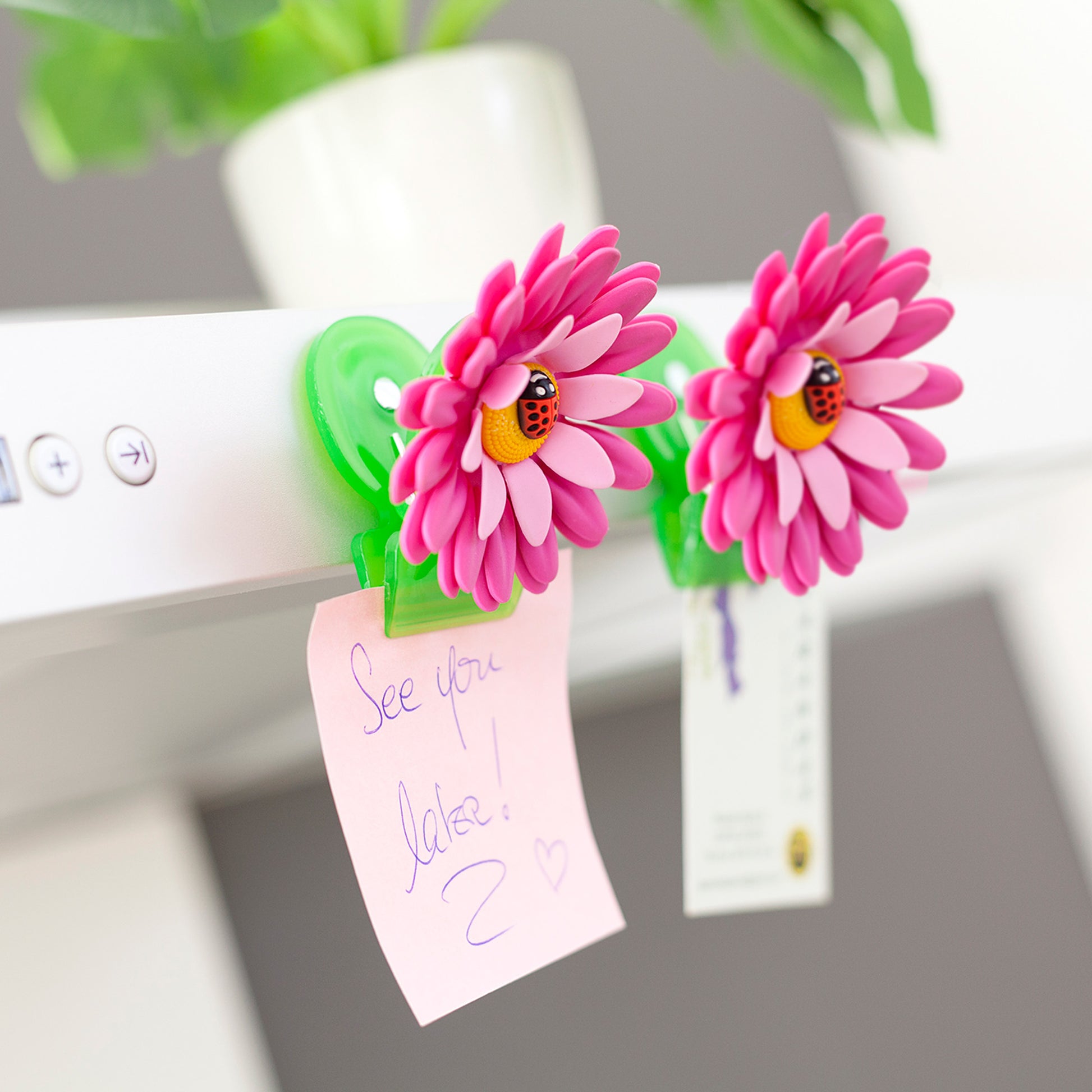 Cada pinza cuenta con un imán fuerte que se adhiere fácilmente a superficies metálicas, como el refrigerador o pizarras magnéticas. El diseño floral en color rosa es tanto decorativo como práctico, ideal para mantener tus documentos organizados con un toque de encanto.