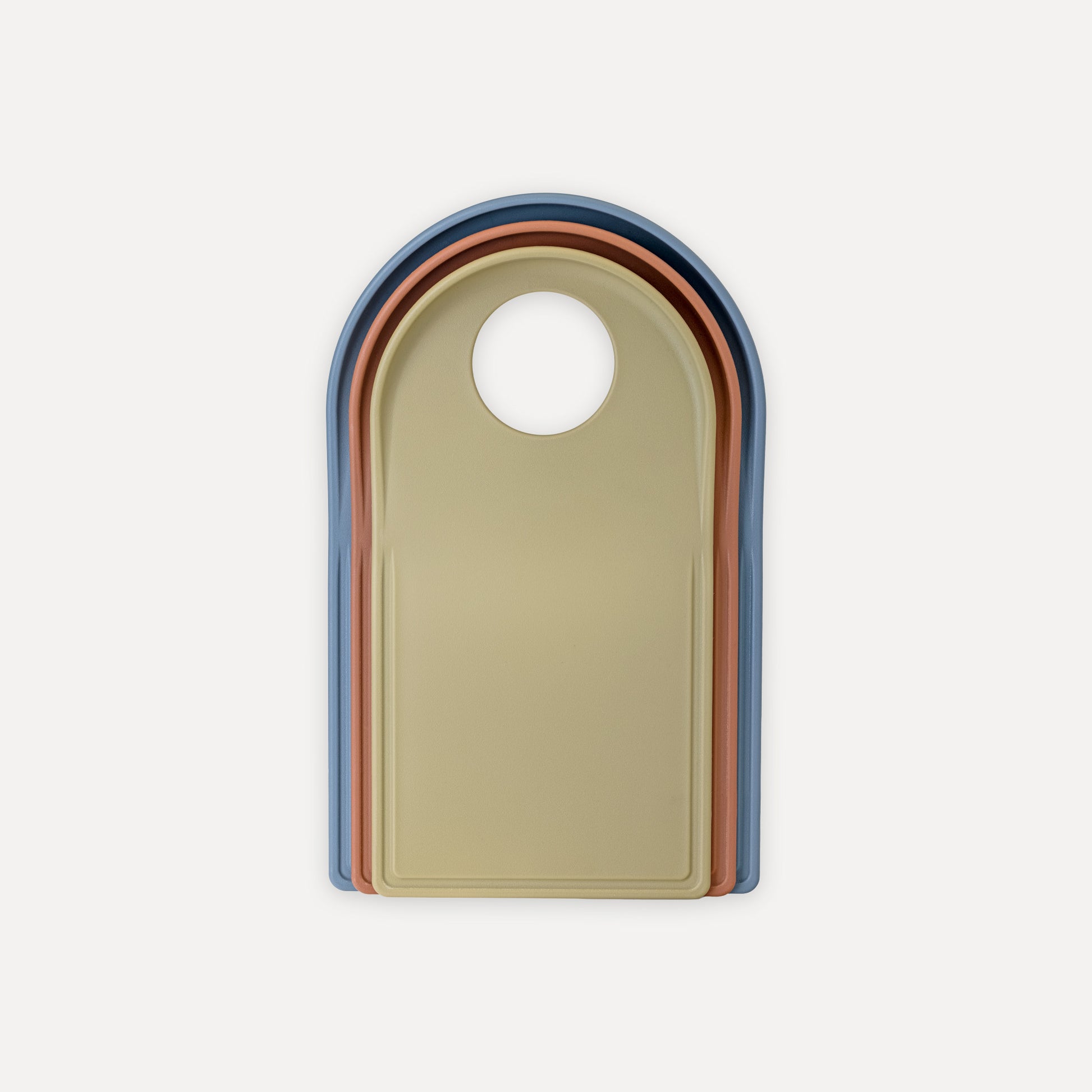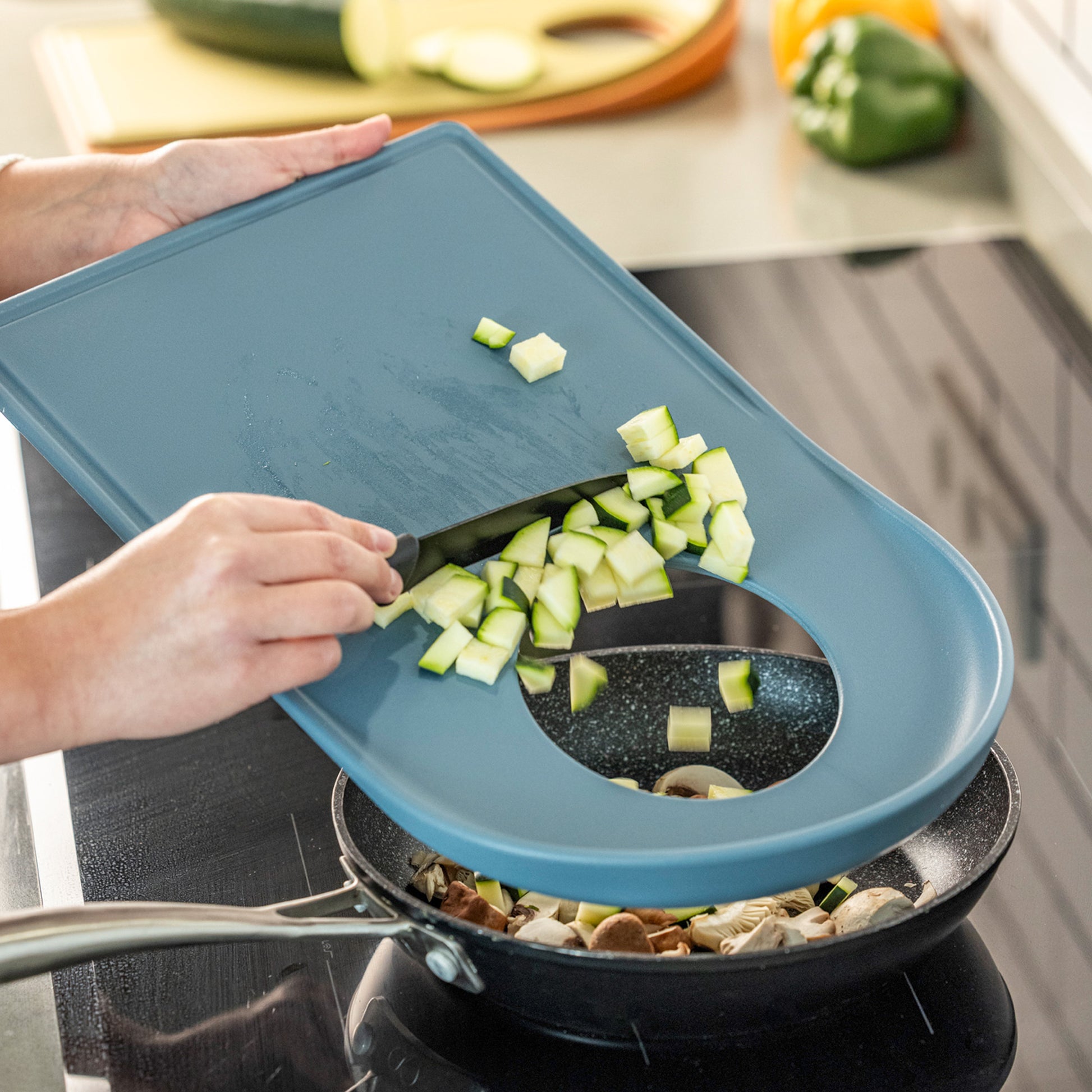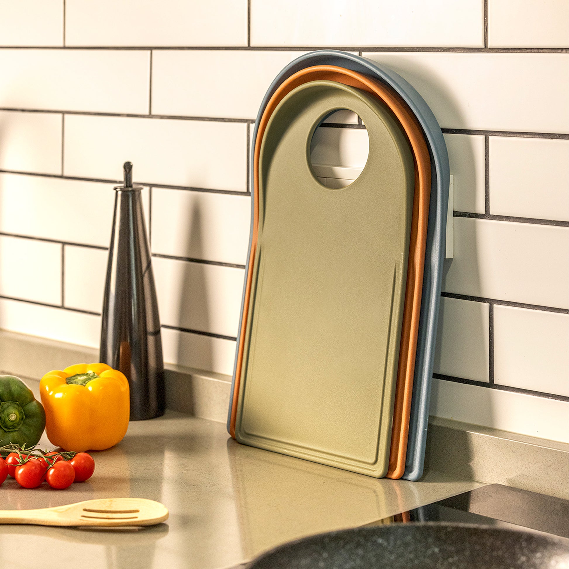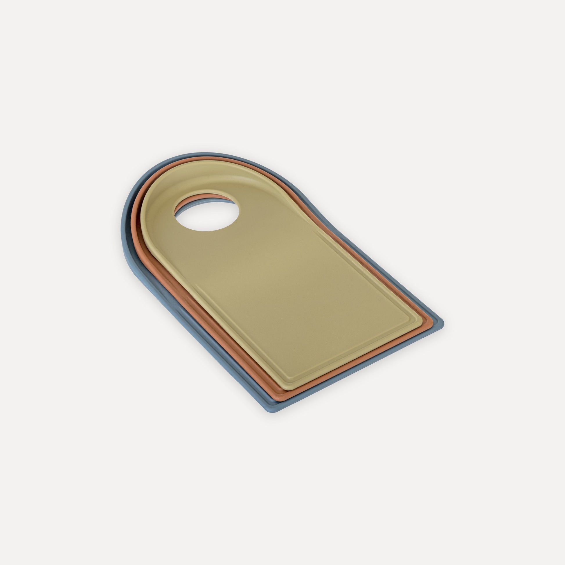 - Set de tres tablas de cortar en diferentes tamaños, diseñadas para facilitar el vertido, desecho de alimentos y su transporte