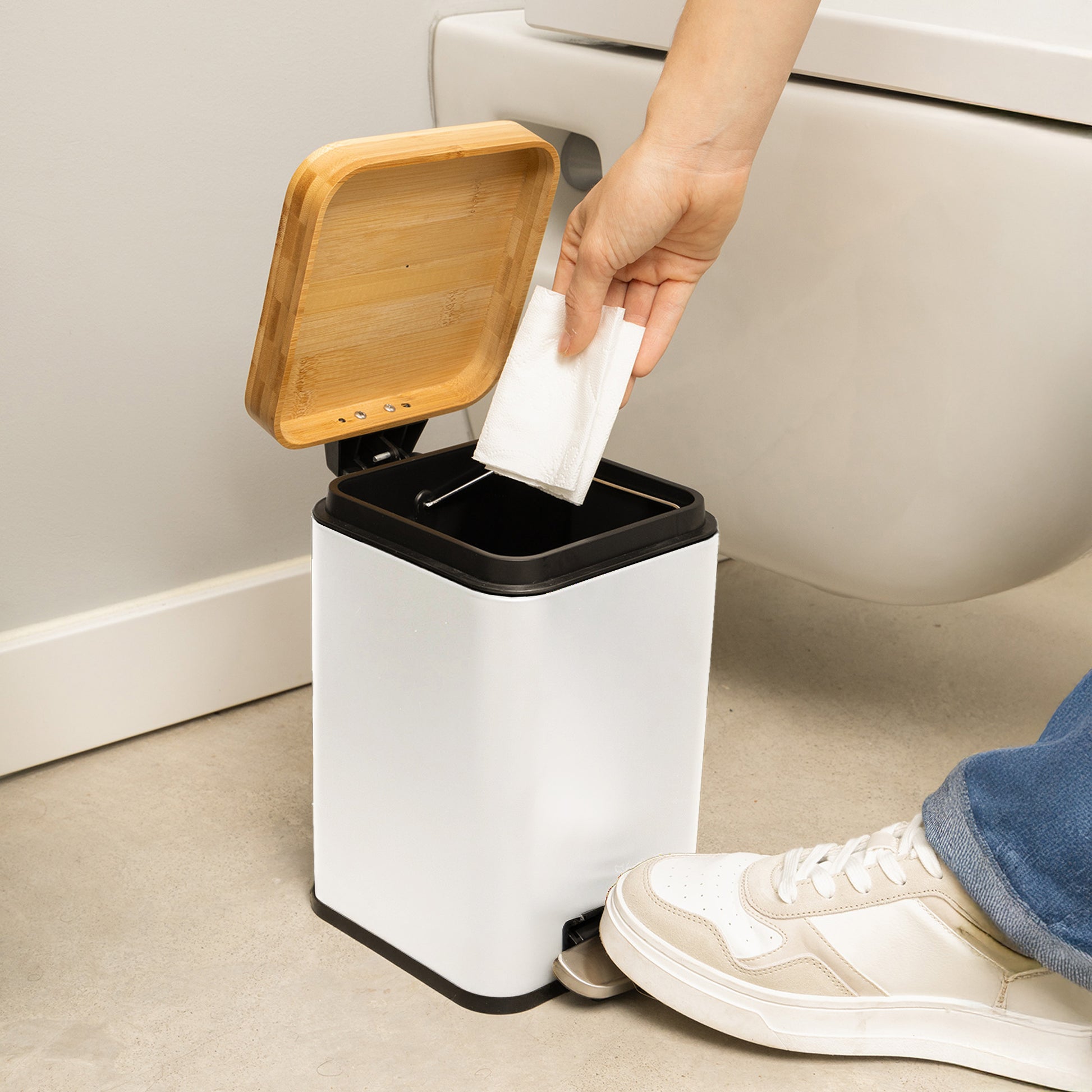 - Papelera de baño de 3 L con estructura metálica negra y elegante tapa de bambú natural. ideal para combinar funcionalidad y diseño.