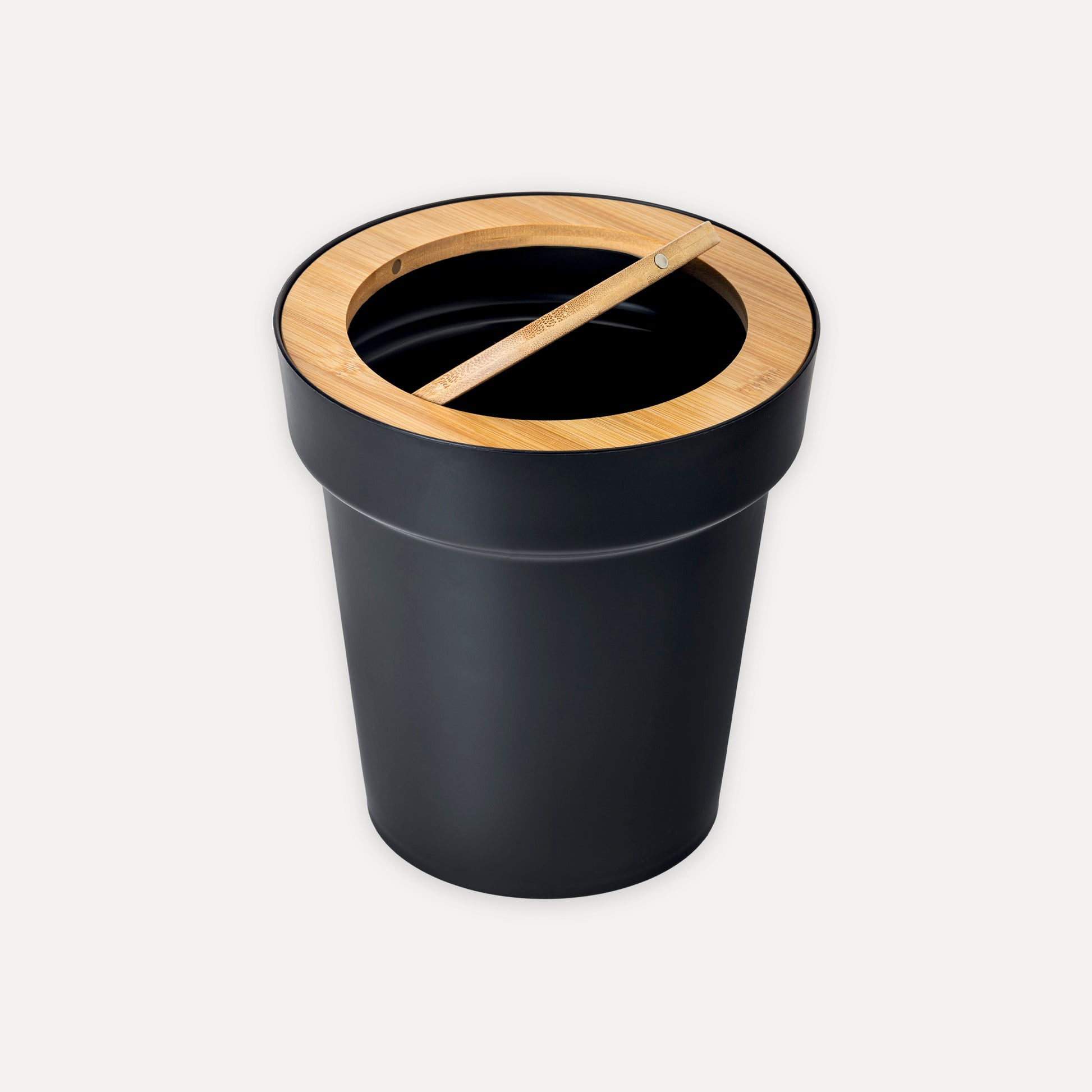 - Tapa de bambú que oculta el contenido y mejora la estética.