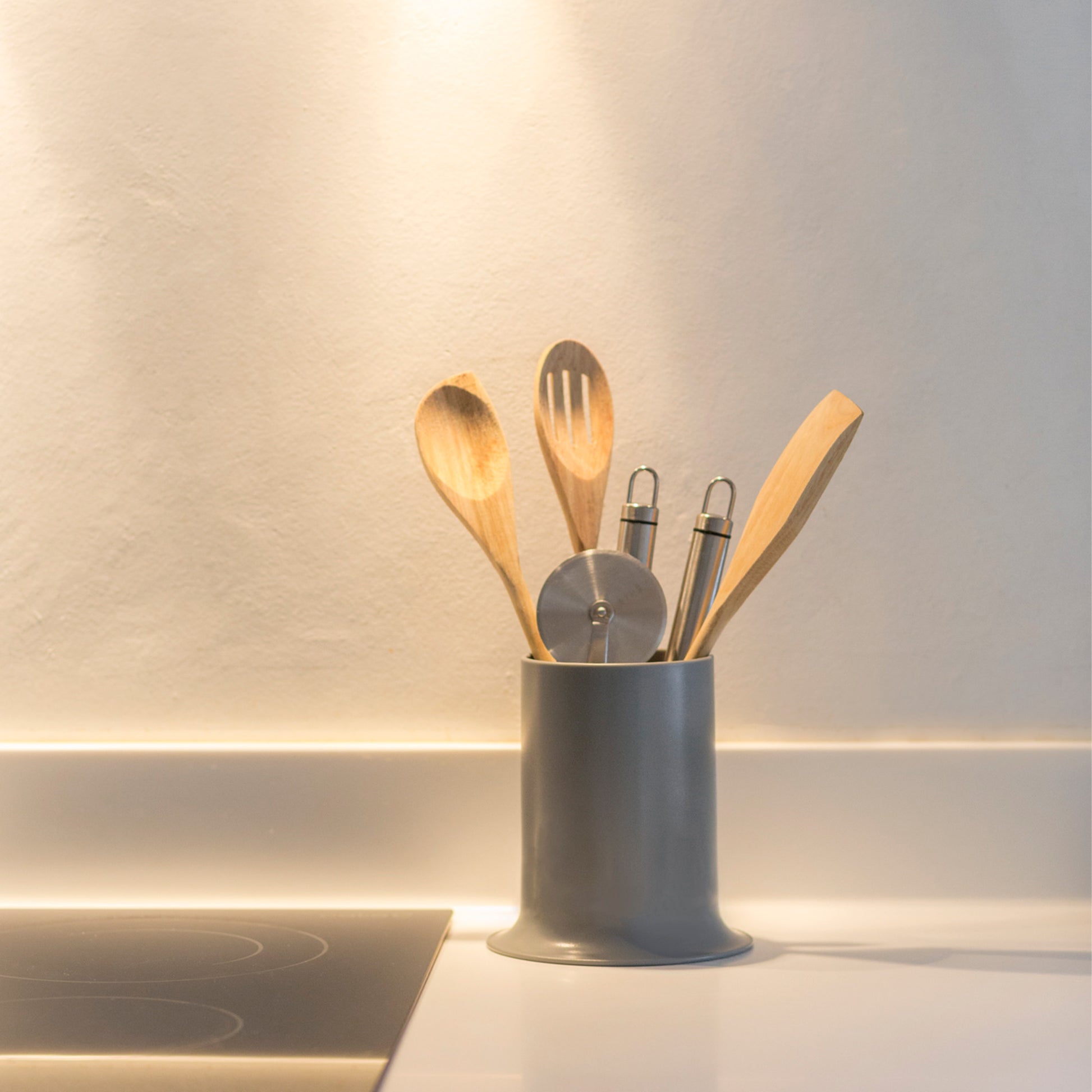 - Portaútiles de cocina con interior amplio y en acabado brillo, facilitando una limpieza perfecta y eficiente.