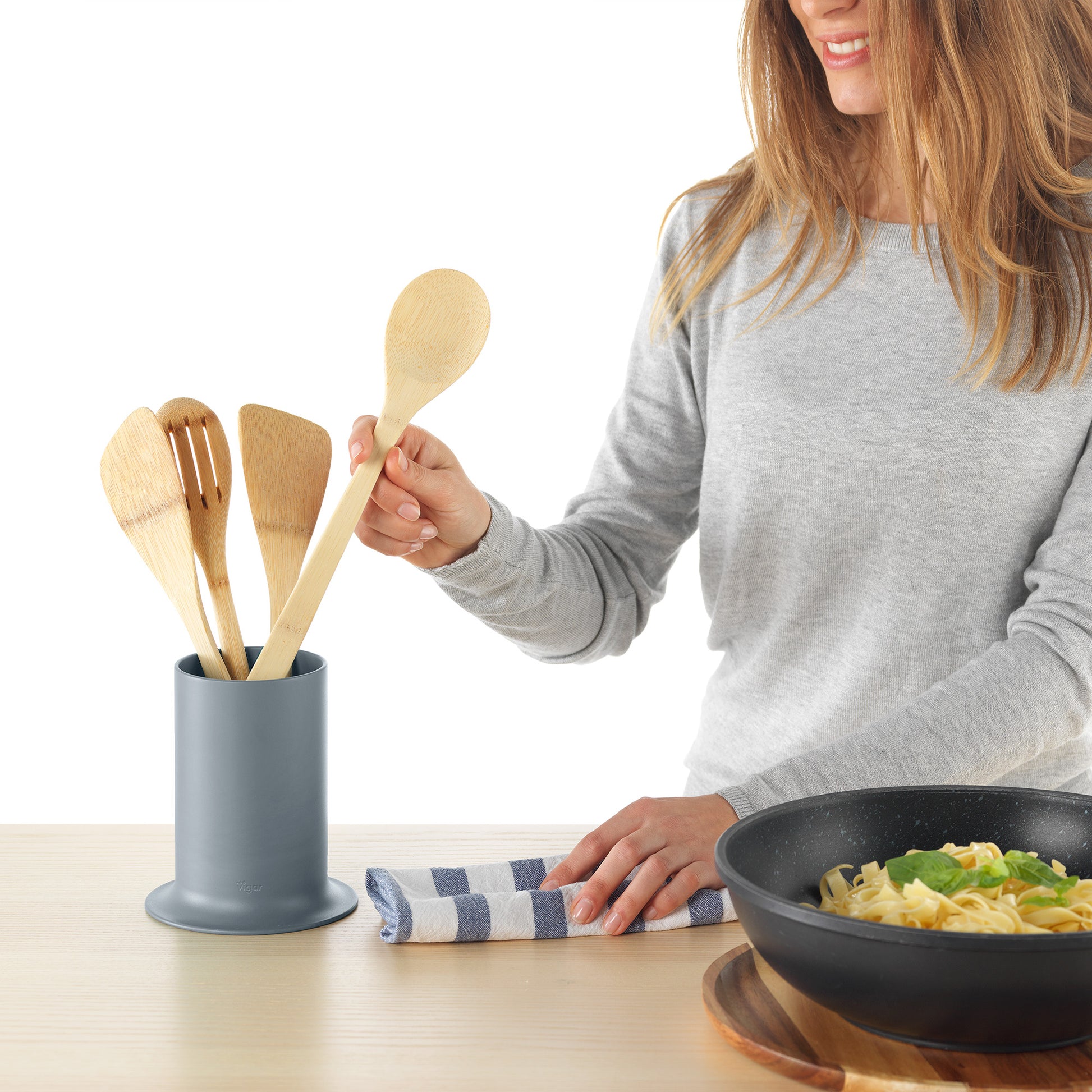 Fabricado en materiales resistentes, este portaútiles cuenta con un diseño compacto y refinado que se adapta a cualquier encimera. Su acabado en gris aporta un toque moderno y permite una organización eficiente y práctica de los utensilios de cocina.