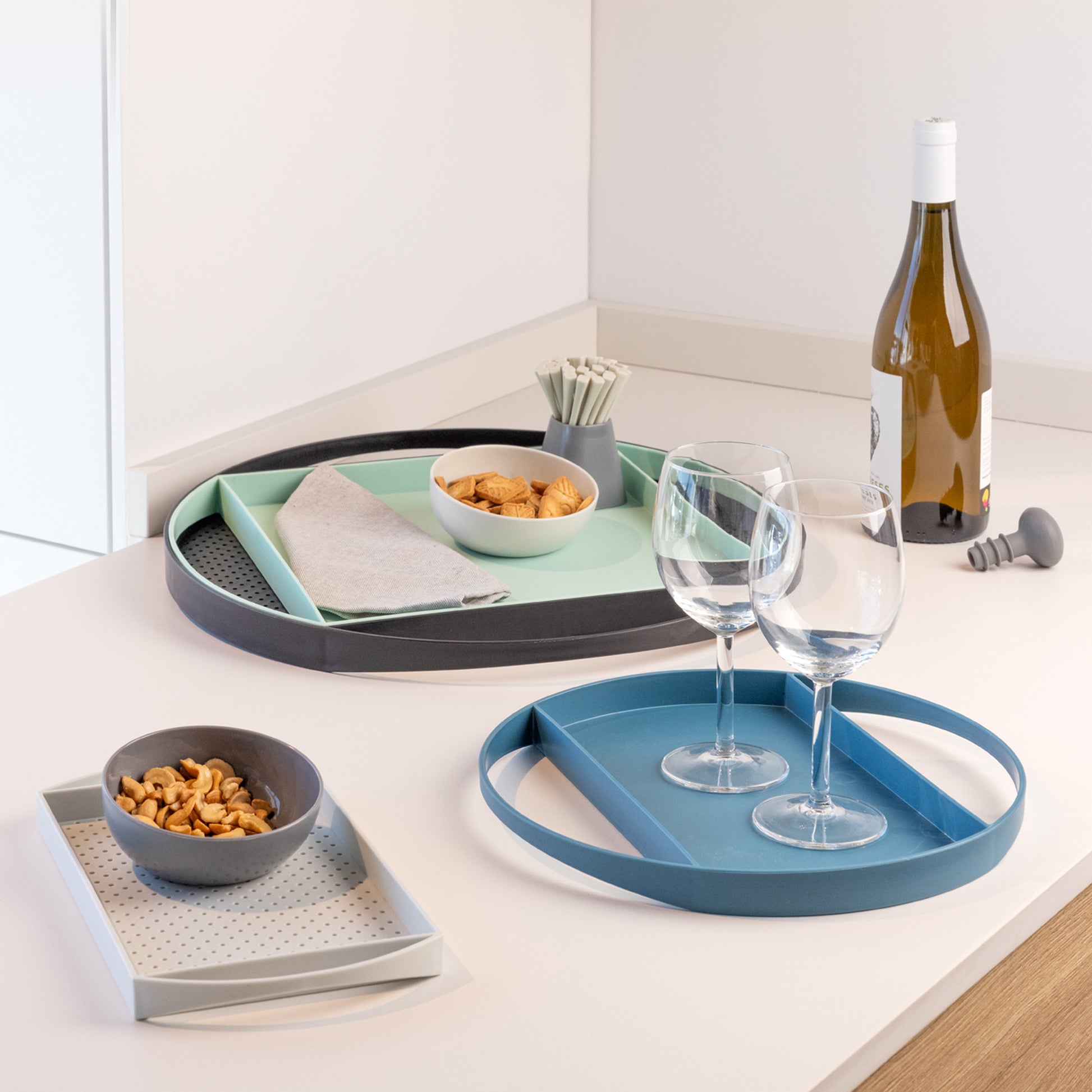 Elaboradas en materiales resistentes, estas bandejas pequeñas son apilables y fáciles de manejar. Su color glacial y diseño versátil permiten organizar diversos artículos, adaptándose perfectamente a cualquier espacio del hogar.