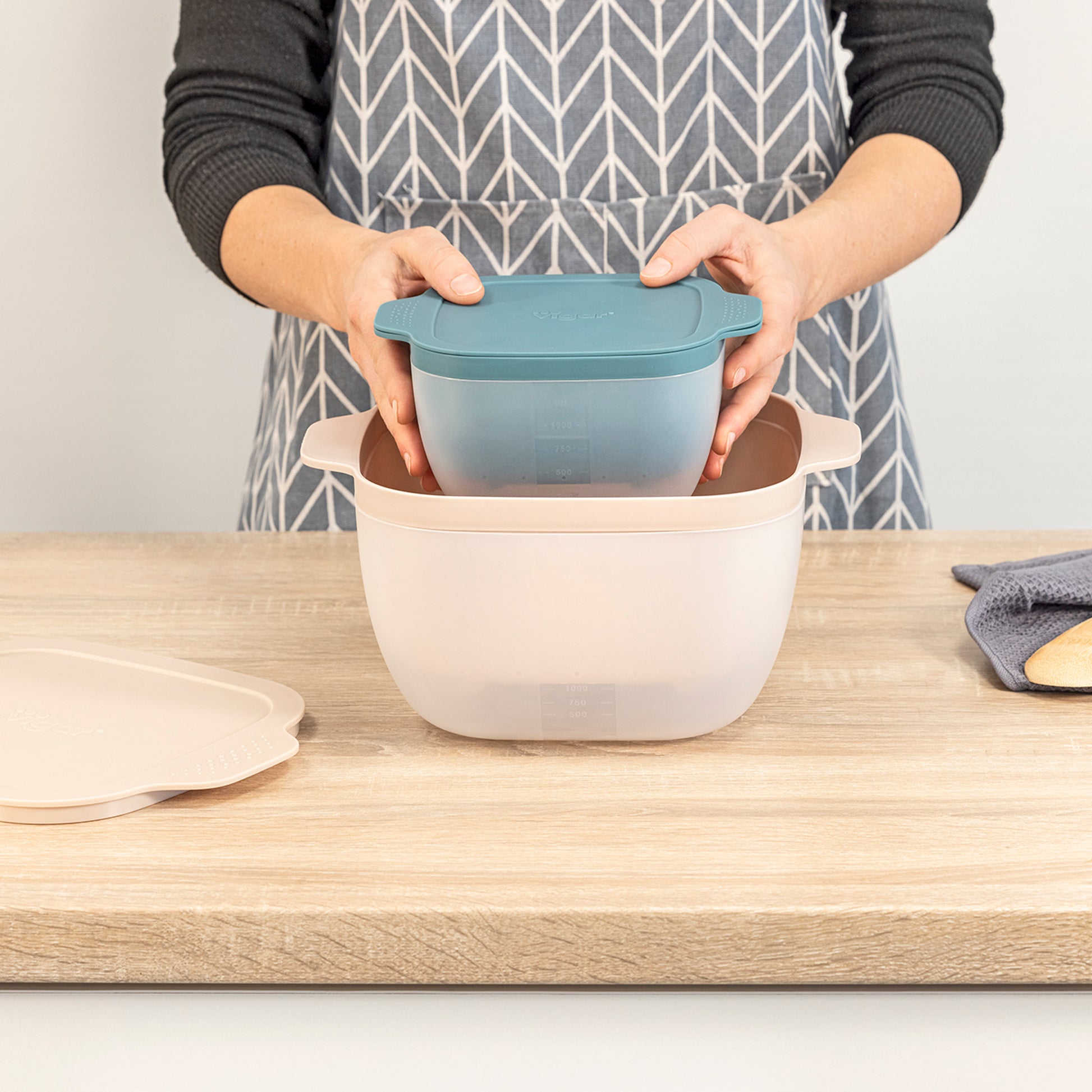 - Tapa con doble función: su perfecto encaje con el recipiente garantiza un óptimo almacenaje y conservación de los alimentos, además de ayudar a escurrir el agua sobrante.