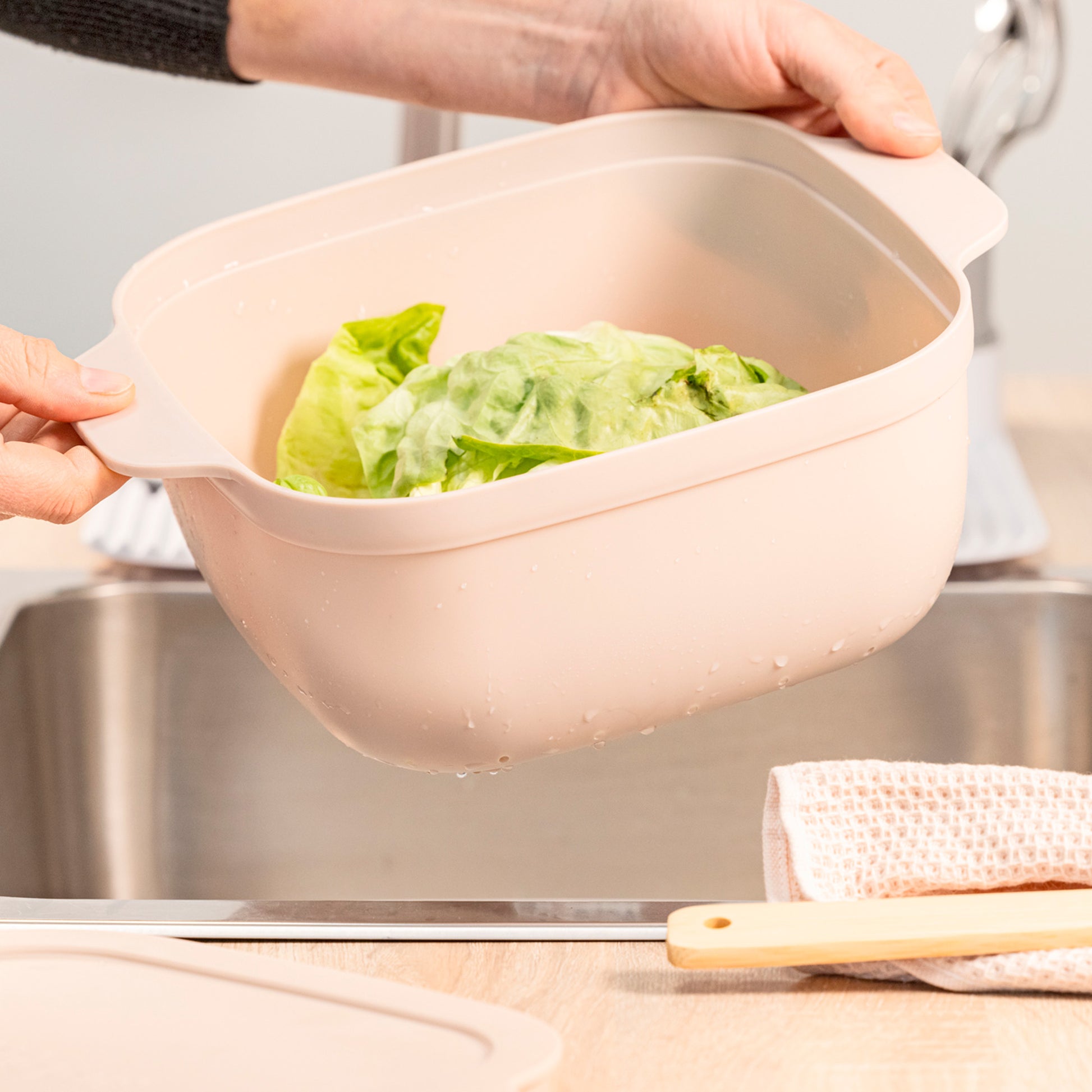 - Escurridor con asas y tacos en la base para evitar el contacto directo con la superficie, asegurando estabilidad y mayor higiene.