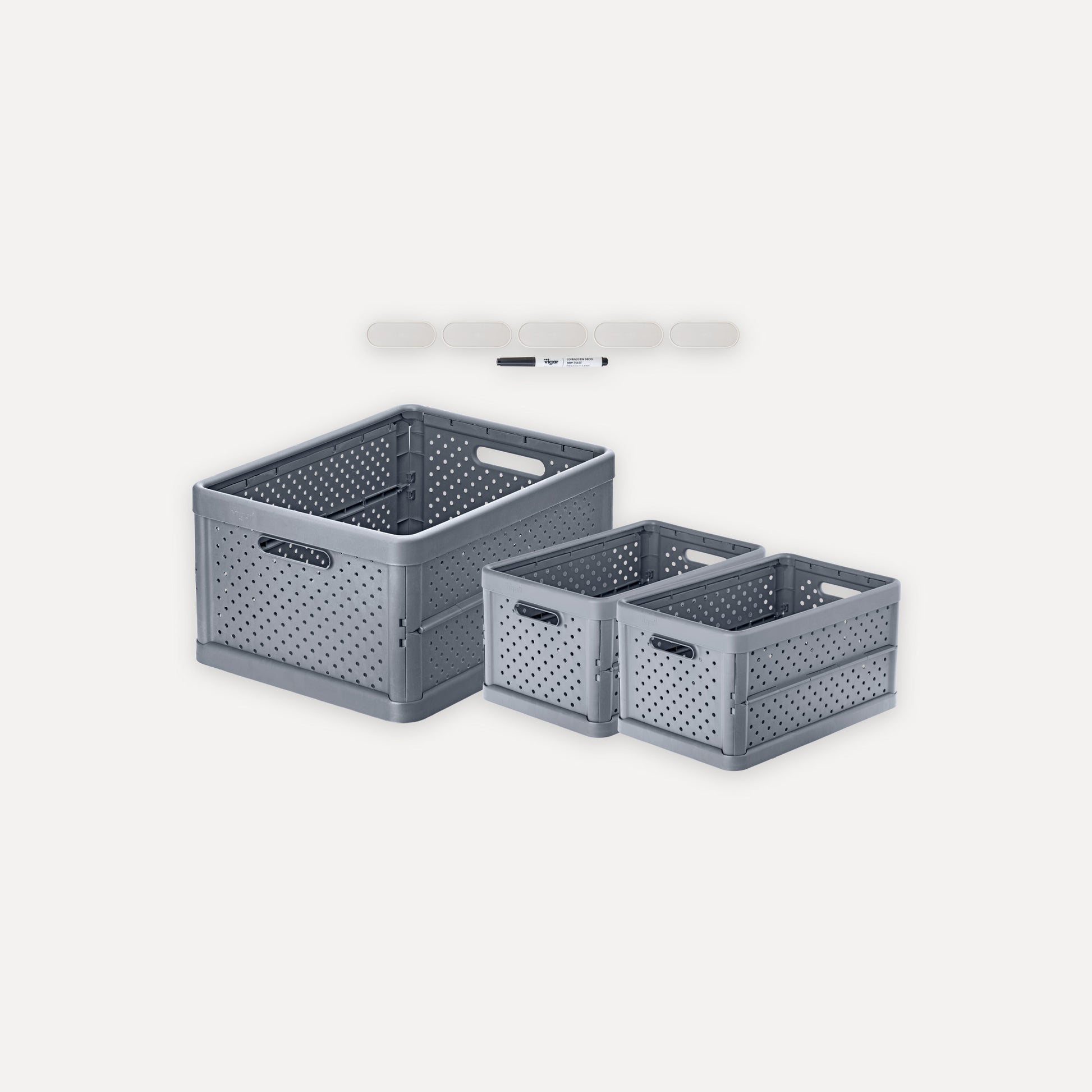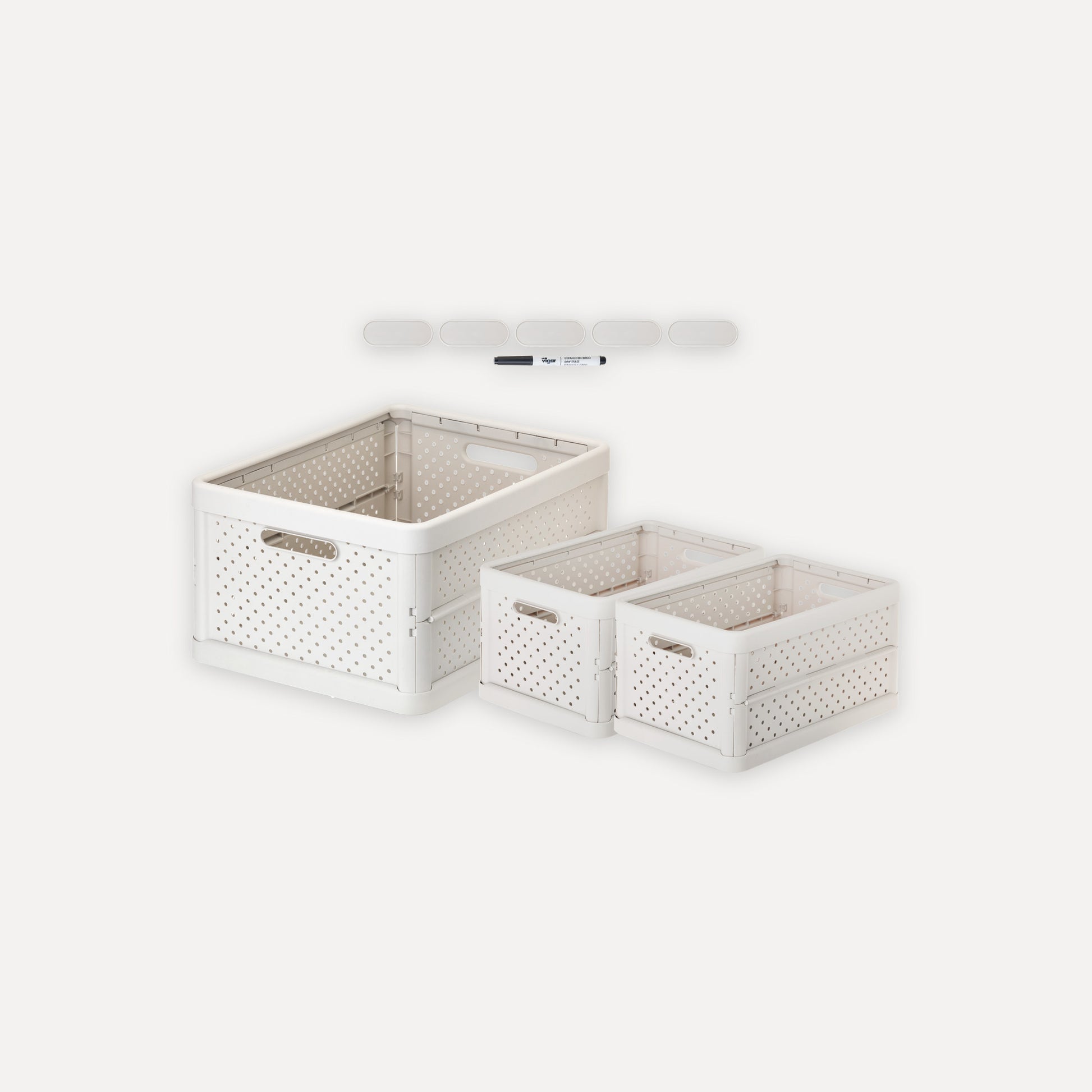 Hechas en plástico resistente y plegable, estas cajas son fáciles de montar y almacenar cuando no están en uso. Las de 32L son ideales para artículos más grandes, mientras que la de 11,3L es perfecta para objetos pequeños. El set de marcadores asegura que todo esté etiquetado y fácil de encontrar, aportando orden y estilo a tu espacio.