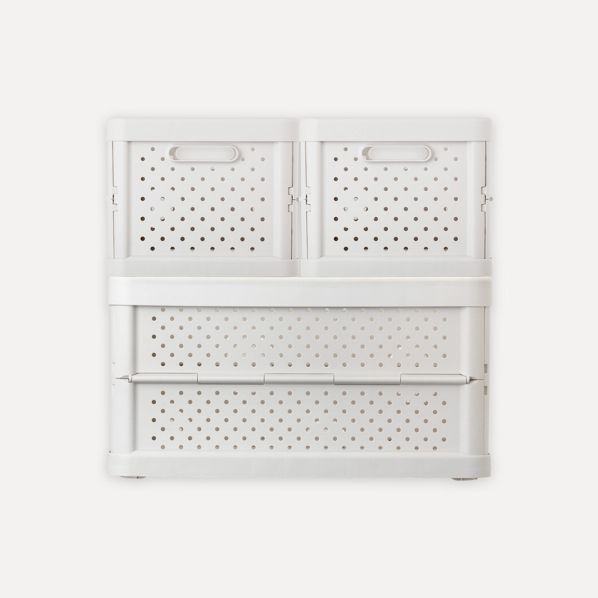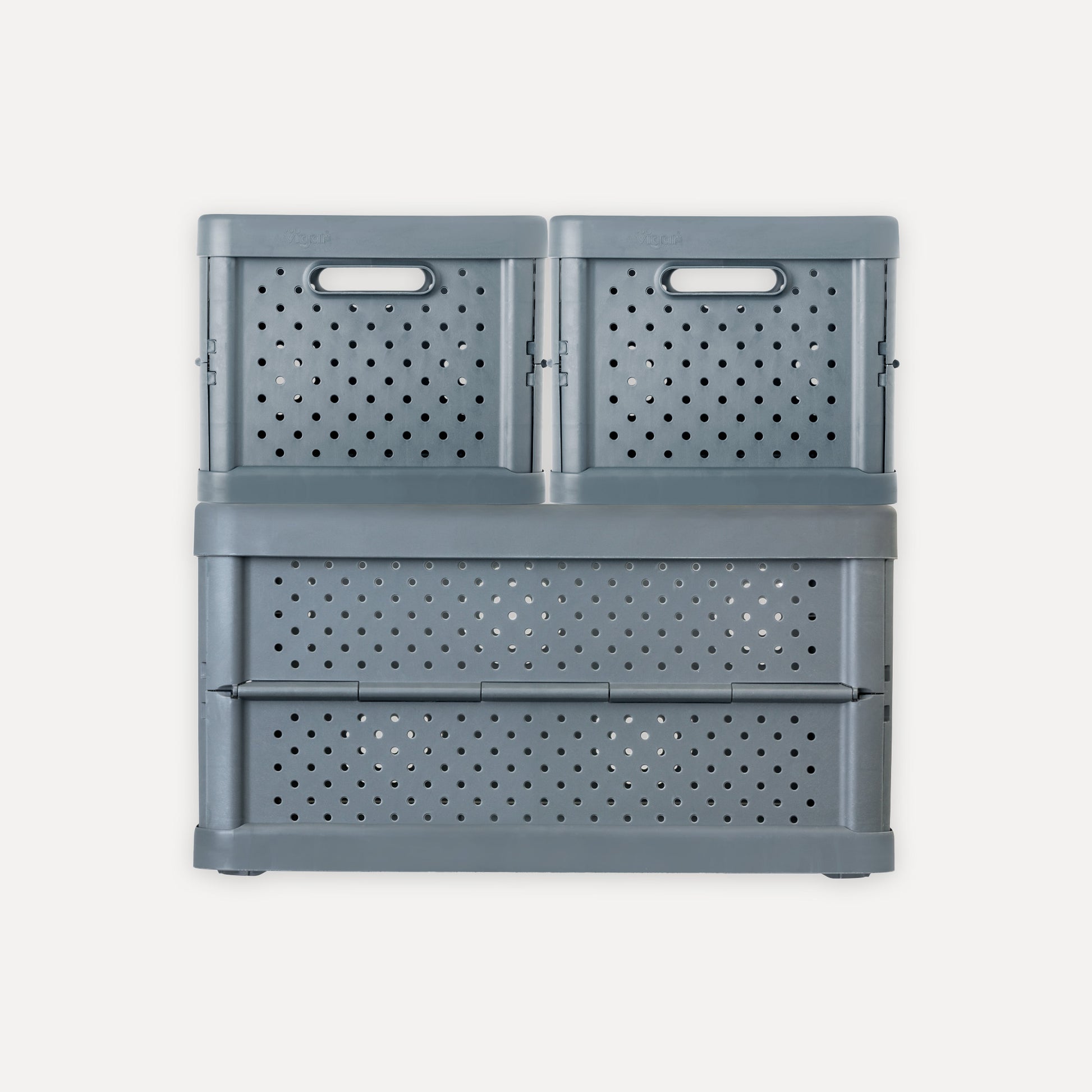 - Set de 3 cajas multiusos plegables con capacidad de 32L (grande) y 11,3L (pequeñas), ideales para guardar, organizar o transportar lo que necesites.