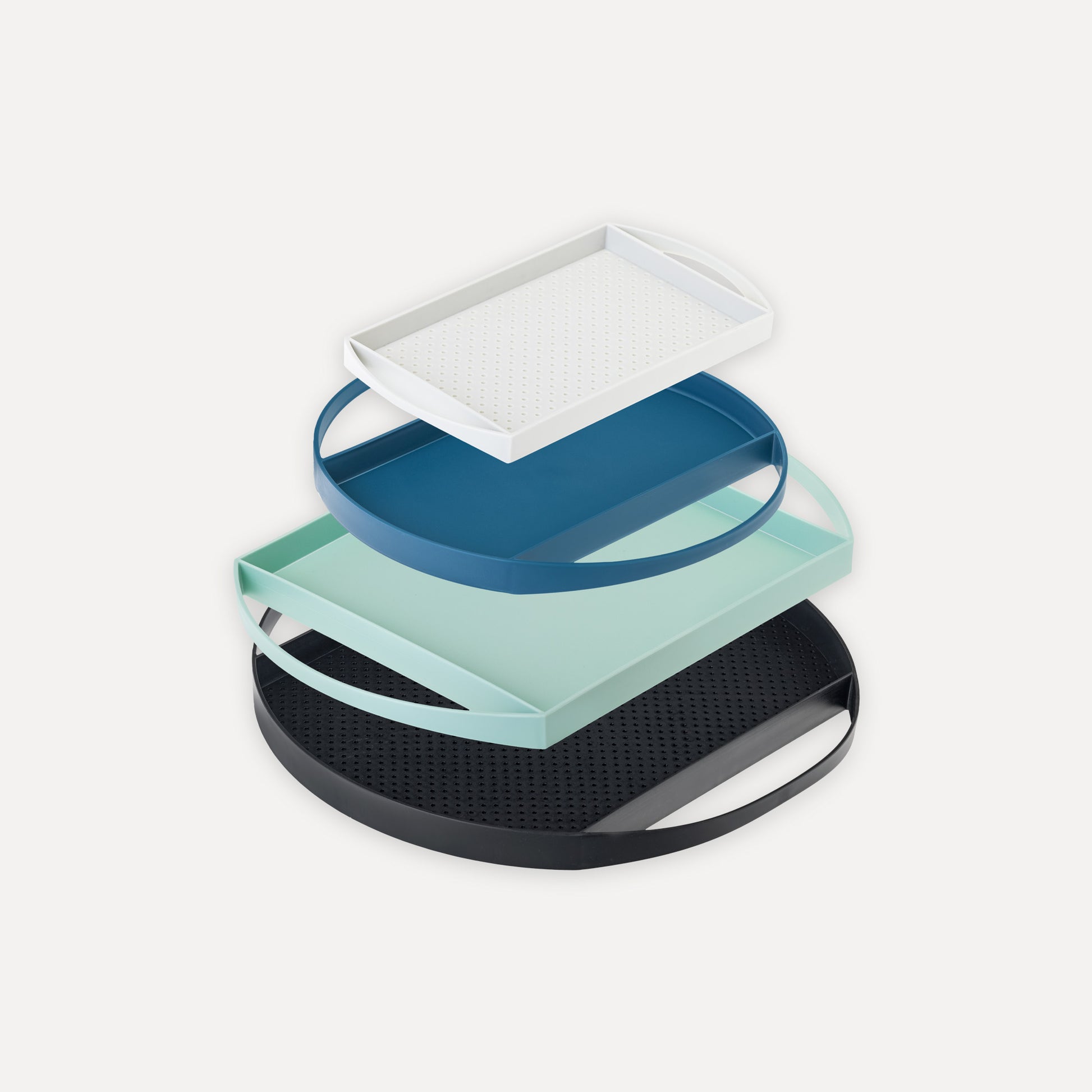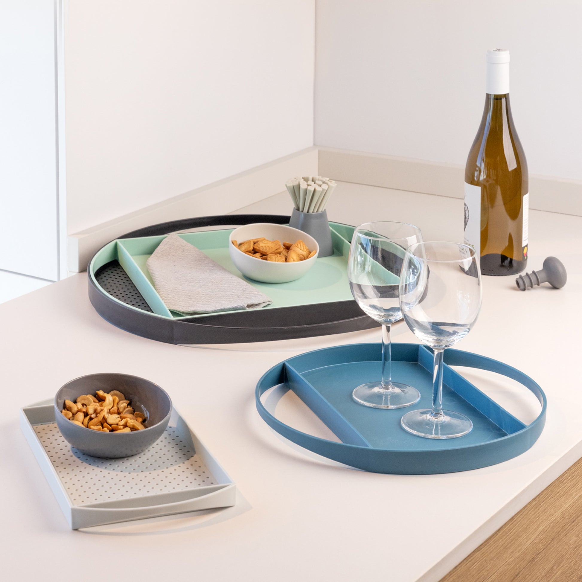 Elaboradas en bioplásticos sostenibles, estas bandejas son resistentes y respetuosas con el entorno. Su diseño apilable y modular facilita el almacenamiento, y su estética natural se adapta perfectamente a cualquier espacio del hogar.