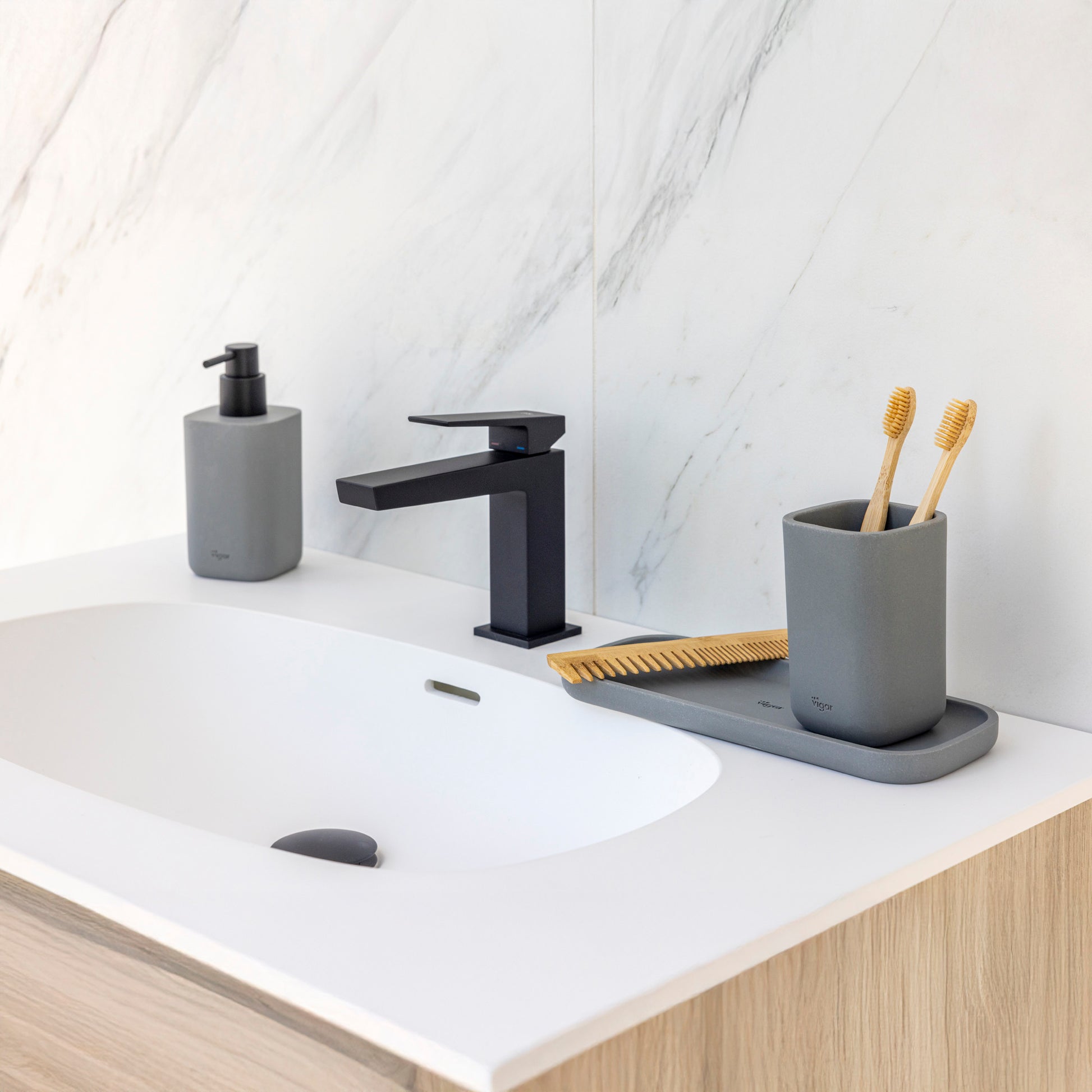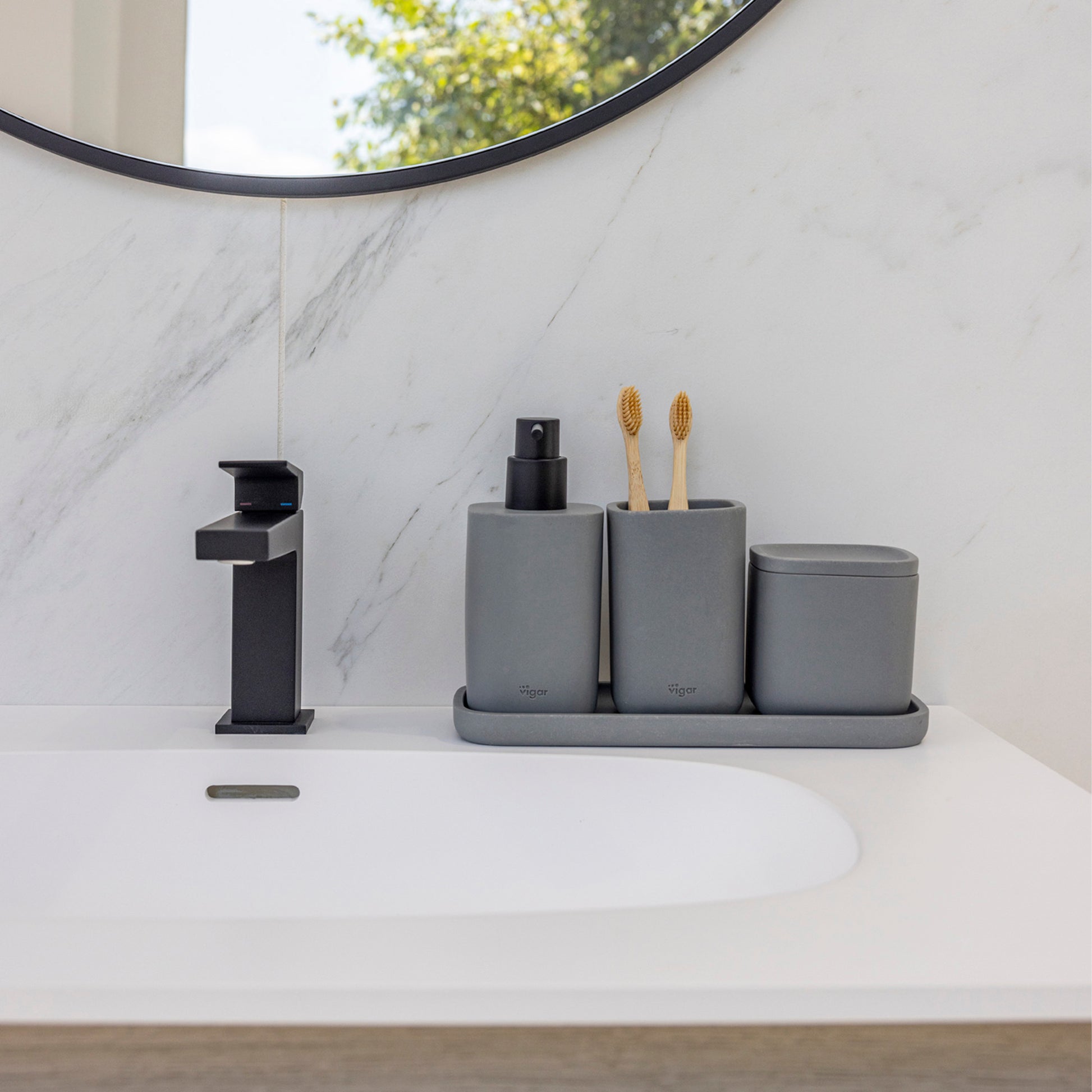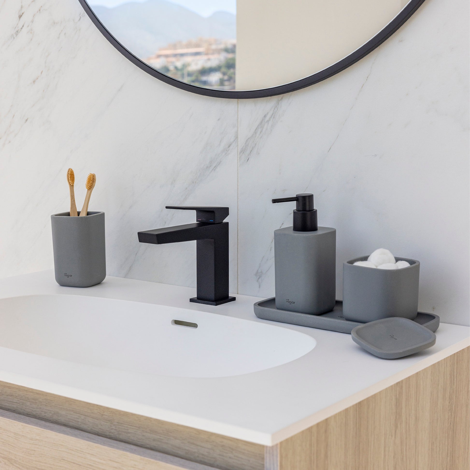- Set 4 piezas de baño compuesto por bote de almacenaje, dispensador de jabón de 270 ml, vaso para cepillos y bandeja organizadora.