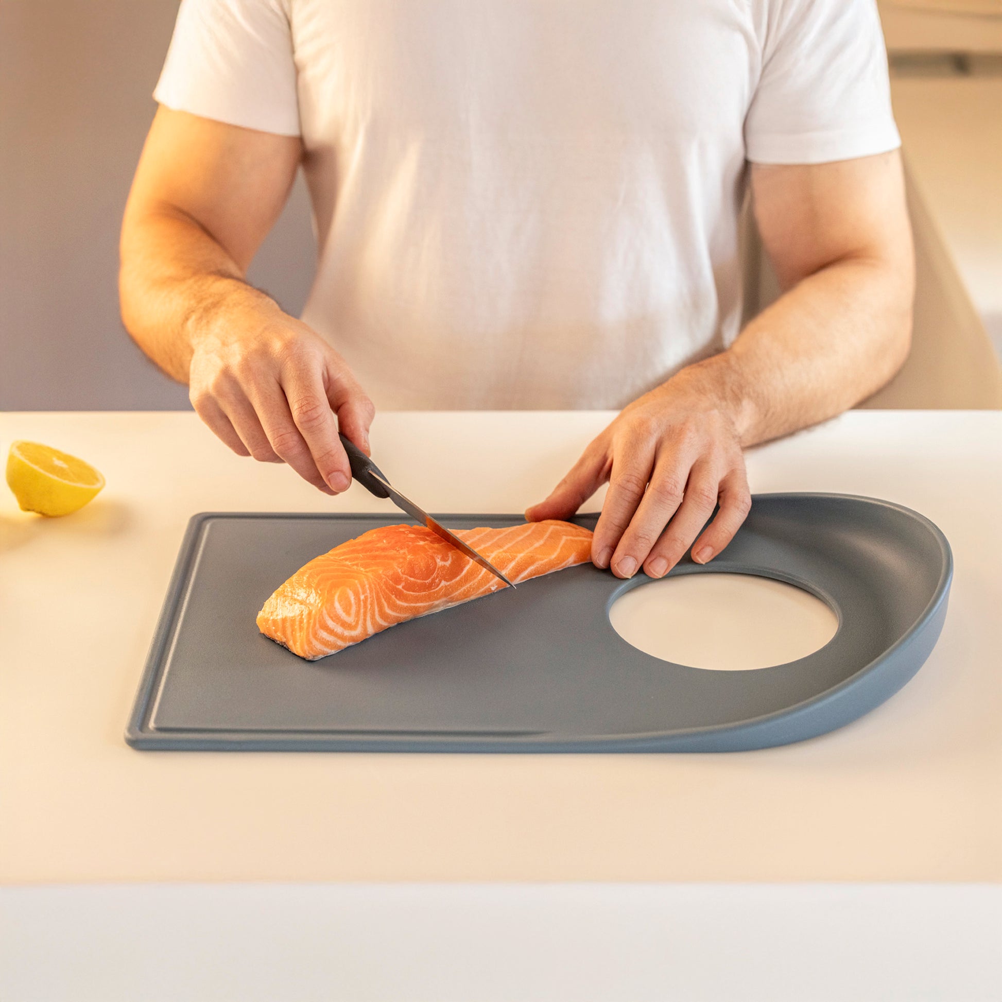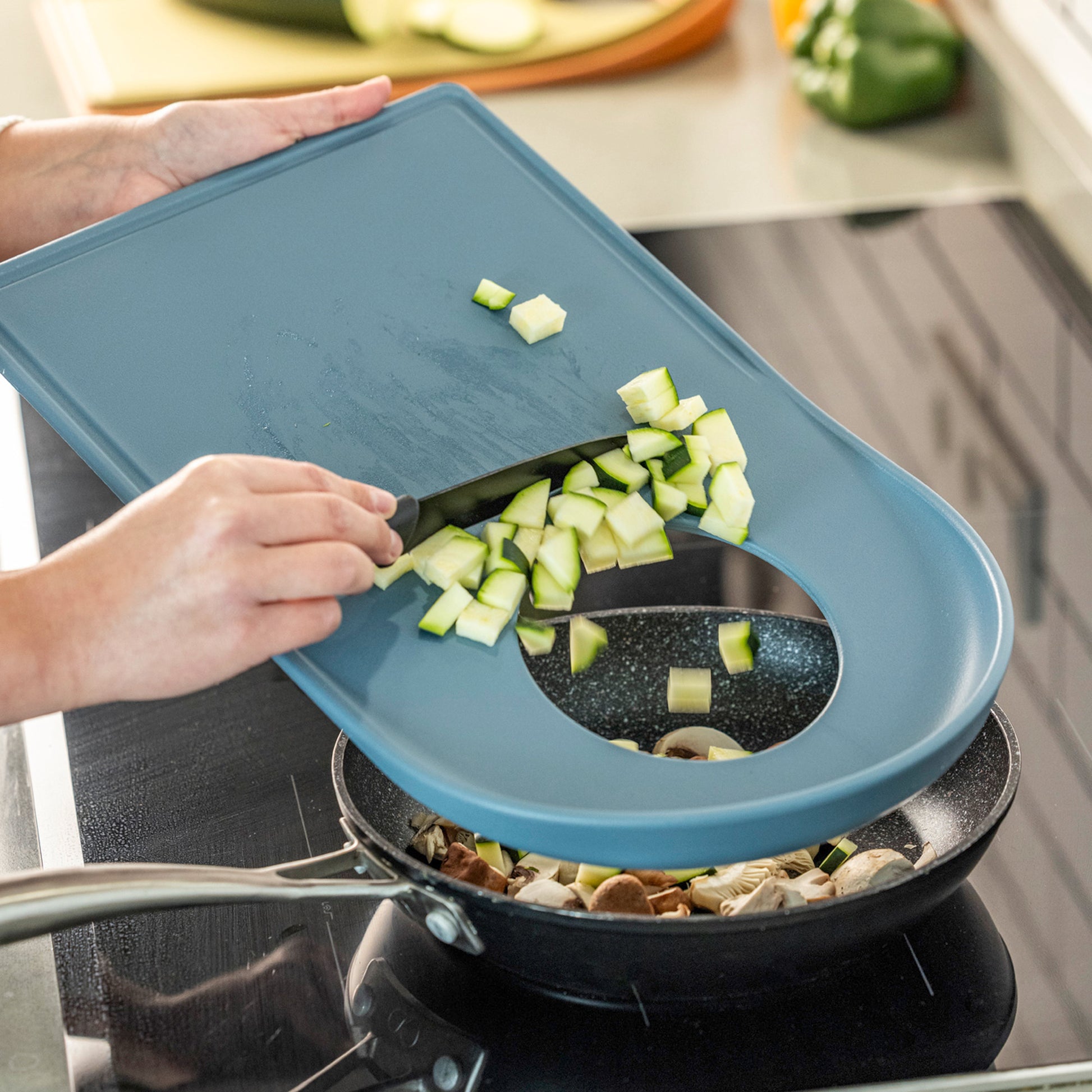 - Tabla de cortar mediana de 25 x 40 cm con orificio funcional para verter alimentos sin derrames y facilitar el transporte.