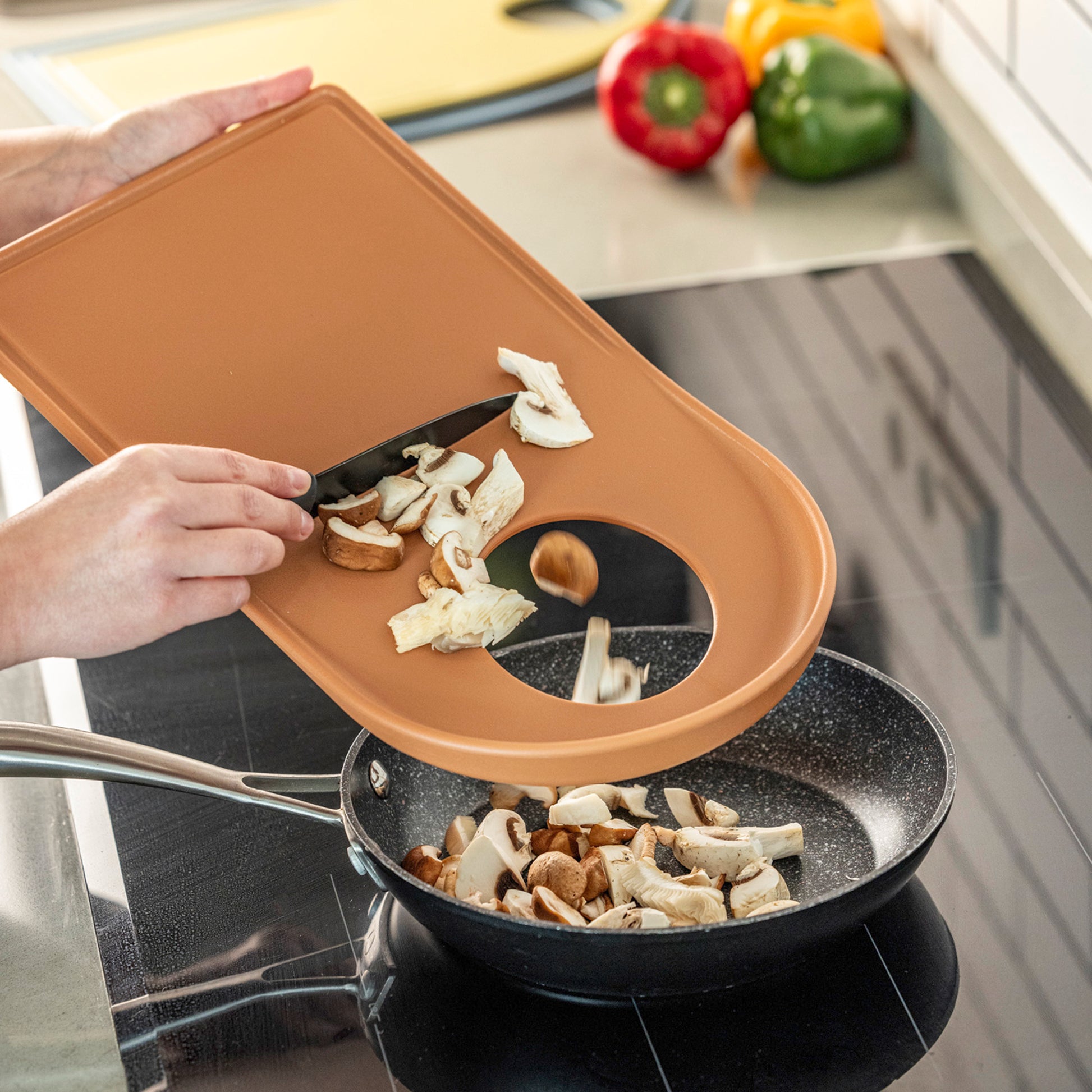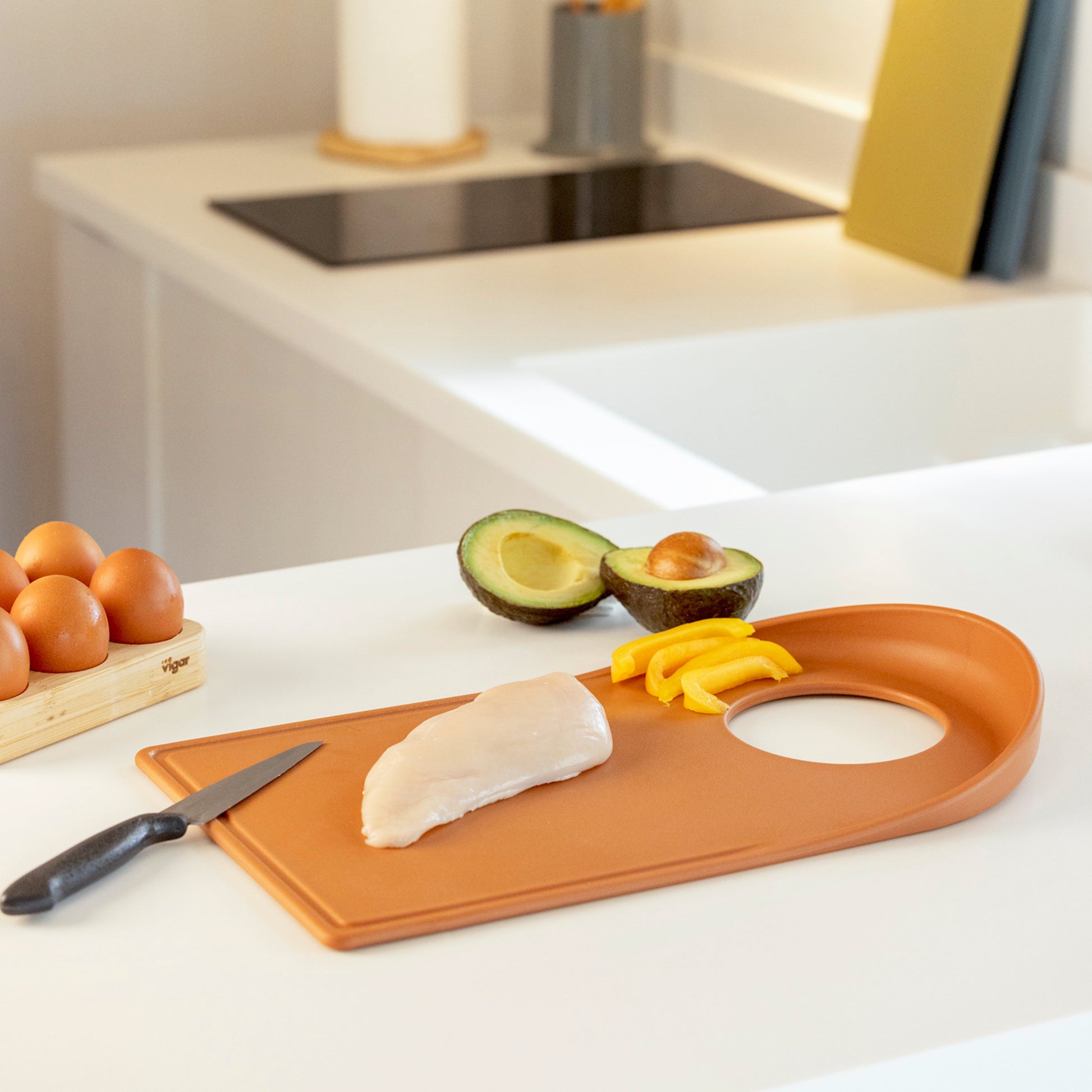 - Tabla de cortar mediana de 22 x 38,5 cm con orificio funcional para verter alimentos sin derrames y facilitar el transporte.