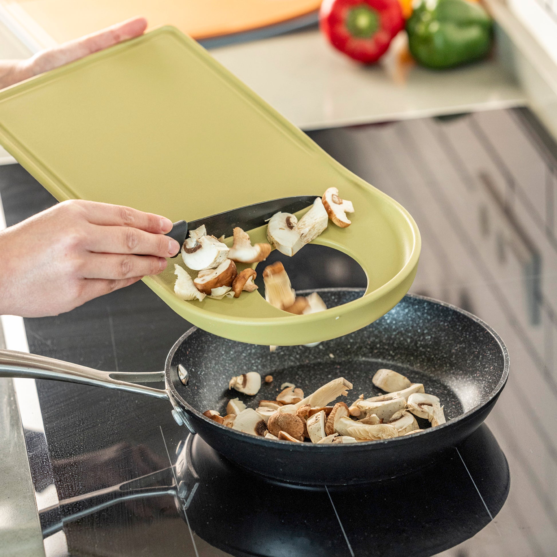 - Tabla de cortar mediana de 19 x 37 cm con orificio funcional para verter alimentos sin derrames y facilitar el transporte.