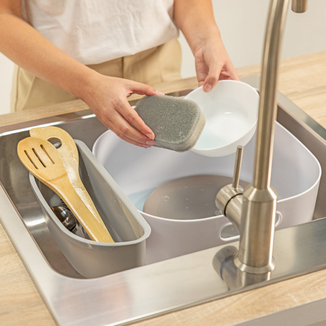 Esponja com bandeja dispensadora de sabão. Pressione a esponja sobre o suporte interior da bandeja...