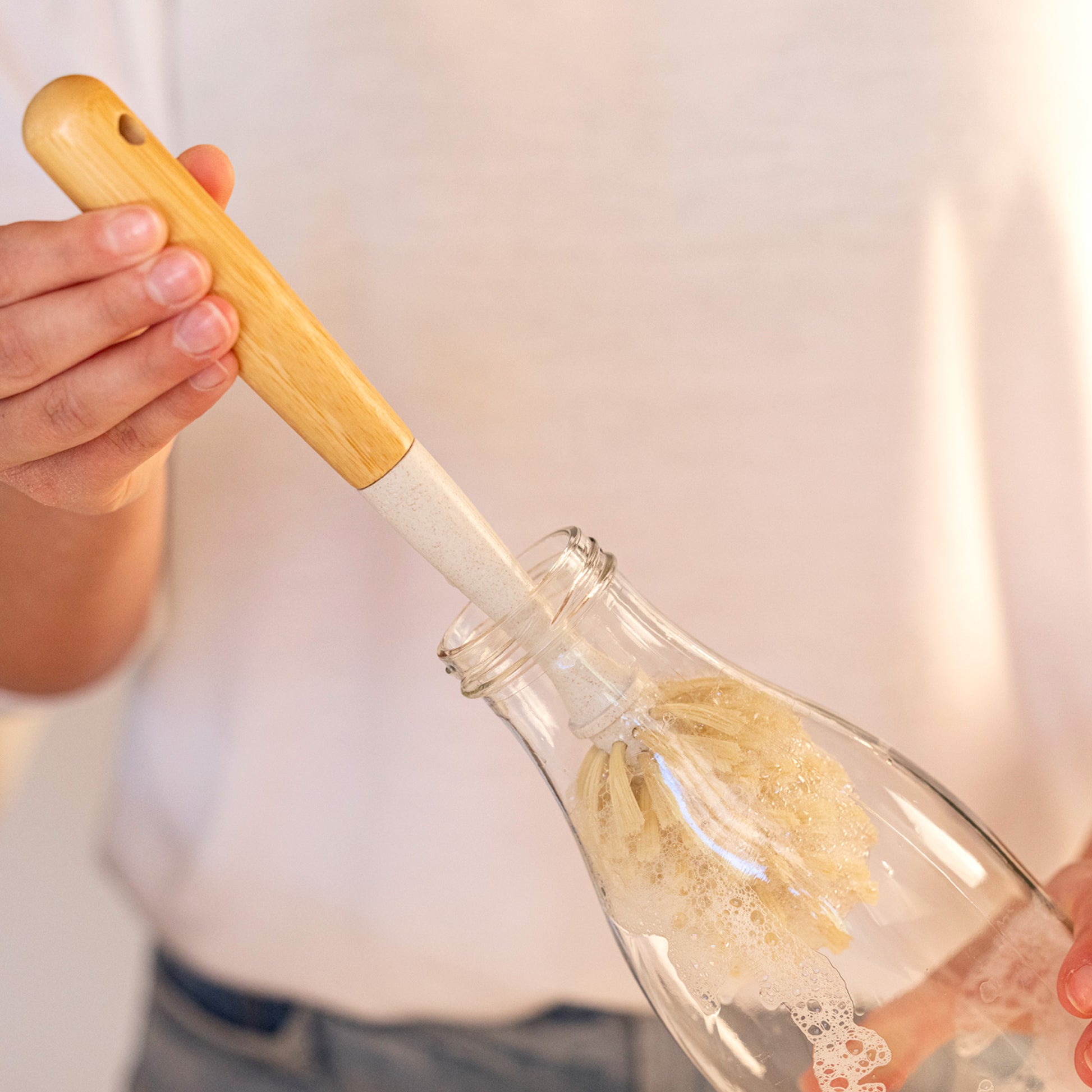 A escova possui cerdas suaves mas resistentes que eliminam a sujidade sem danificar o vidro ou os materiais delicados. O seu cabo de bambu ecológico assegura uma pega confortável e firme, e o seu design duradouro torna-a numa ferramenta essencial para qualquer cozinha. Ideal para garrafas, jarros e copos de todo o tipo.