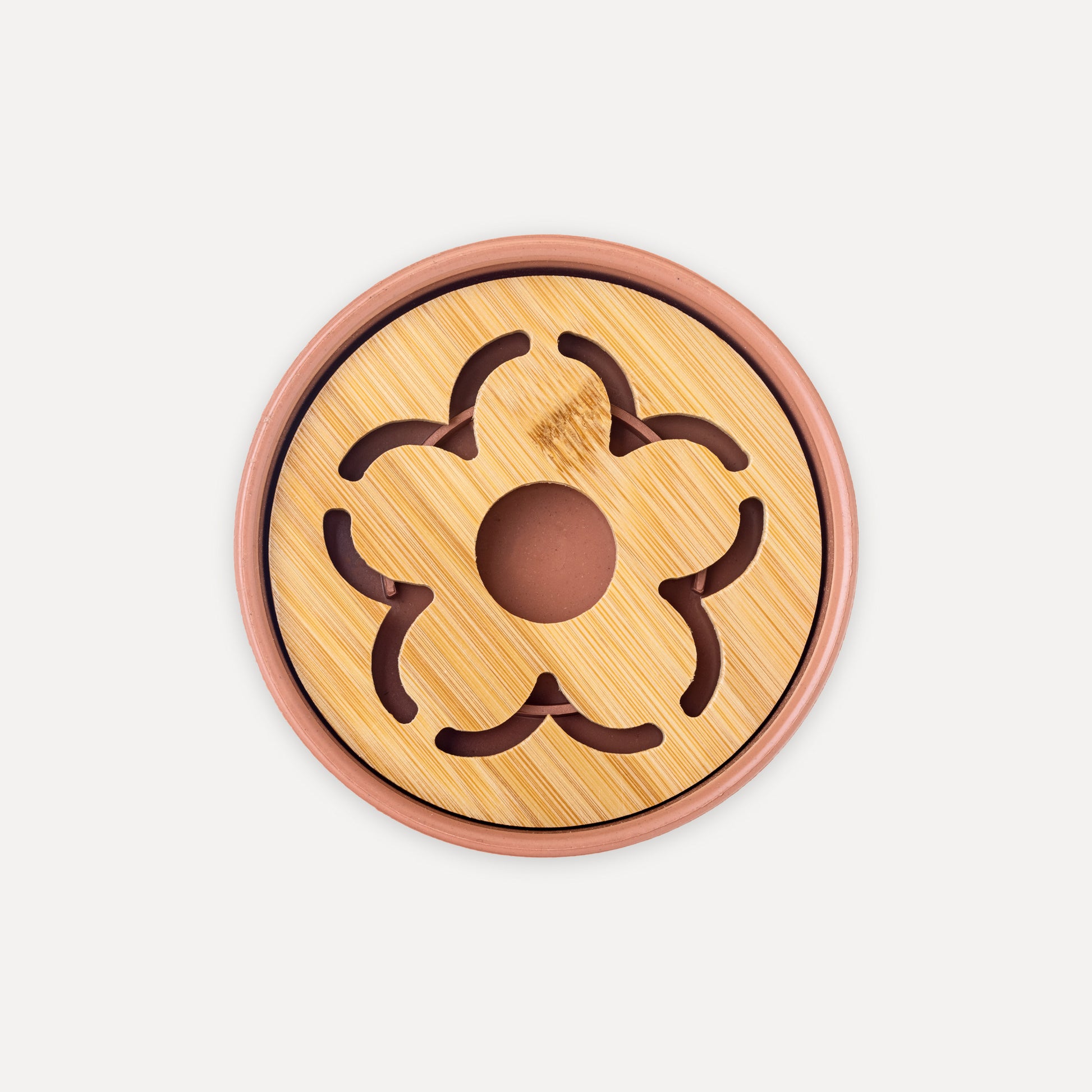 - Bandeja de casca de arroz com suporte interior de bambu, desenhada para combinar funcionalidade e estilo.