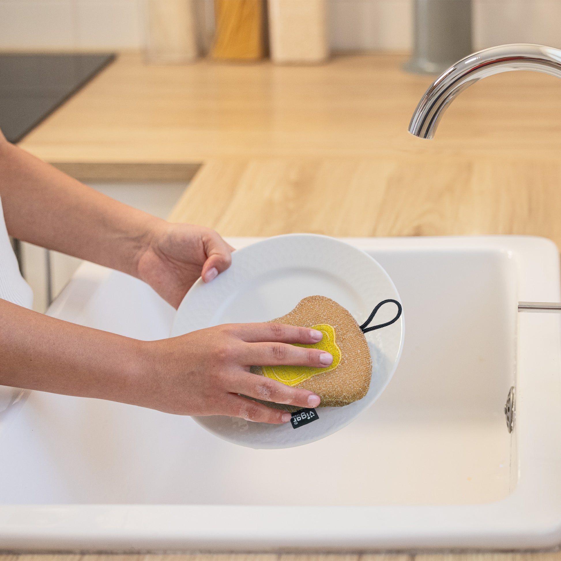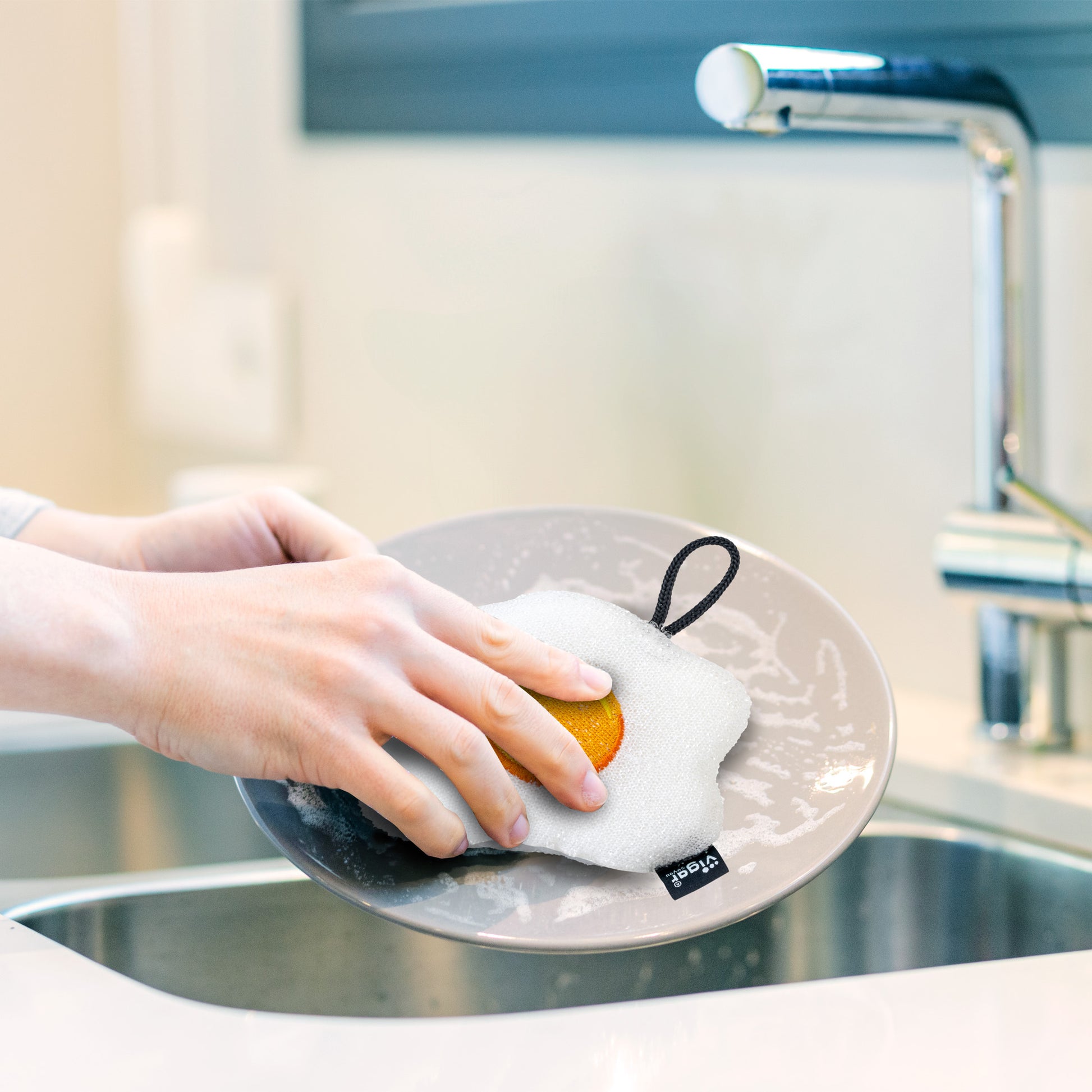 - Cada esponja cuenta con colgador para facilitar el secado y mantener todo ordenado.