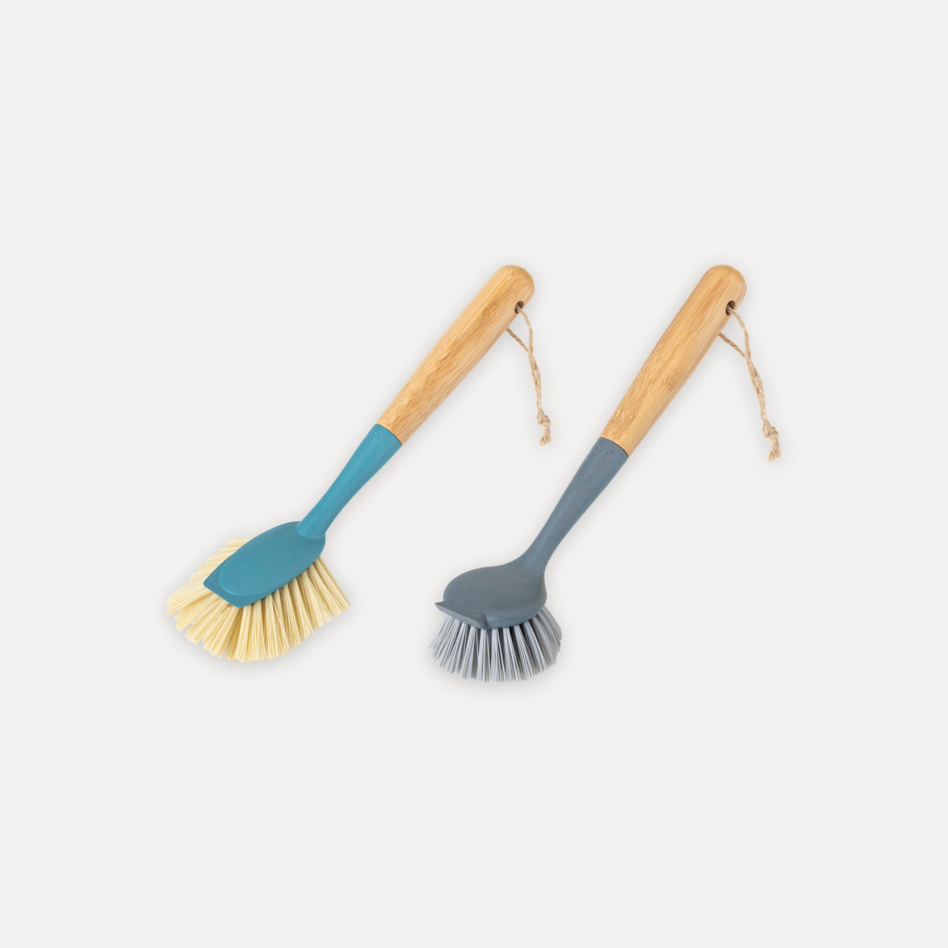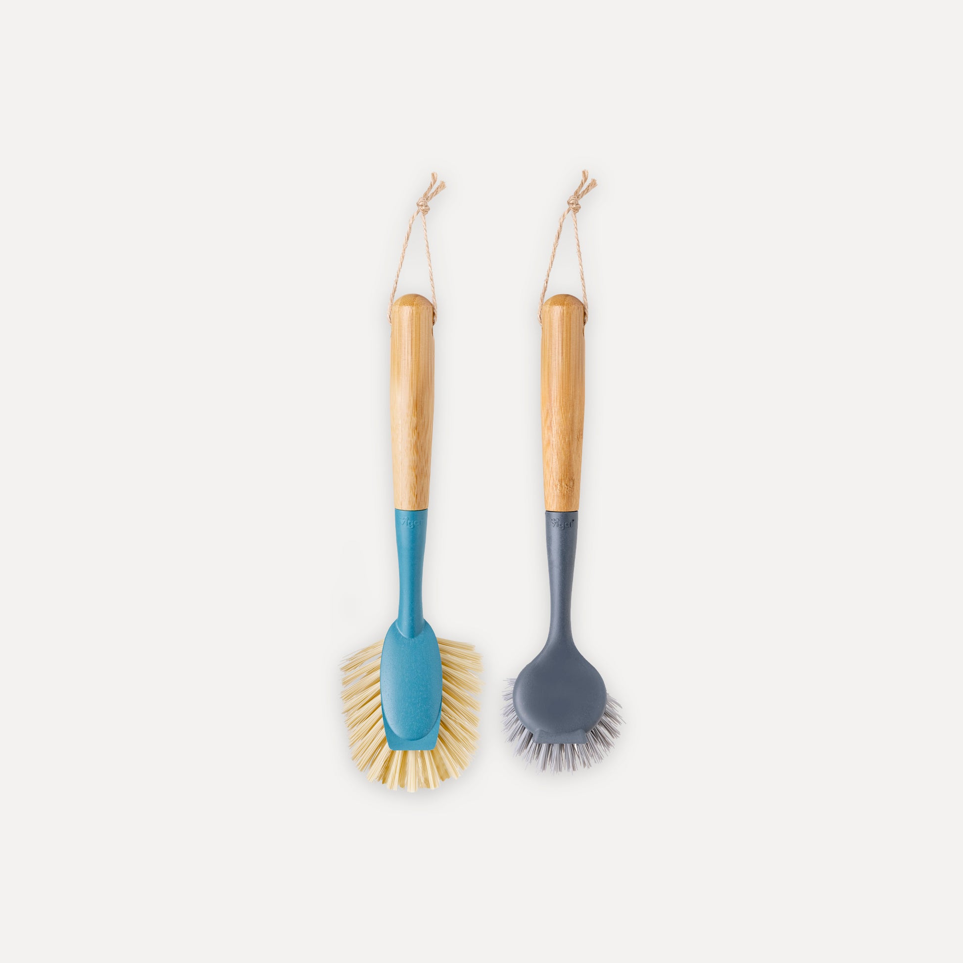 - Pack de 2 cepillos lavaplatos multiusos con diseño ergonómico: uno ovalado y otro redondo, para adaptarse a cada rincón.