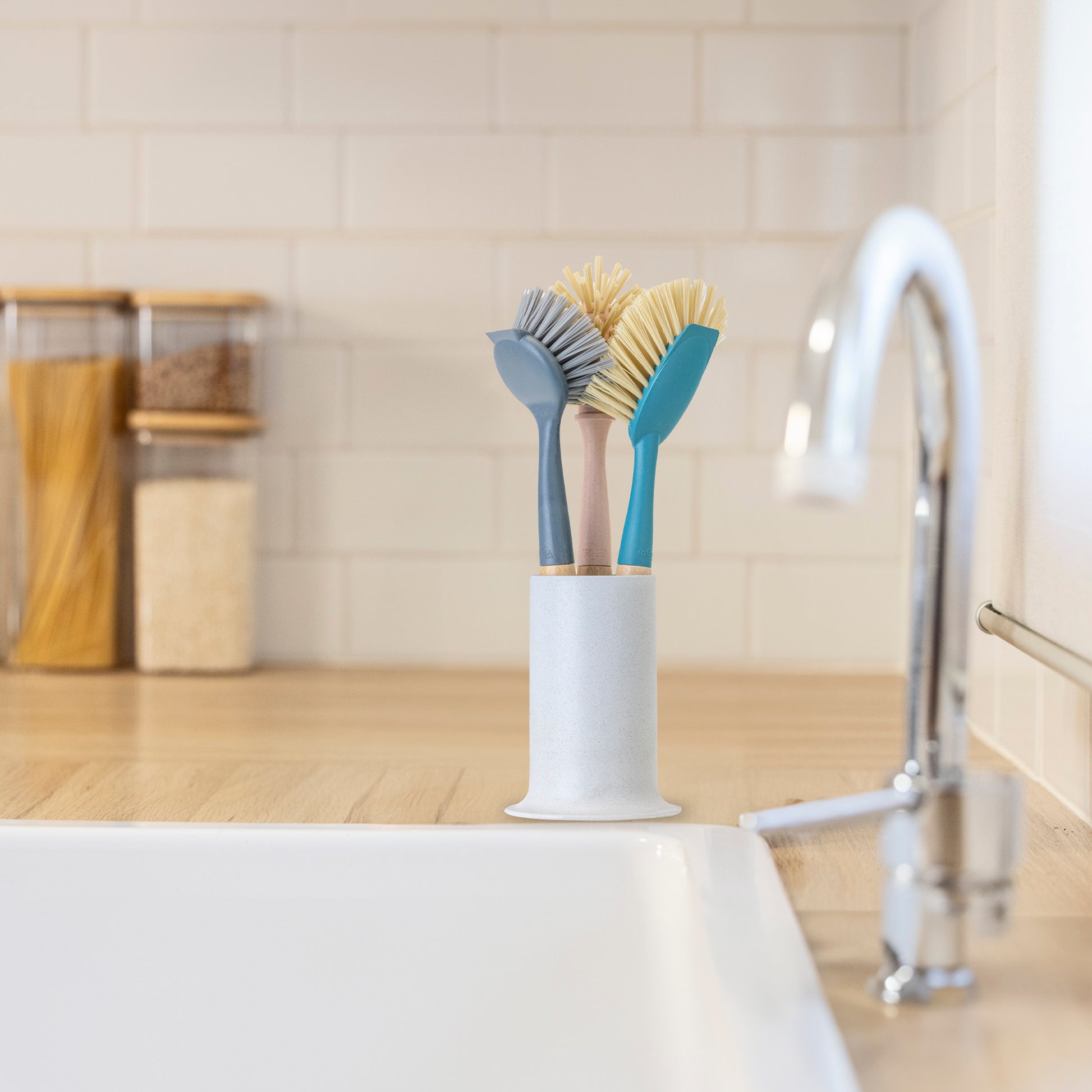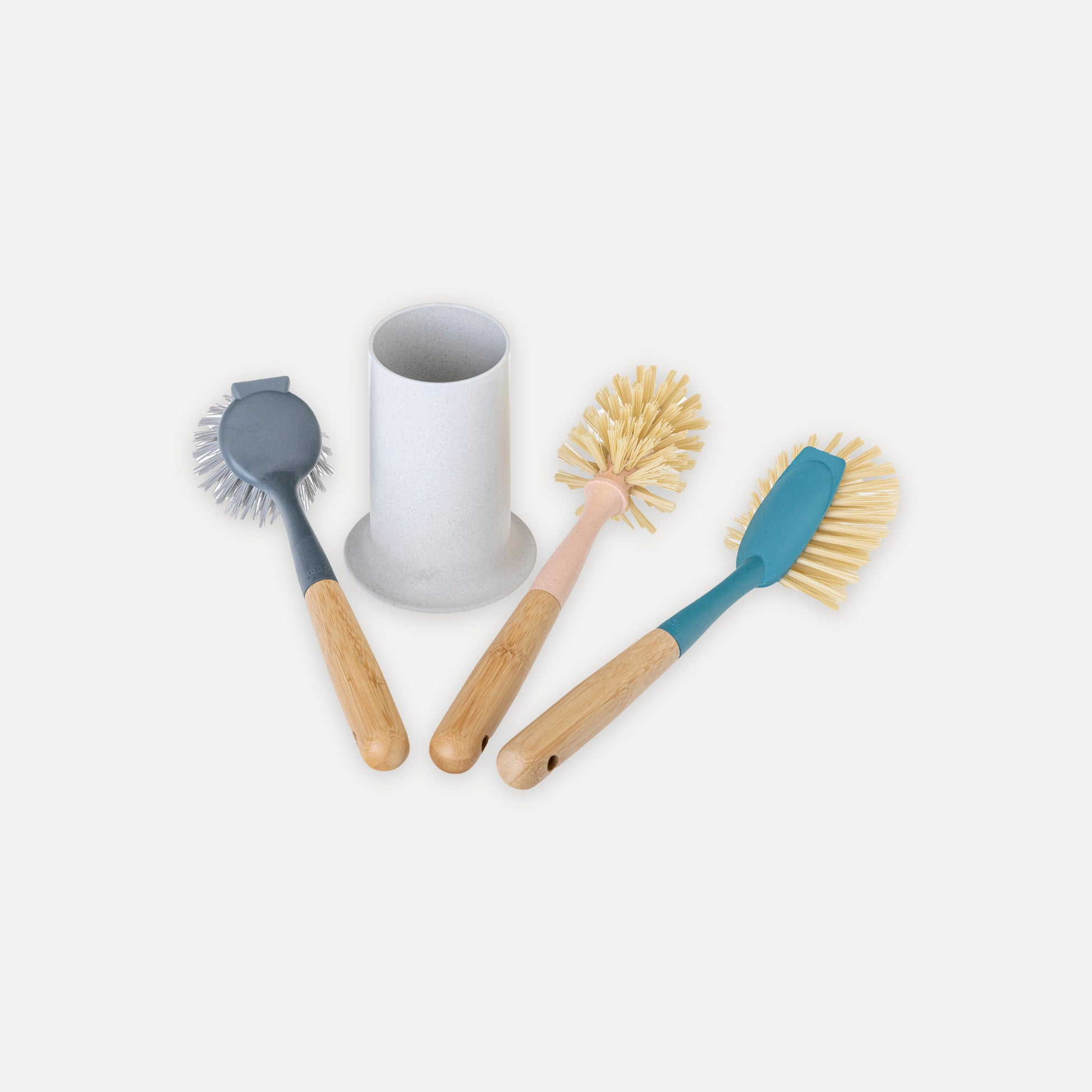 - Convierte la limpieza en un ritual de estilo con el set Zeroline: 3 cepillos de bambú con diseño funcional y bote organizador que luce como un jarrón decorativo.