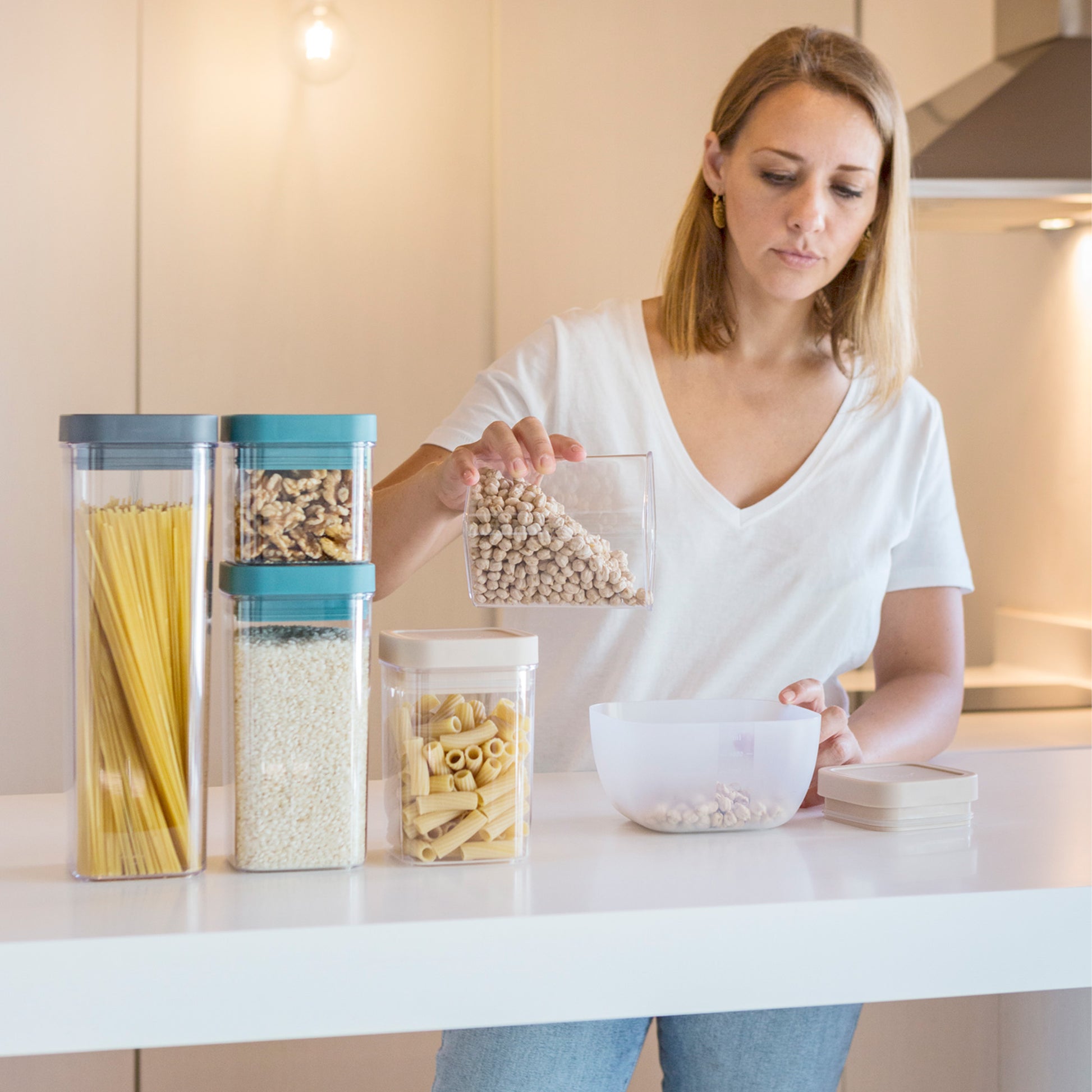 - Projetados especialmente para oferecer um ajuste vertical, permitindo guardar os recipientes na posição vertical para um armazenamento organizado.